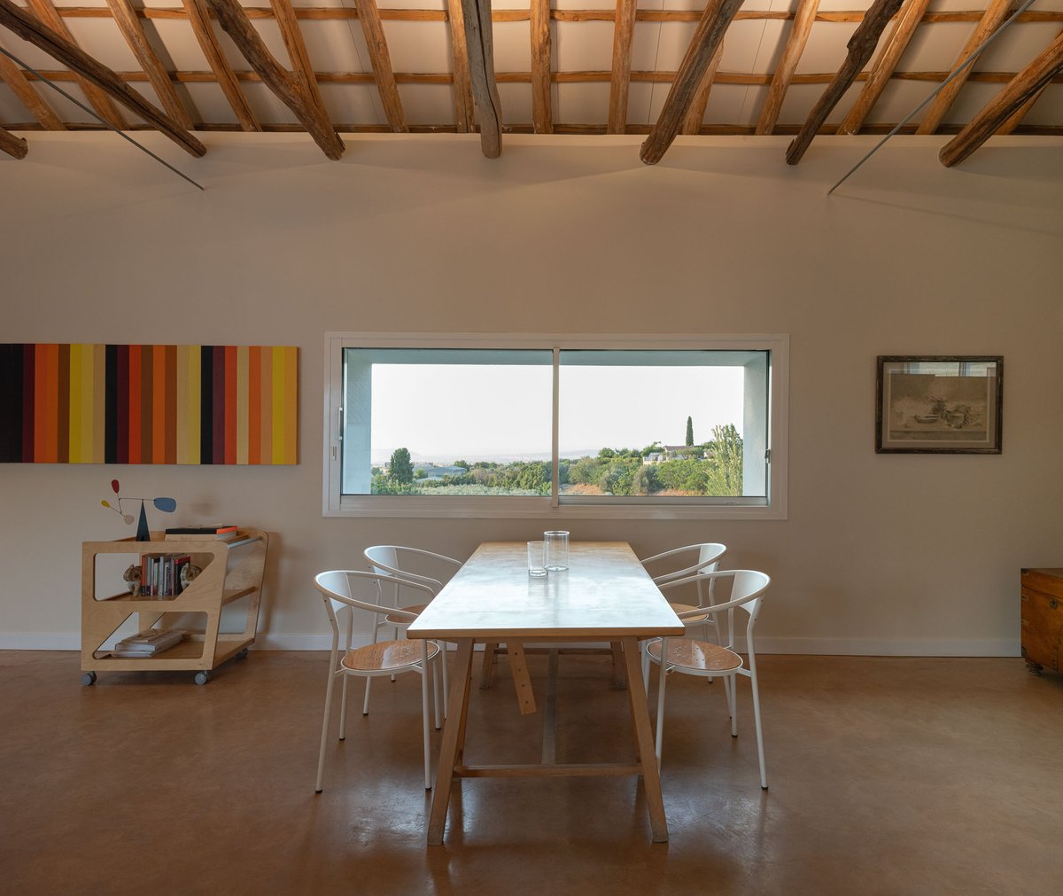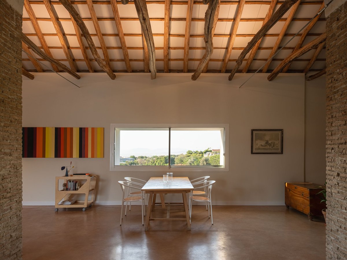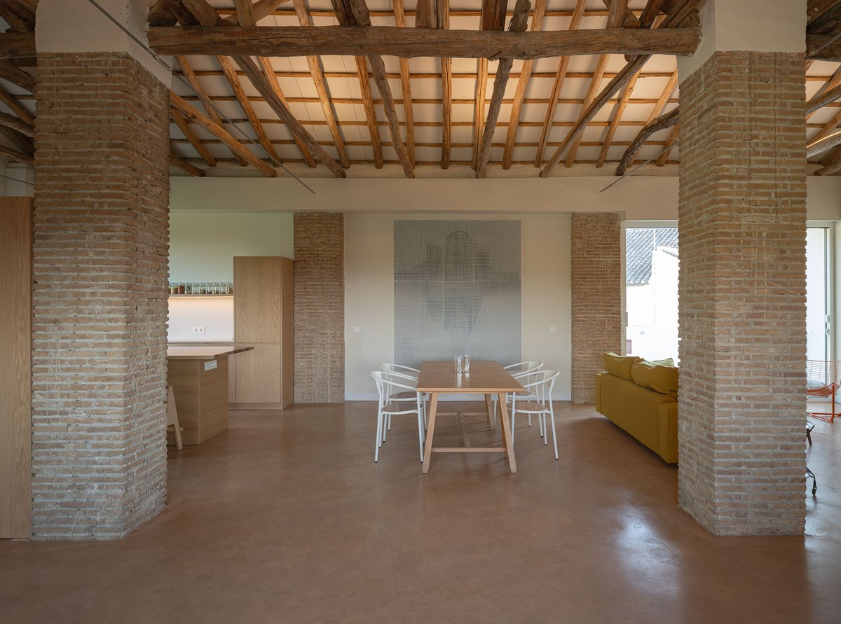 La zona abierta del espacio habitado se plantea como un espacio único que ocupa tres crujías que sugieren tres miradas hacia el exterior. Al sur, hacia el patio del corral; al este incorpora a la cocina el jardín de bojes y catalpas, y al norte el área de trabajo mira el paisaje de la Vega de Granada y la Sierra de Huétor Santillán. La vivienda incorpora en las dos crujías restantes dos dormitaros y dos baños.