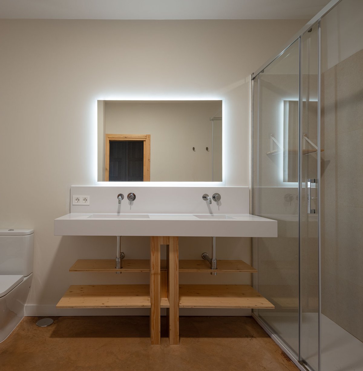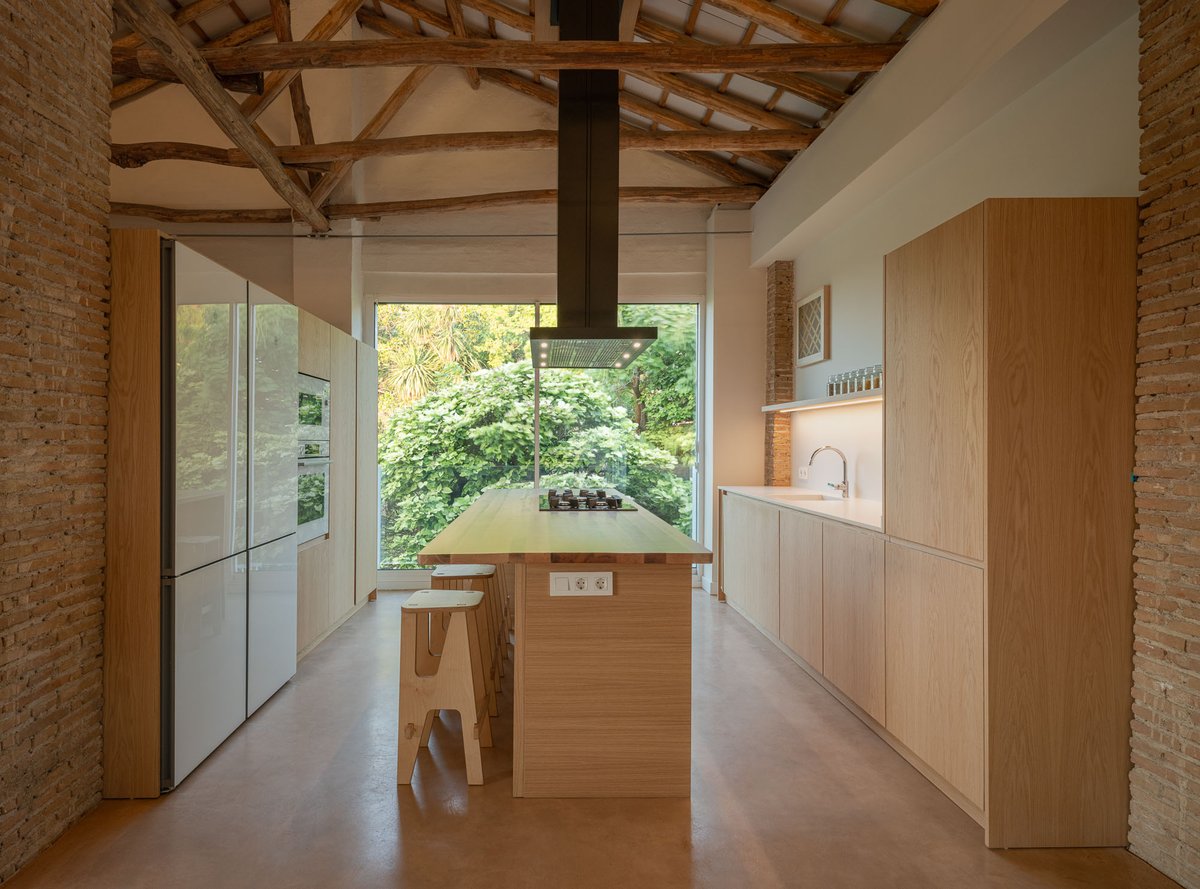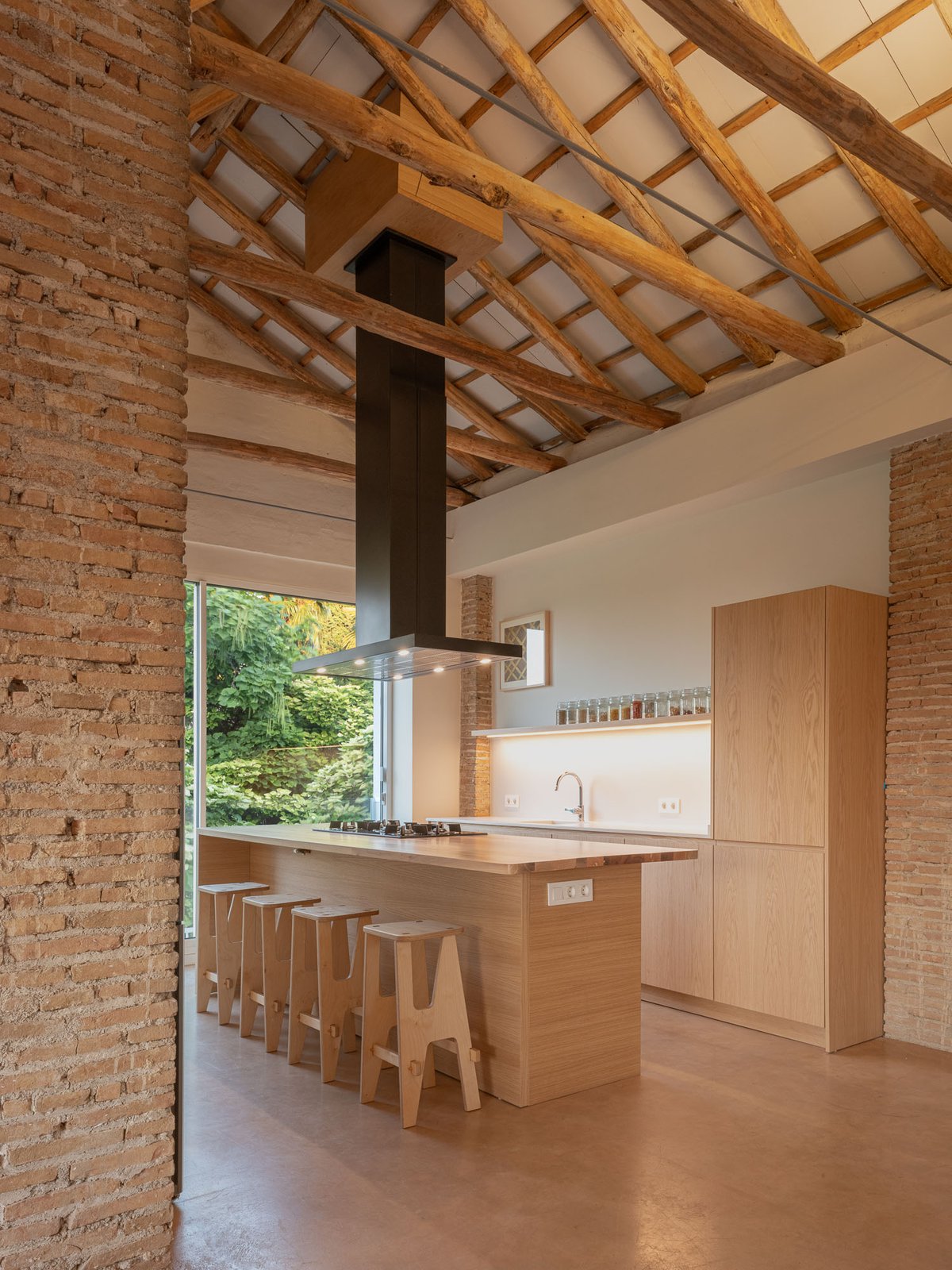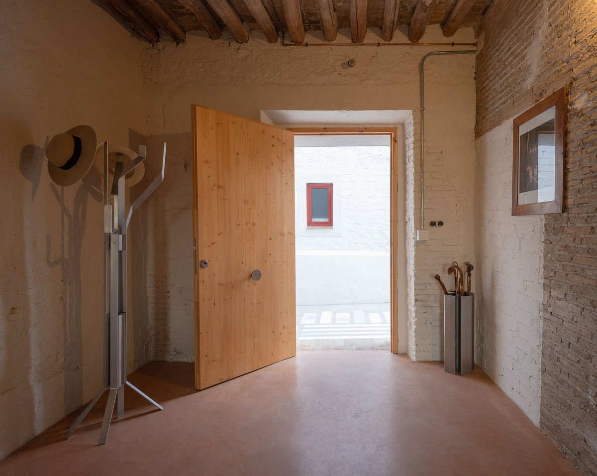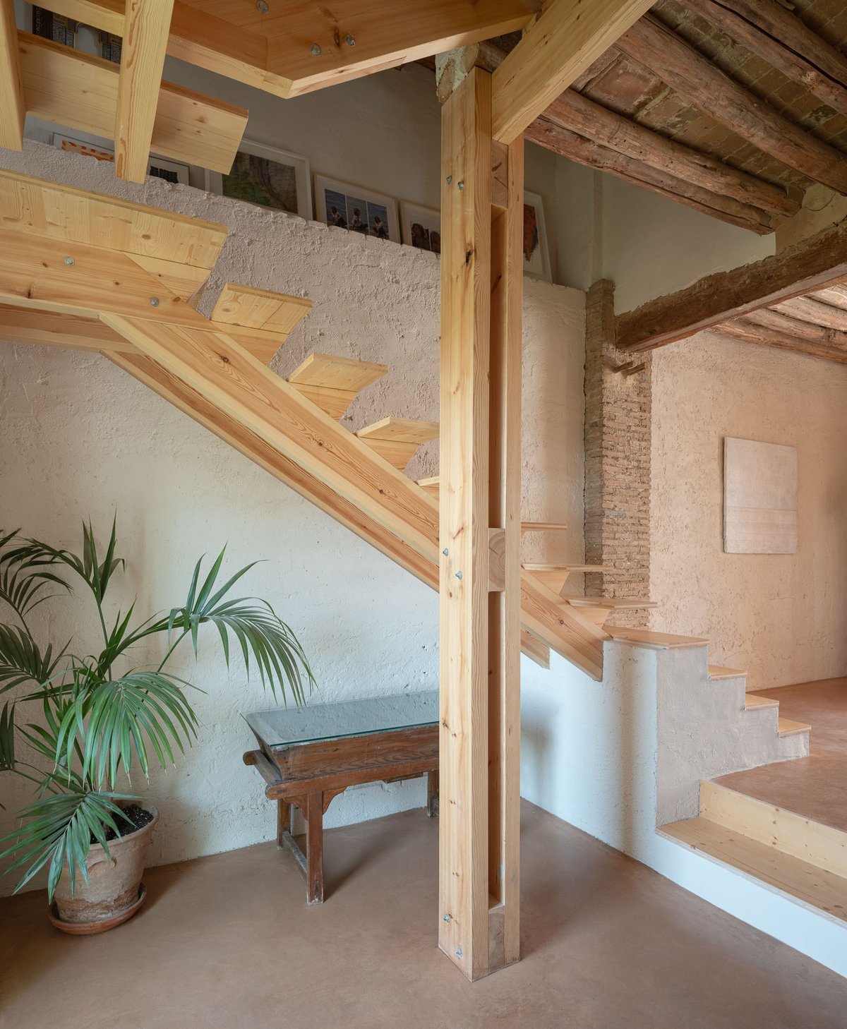 Los materiales empleados son pocos, las vigas usadas como costeros de apeo han sido recicladas para resolver la escalera y el mobiliario de baño, complementados con tableros tricapa de encofrado. Las puertas han sido construidas con los mismos materiales. El ladrillo visto permanece y los revestimiento se resanan donde es imprescindible. El suelo radiante y refrigerante ha sido recubierto con hormigón coloreado en tono arcilloso. Los restos de un viejo nogal cortado hace muchos años han servido para hacer la encimera de la isla de la cocina.