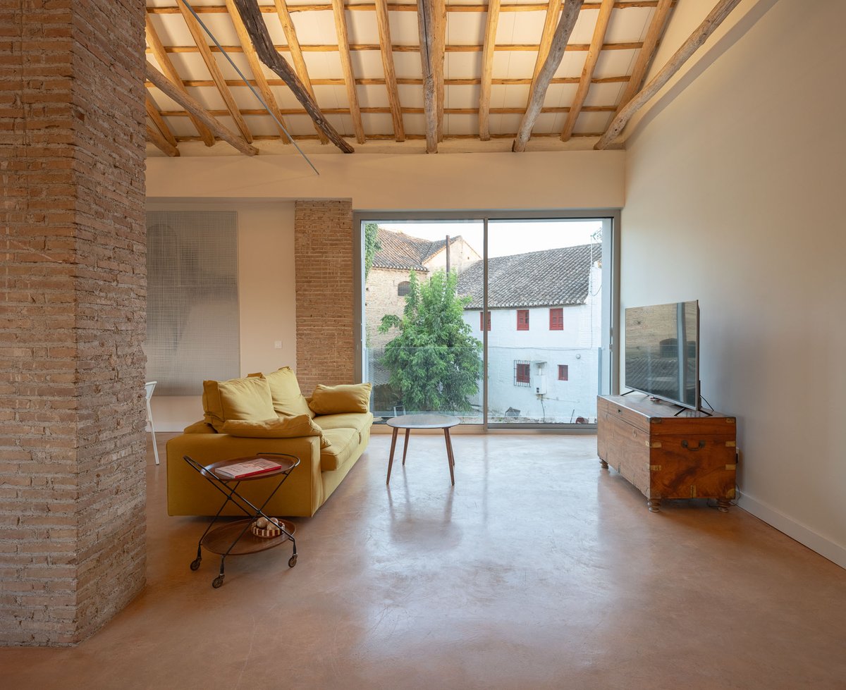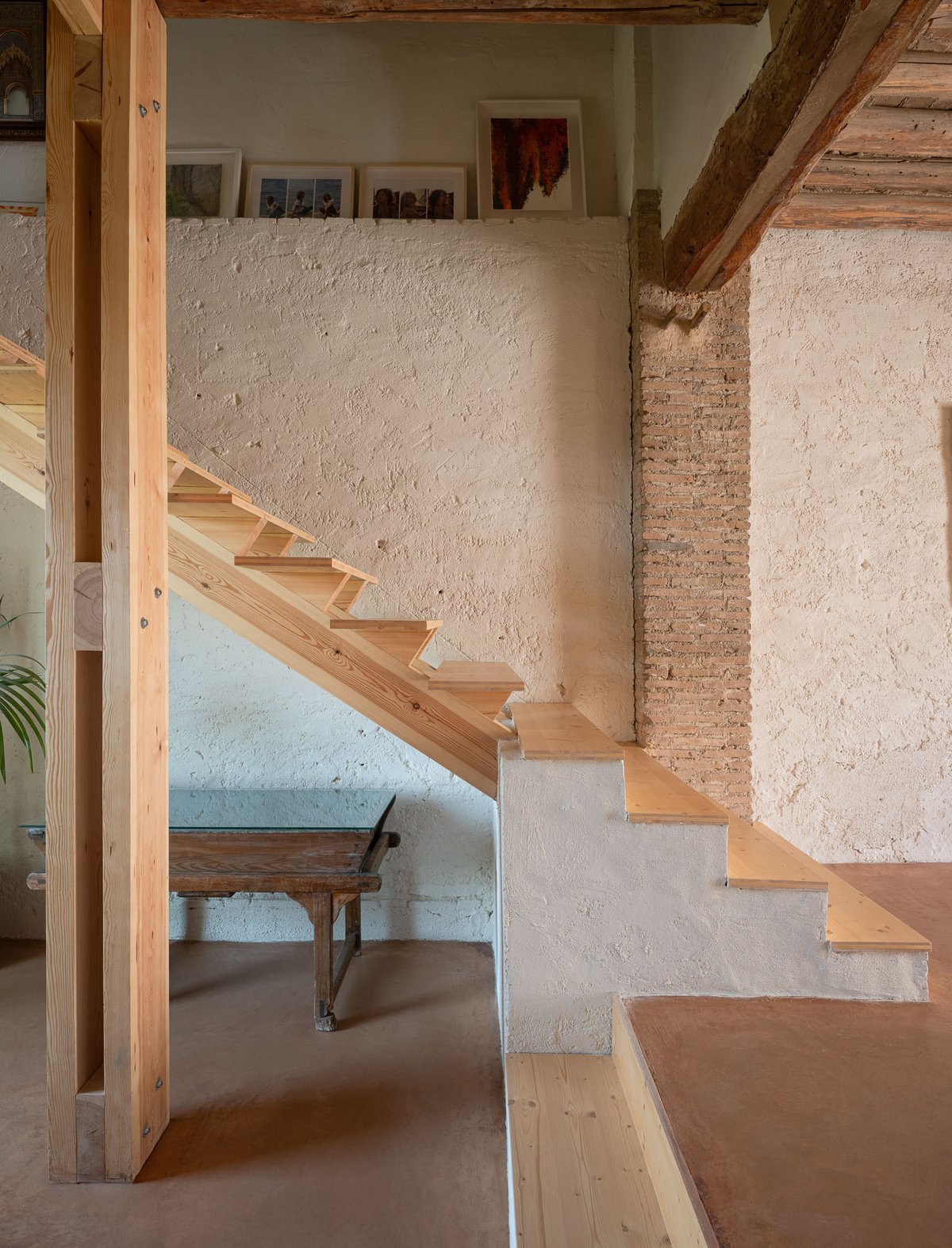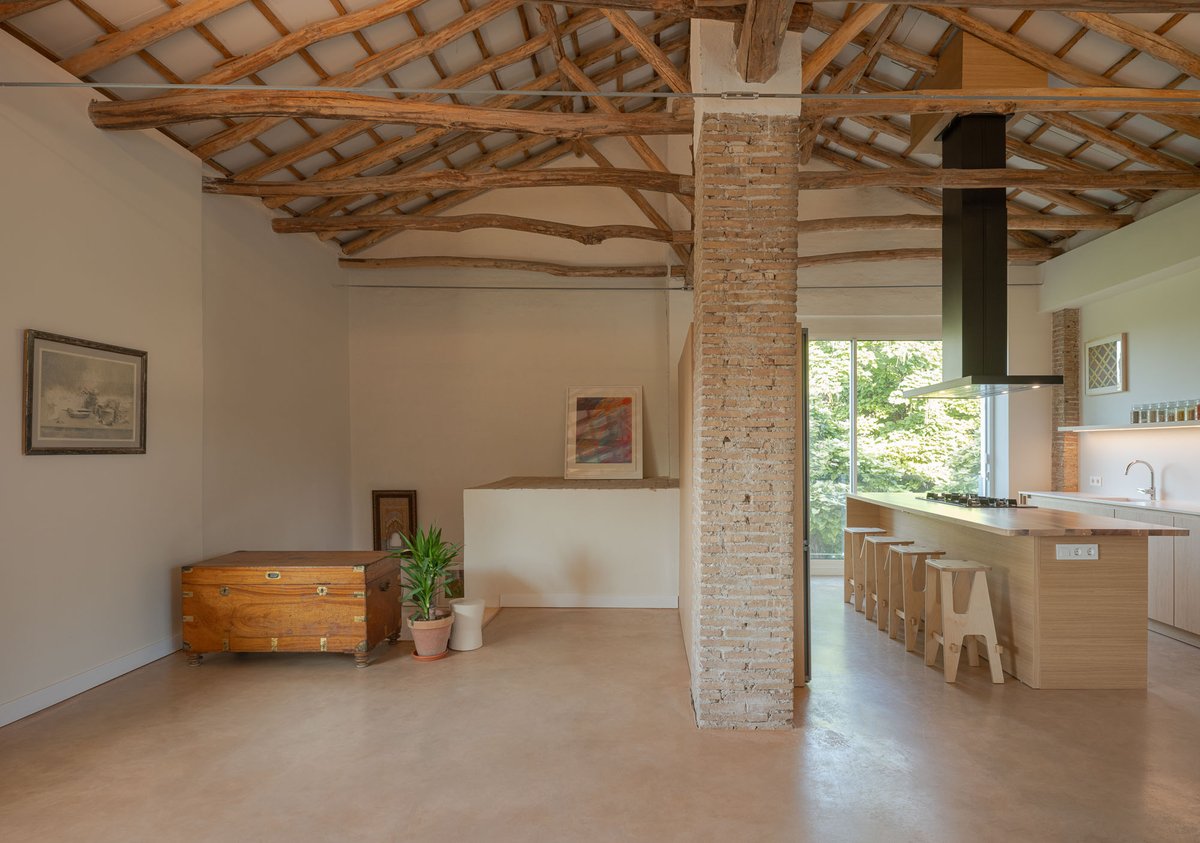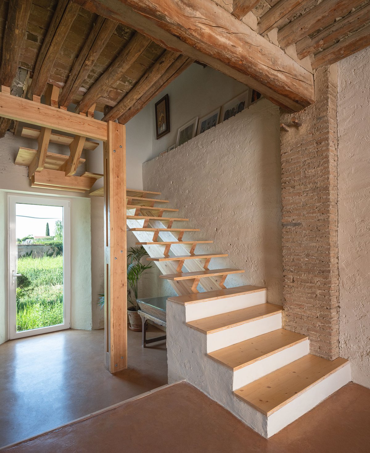 Con la sencilla intención de habitar esta construcción agrícola, potenciando su magnífica localización entre patios, huertos y jardines, la propuesta se plantea una mínima intervención. Se accede en el extremo este de la fachada sur, mejorando la escalera que comunica con la parte alta, que es el ámbito que se recupera como vivienda. Dado el buen estado de la estructura de madera de la cubierta solo se han levantado las tejas para incorporar el aislamiento necesario, el resto del espacio habitado se aísla exteriormente. De forma complementaria se han introducido tirantes de acero para limitar la movilidad estructural.