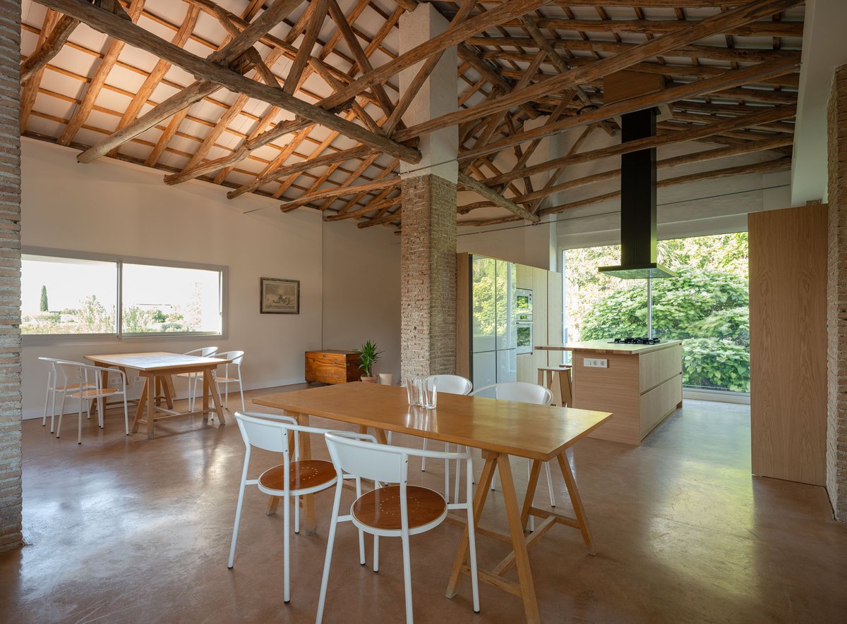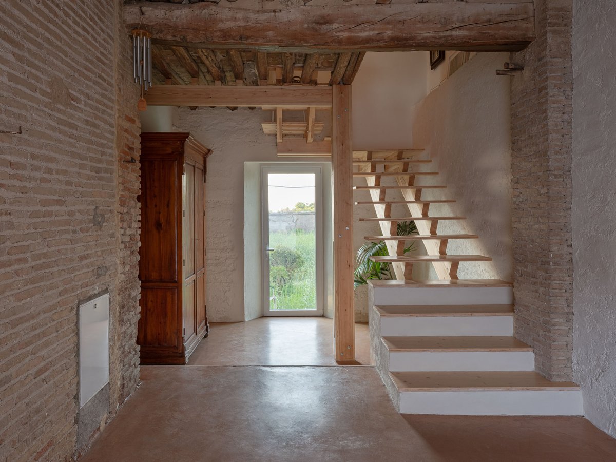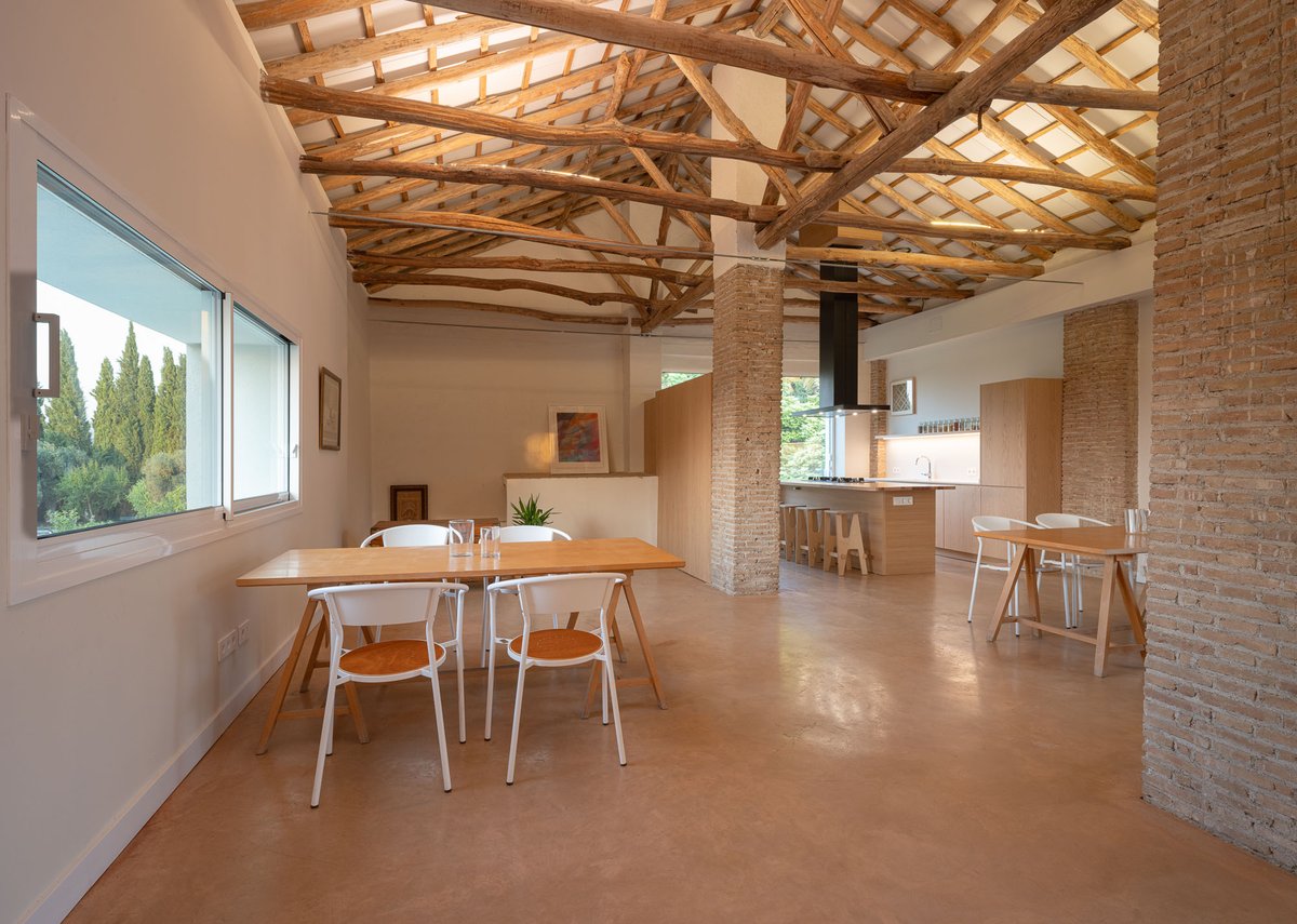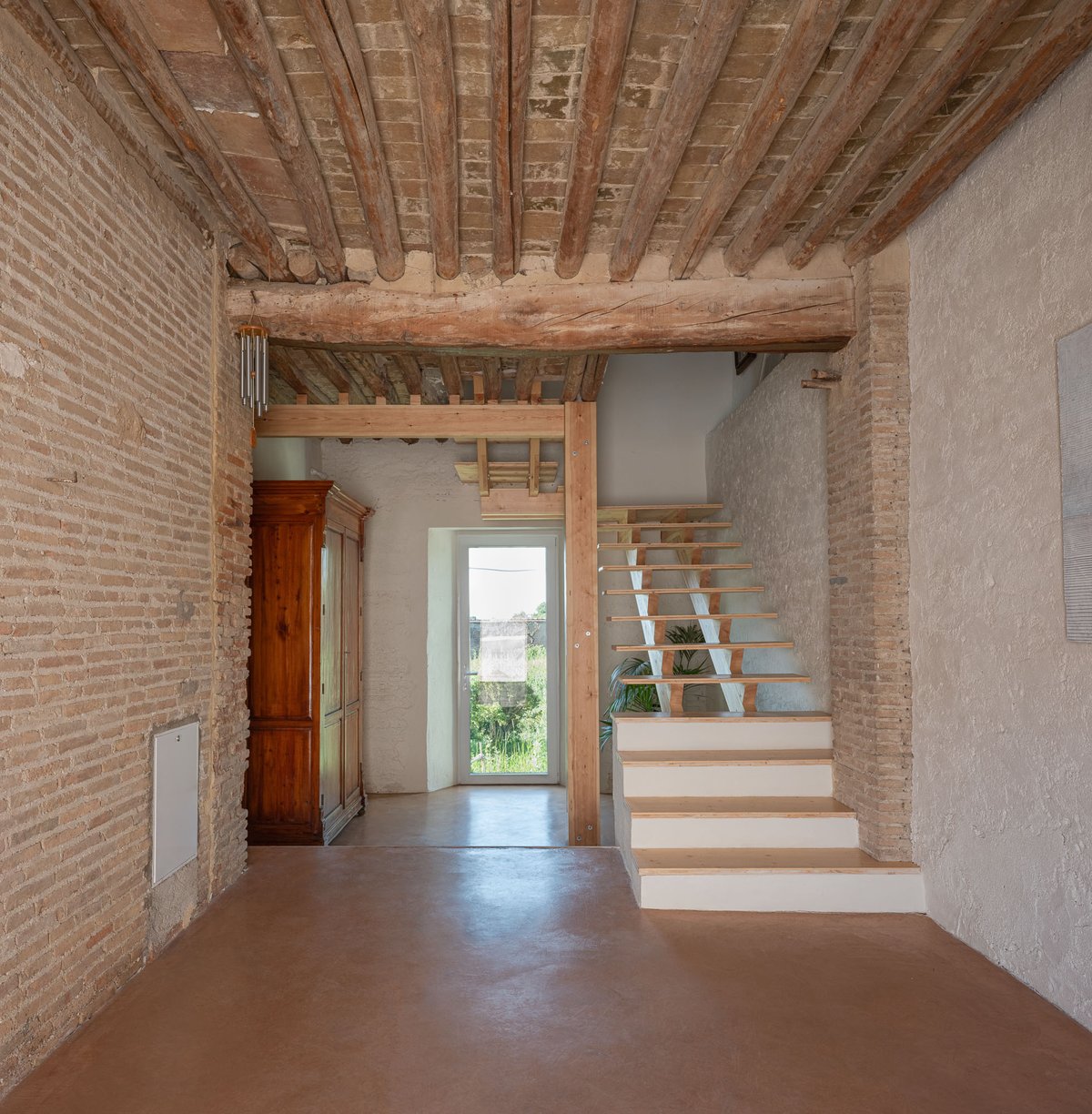 Con la sencilla intención de habitar esta construcción agrícola, potenciando su magnífica localización entre patios, huertos y jardines, la propuesta se plantea una mínima intervención. Se accede en el extremo este de la fachada sur, mejorando la escalera que comunica con la parte alta, que es el ámbito que se recupera como vivienda. Dado el buen estado de la estructura de madera de la cubierta solo se han levantado las tejas para incorporar el aislamiento necesario, el resto del espacio habitado se aísla exteriormente. De forma complementaria se han introducido tirantes de acero para limitar la movilidad estructural.