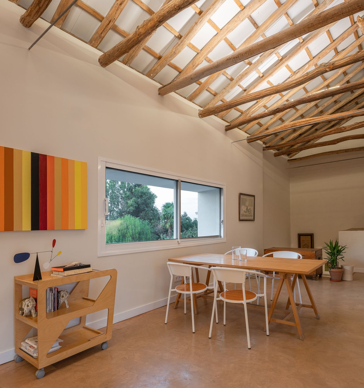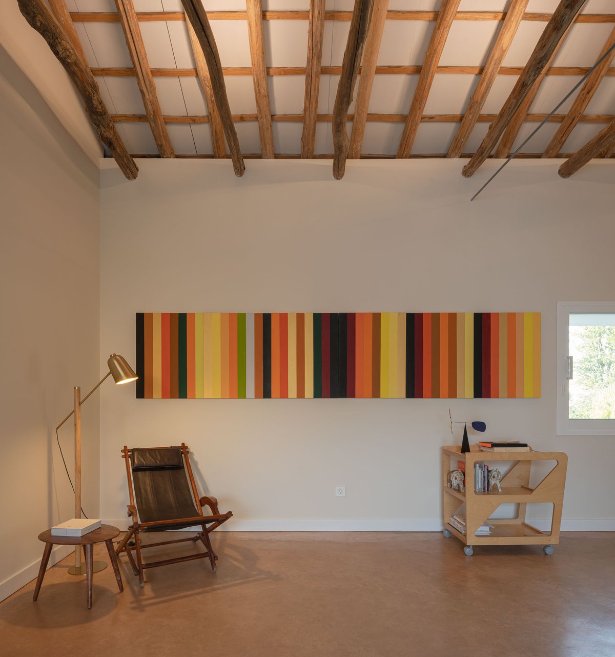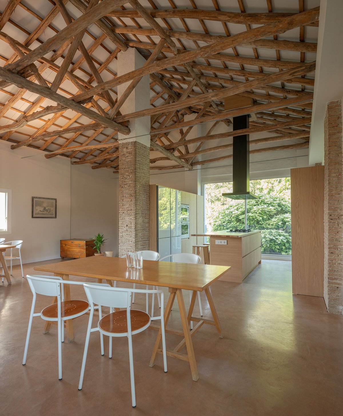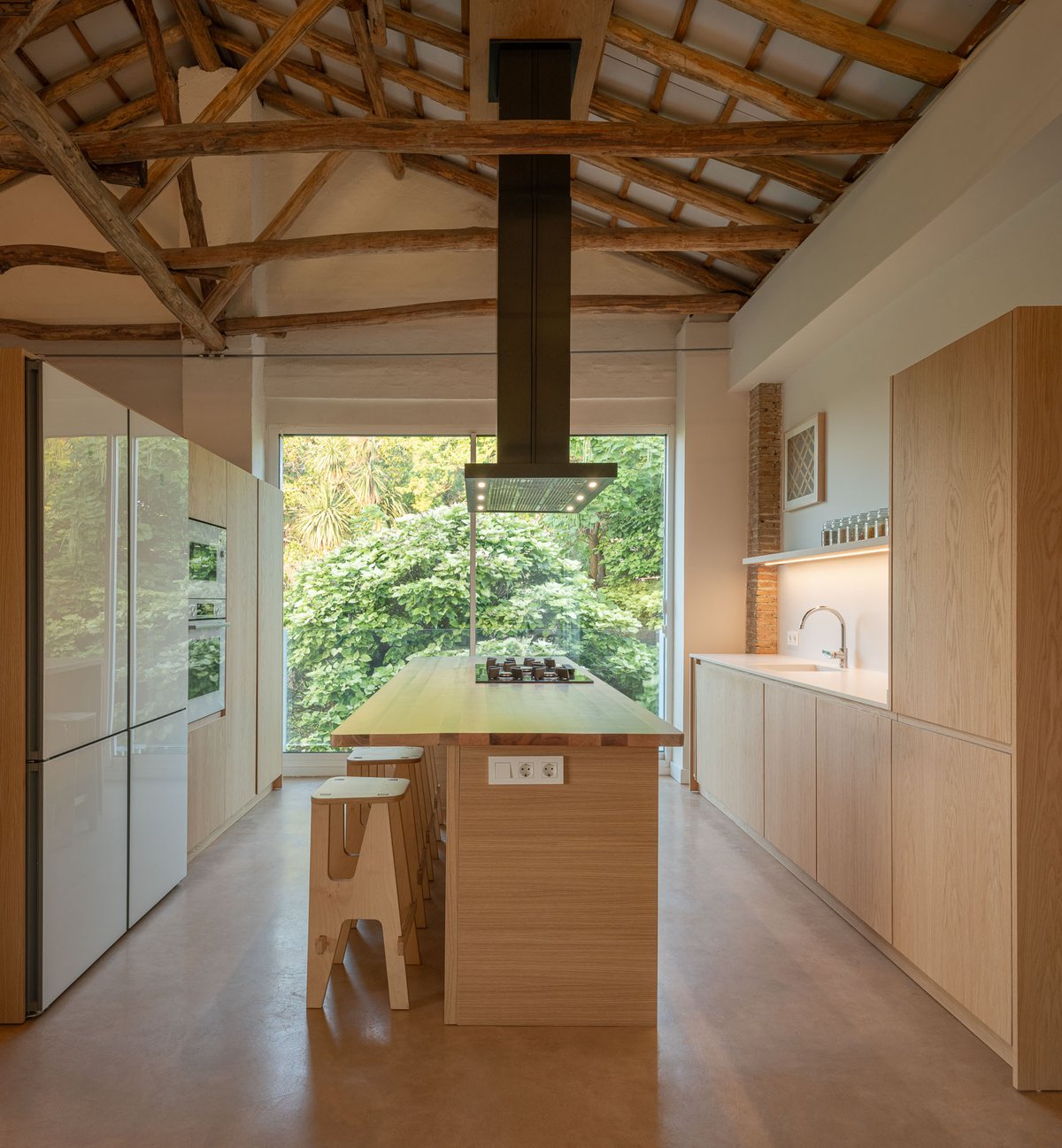 Con la sencilla intención de habitar esta construcción agrícola, potenciando su magnífica localización entre patios, huertos y jardines, la propuesta se plantea una mínima intervención. Se accede en el extremo este de la fachada sur, mejorando la escalera que comunica con la parte alta, que es el ámbito que se recupera como vivienda. Dado el buen estado de la estructura de madera de la cubierta solo se han levantado las tejas para incorporar el aislamiento necesario, el resto del espacio habitado se aísla exteriormente. De forma complementaria se han introducido tirantes de acero para limitar la movilidad estructural.