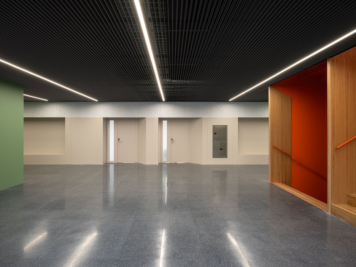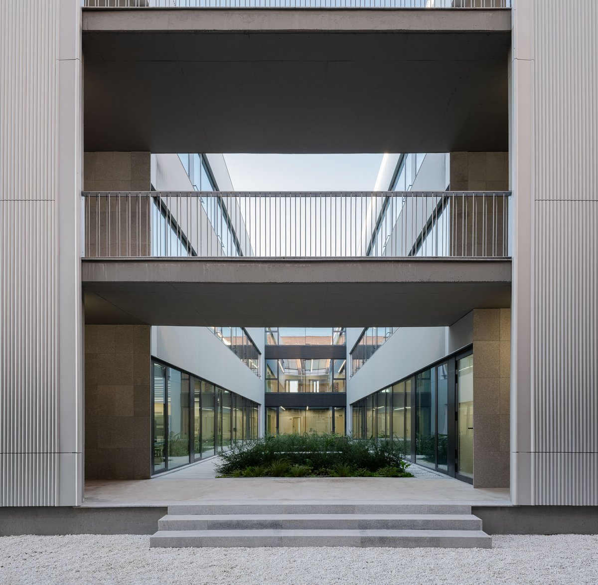 Este cuerpo de vestíbulos se prolonga en planta baja generando un espacio amplio de ingreso y conexión entre ambas edificaciones. Un espacio que se muestra transparente y diáfano desde la calle y con el patio creado en el contacto entre las edificaciones como fondo de perspectiva.