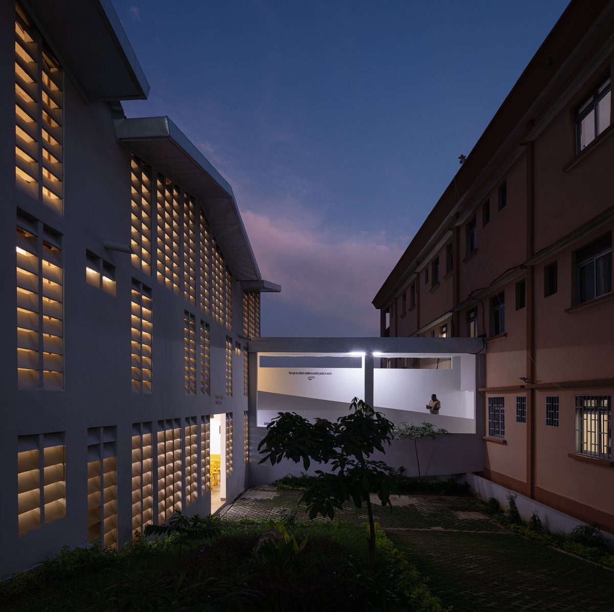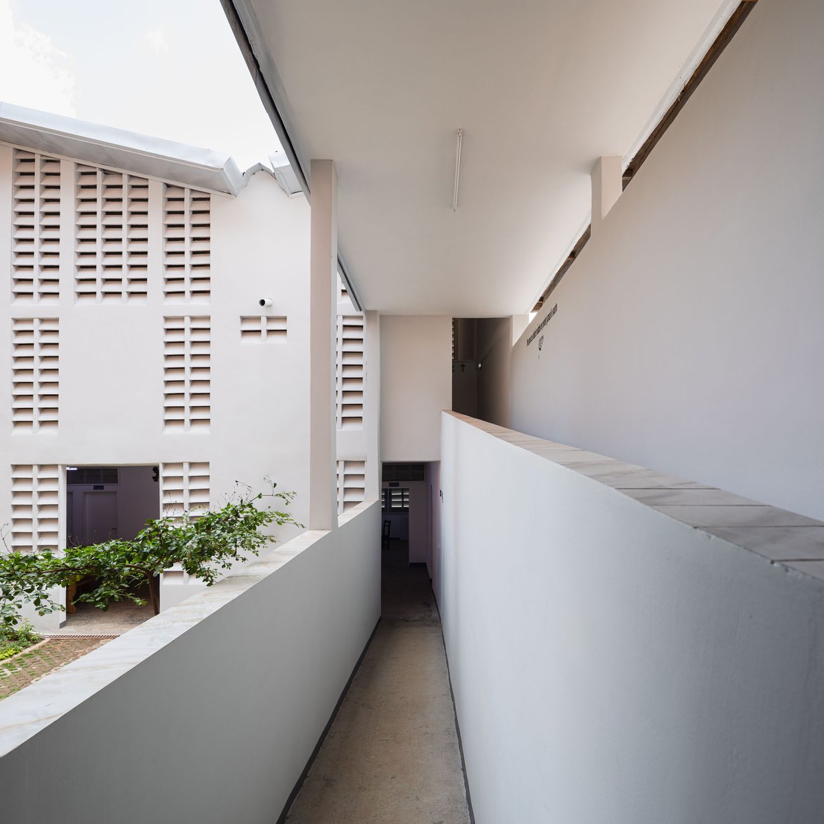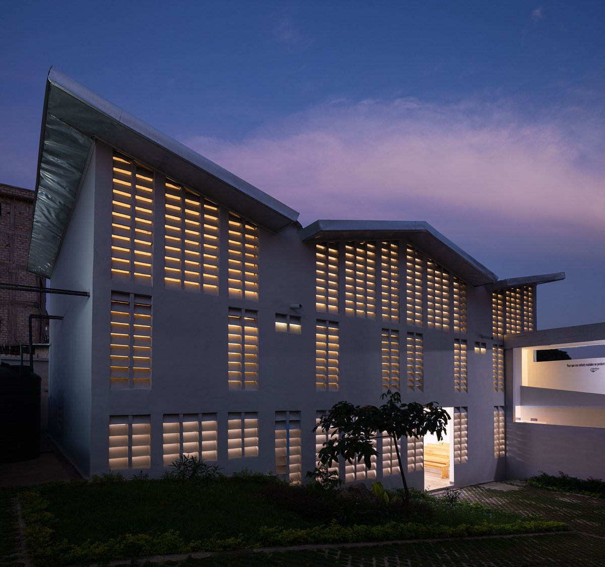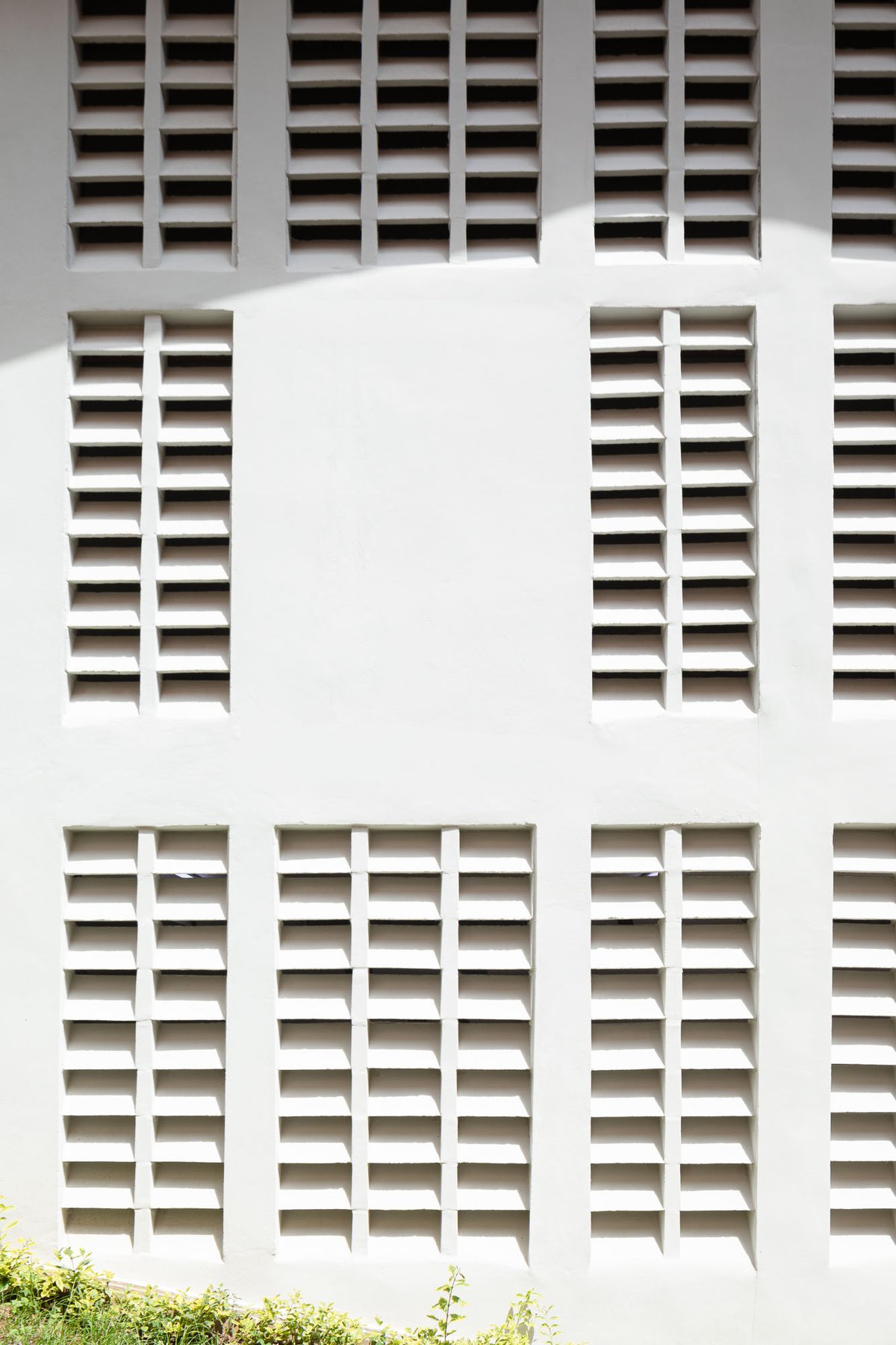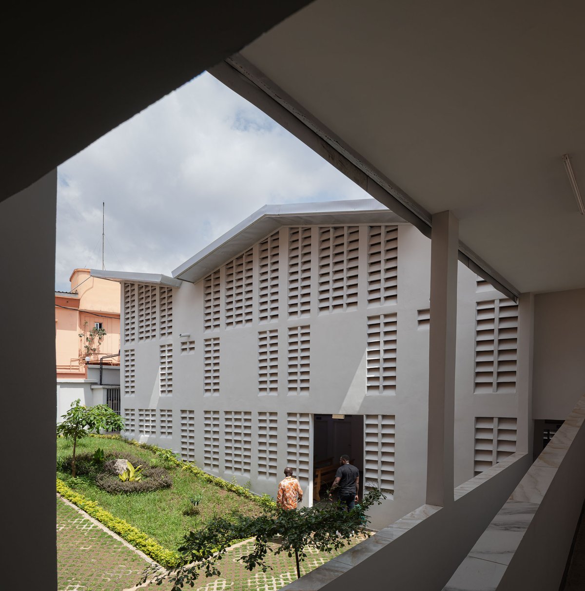 As is the case in most of the city, there is no running water supply, so the building is designed with large, sloping roofs and wide eaves that collect rainwater, which is stored in gravity-fed tanks for use in the bathrooms. The climate is temperate year-round, with temperatures ranging from 20°C to 30°C. The building features concrete latticework that protects from direct sunlight and rain while providing cross-ventilation. This facade, which does not require glass, incorporates insect screens to protect the openings from insects and other animals.