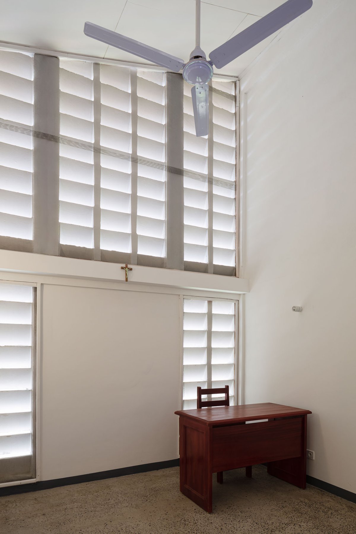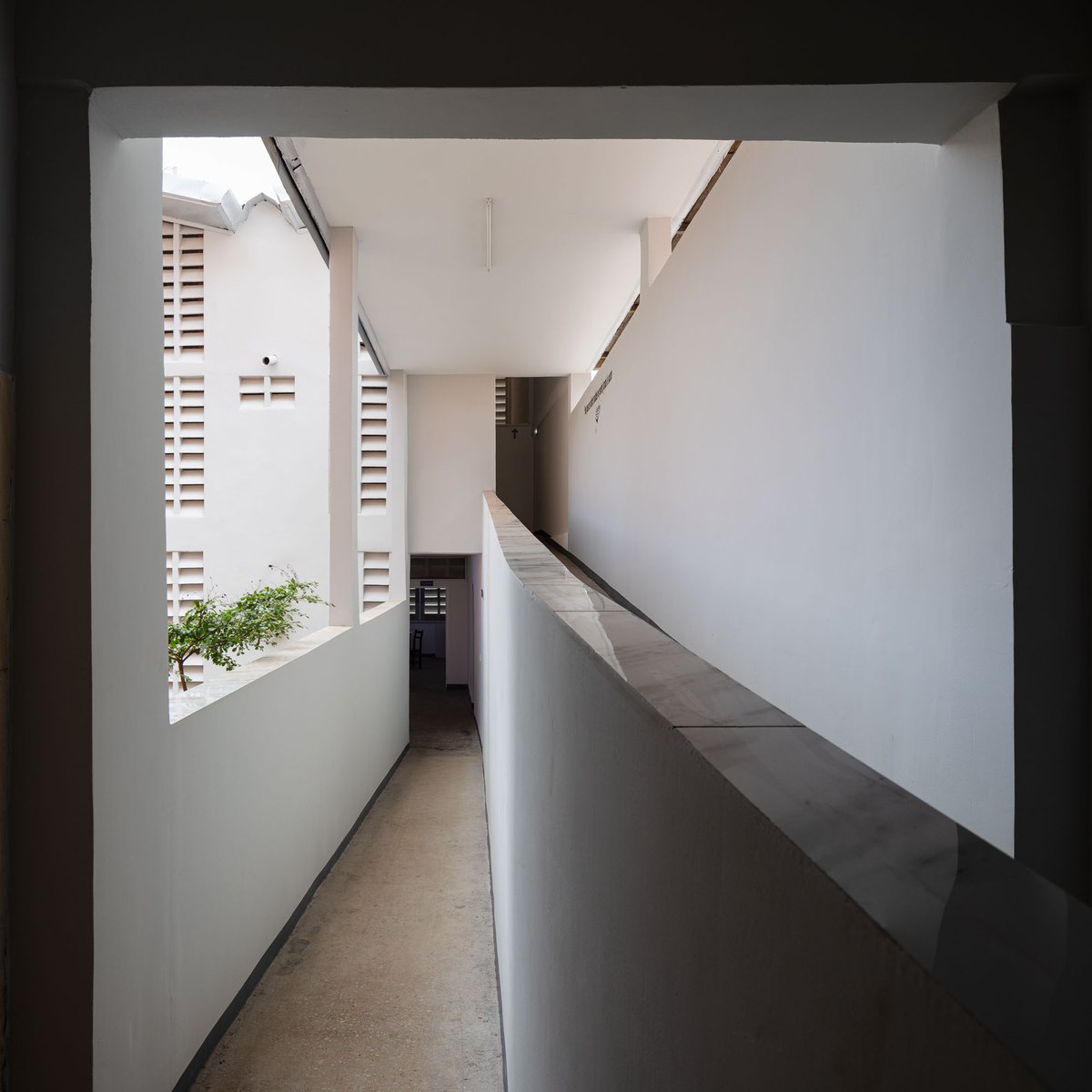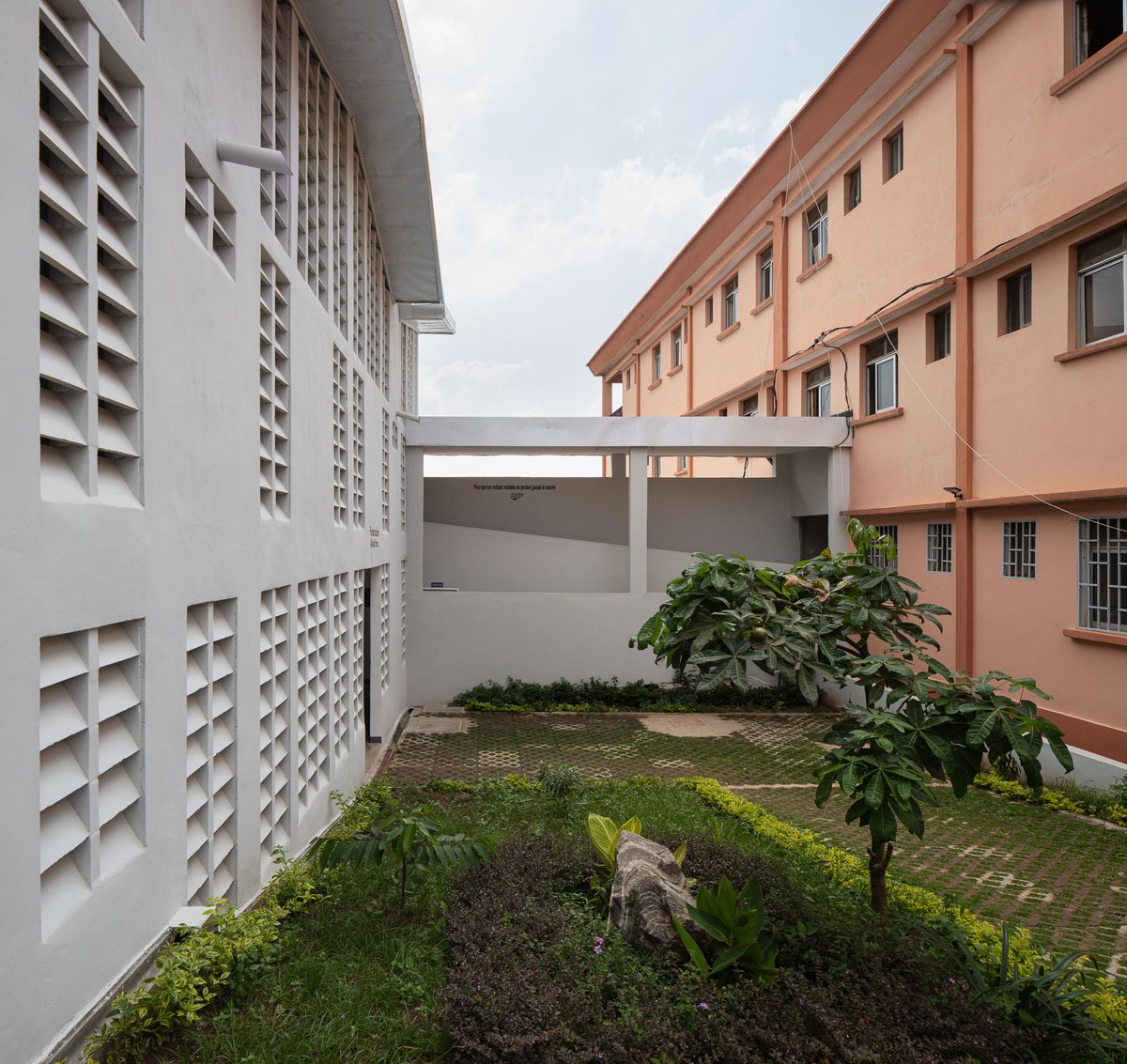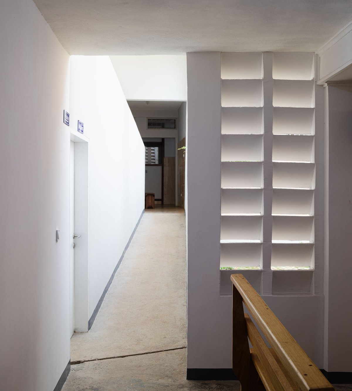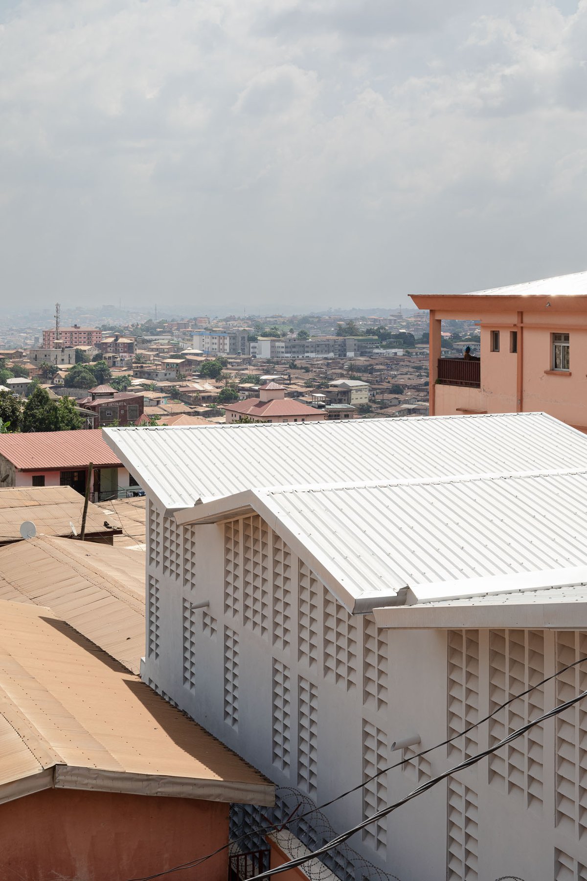 As is the case in most of the city, there is no running water supply, so the building is designed with large, sloping roofs and wide eaves that collect rainwater, which is stored in gravity-fed tanks for use in the bathrooms. The climate is temperate year-round, with temperatures ranging from 20°C to 30°C. The building features concrete latticework that protects from direct sunlight and rain while providing cross-ventilation. This facade, which does not require glass, incorporates insect screens to protect the openings from insects and other animals.