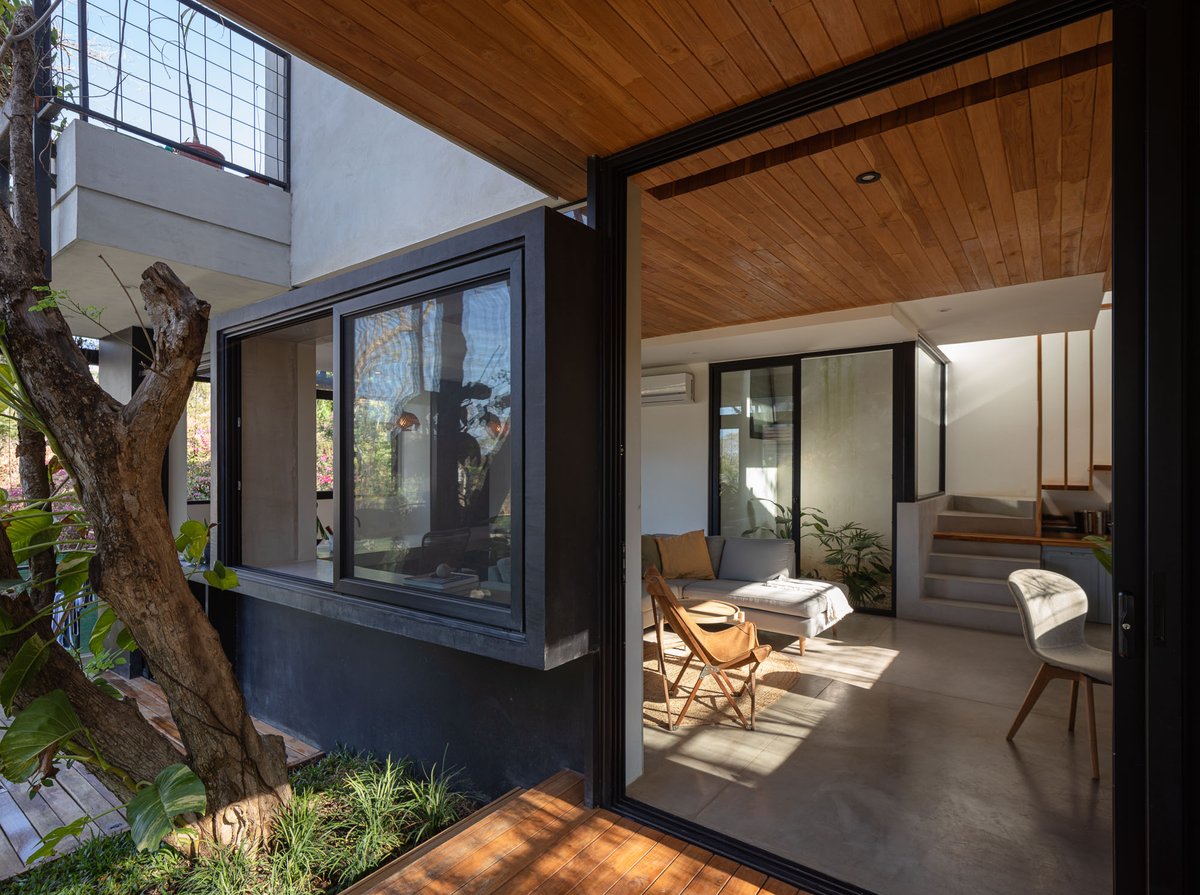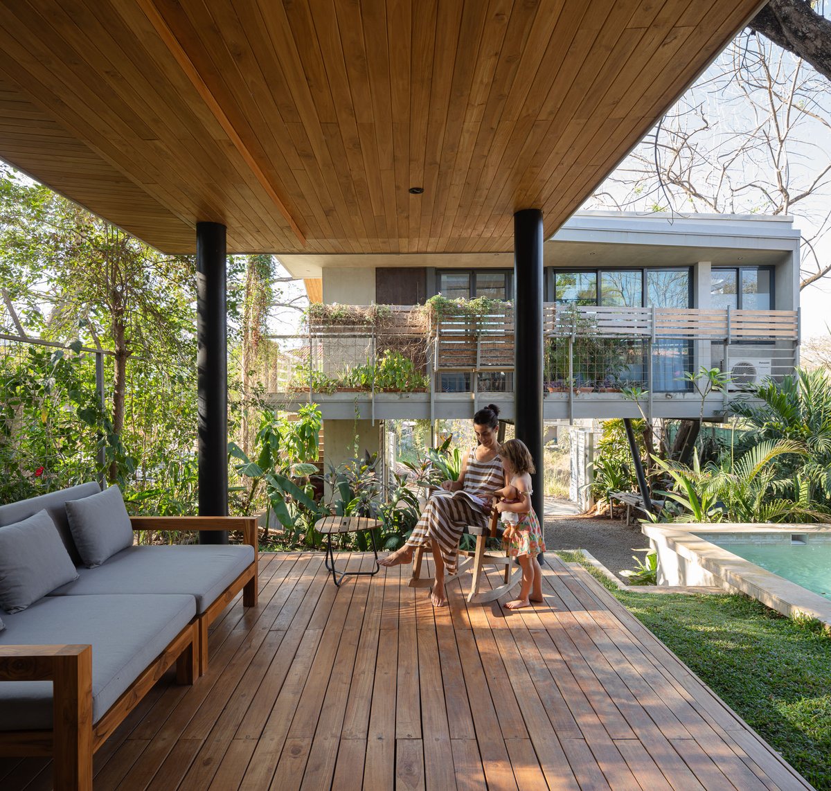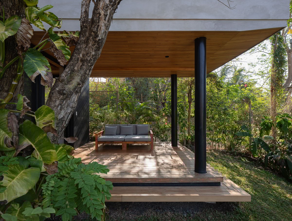 The entrance to the house is a tropical terrace roofed by one of the bedrooms on stilts, that connects to the living space.