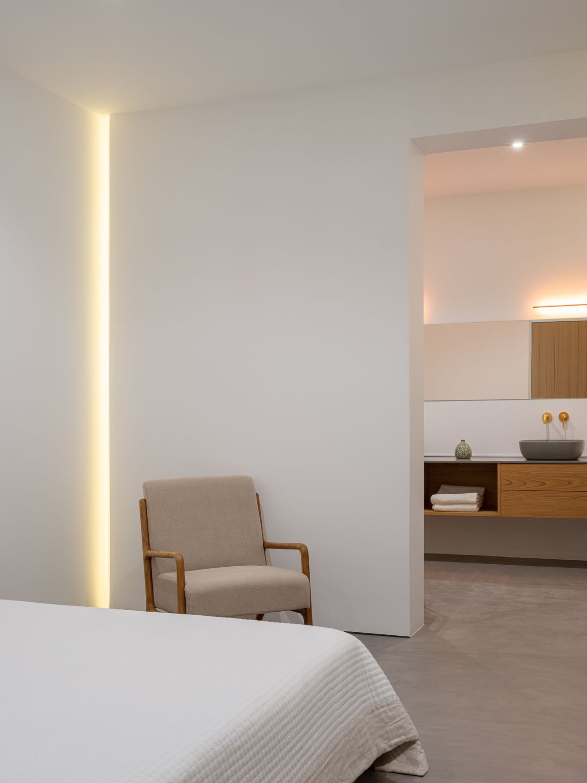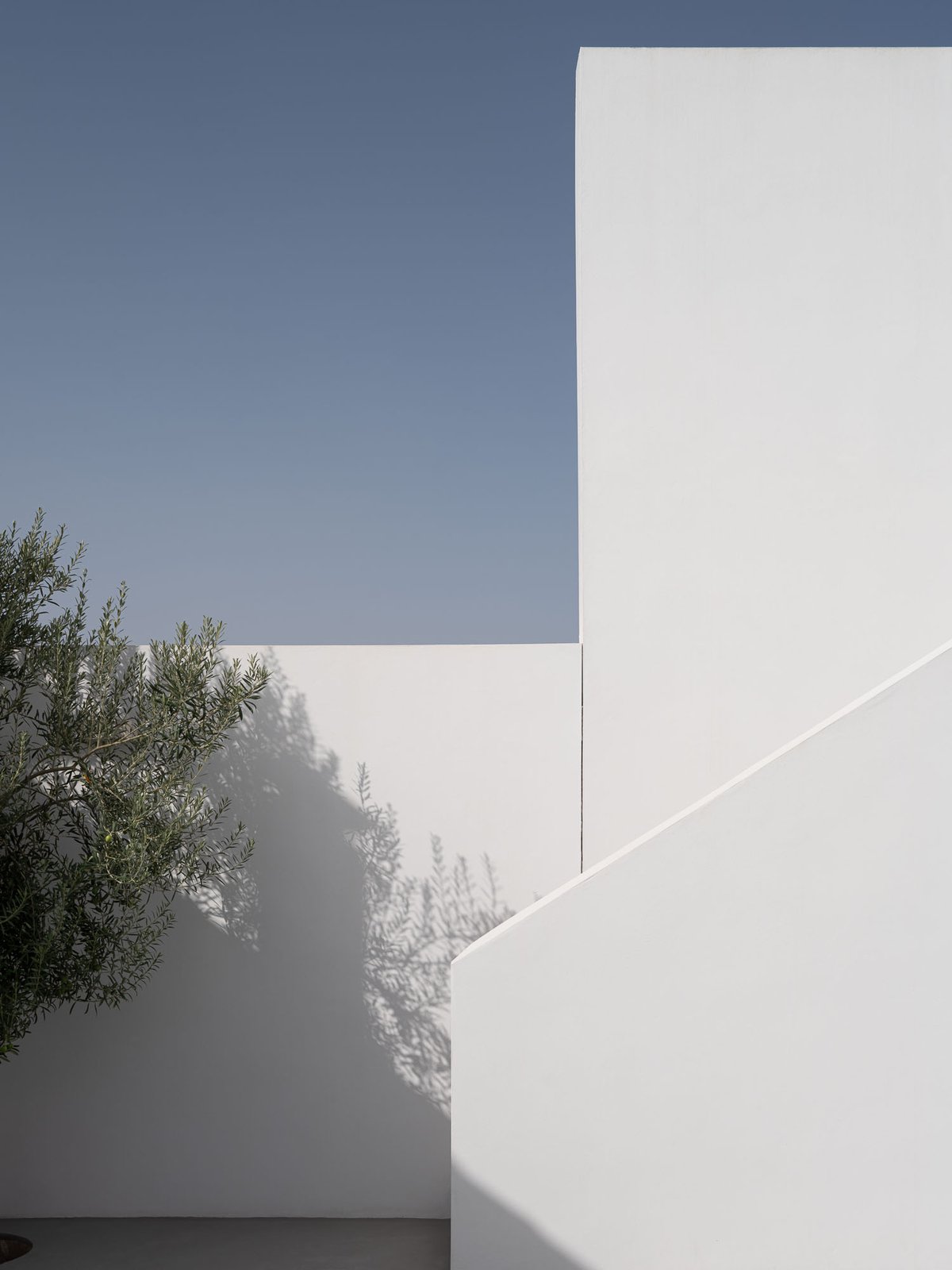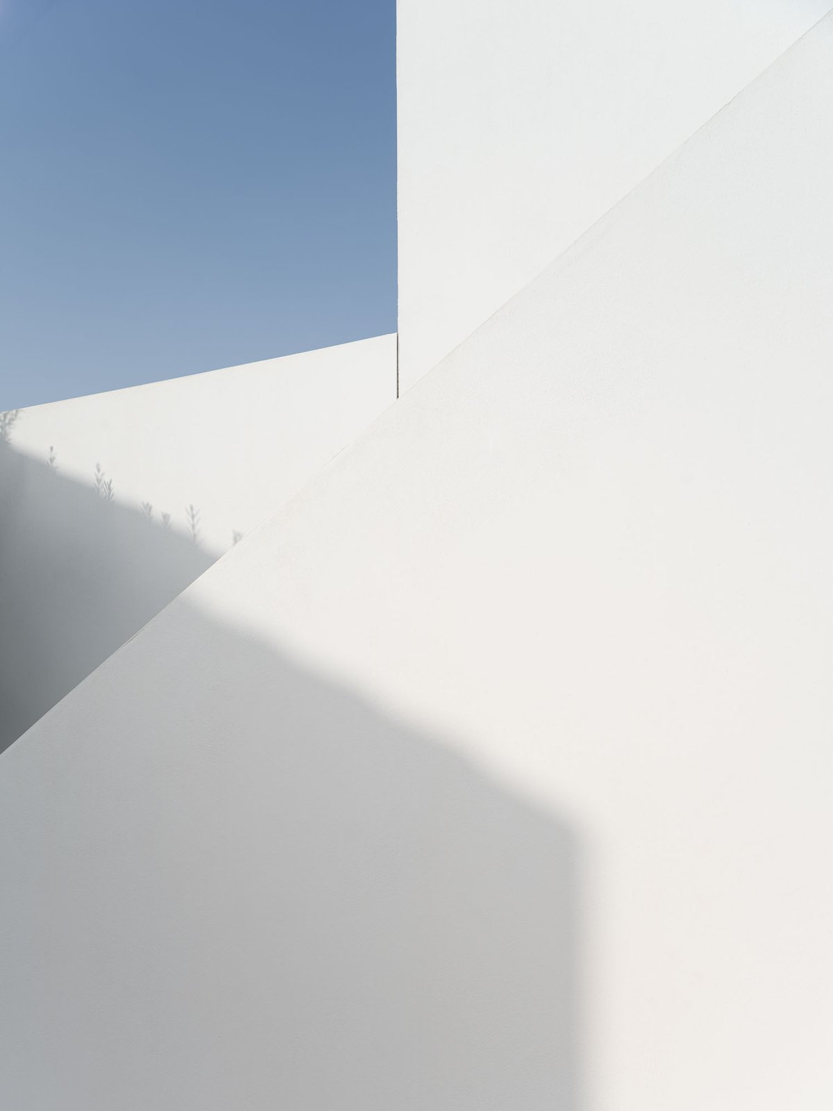 With its composition of white planes scaled at different heights and angles, the terrace intensifies the sense of the vastness of the sky while providing glimpses of abutting buildings for context. The sun's rays cast a play of shadow across the smooth concrete surfaces throughout the afternoon, as the infinity pool's waterfall edge produces a tranquil ambient sound.
