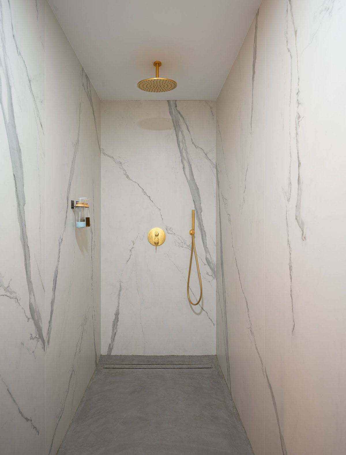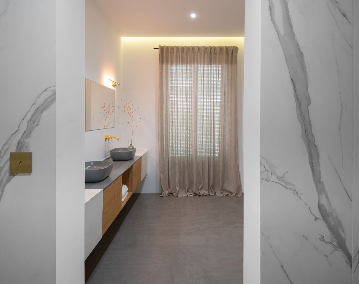 Public areas, including an open plan living and dining zone, are intuitively arranged on the ground floor to foster family gathering and social interaction, with the bedrooms on the second level for privacy. The great room opens seamlessly onto a south-facing pool terrace, designed to capture optimal sun throughout the day and to extend living spaces outdoors, anchoring the home in its Mediterranean climate.