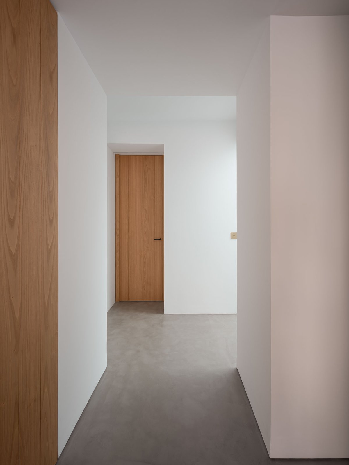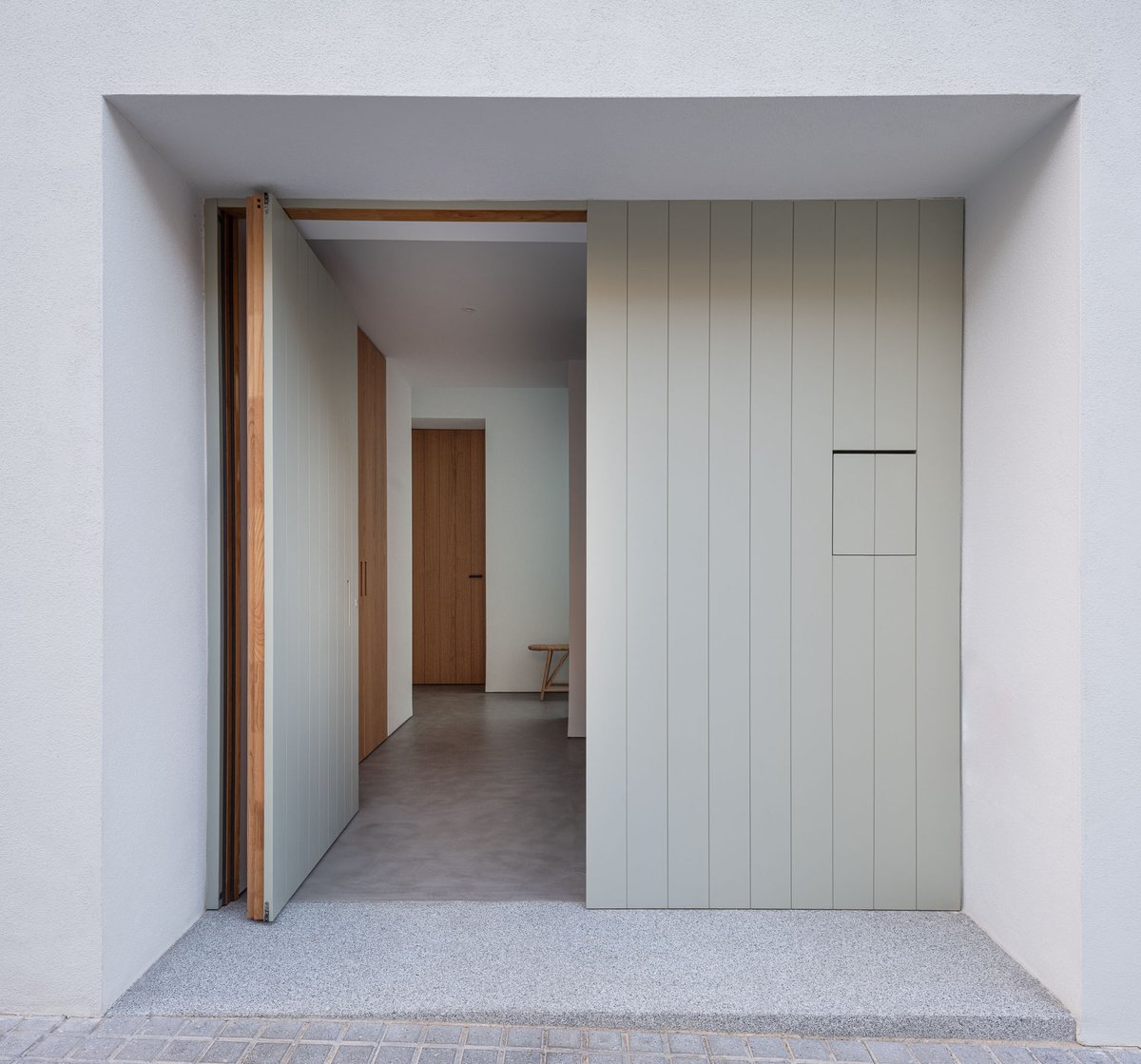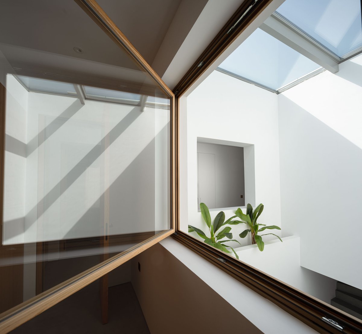 The 2,676.square-feet home was designed for a couple and their young daughter using Passive House standards. The in-fill site was deep enough to accommodate a three-bedroom residence with a sizable rear terrace. The prosaic wooden front door opens into a vestibule that leads into an interior courtyard enclosed by an expansive skylight. Serving as the nexus of the home's circulation, the vertical volume floods the house with natural light and acts as a passive climate regulator by promoting cross-ventilation and allowing warm air to rise and dissipate.