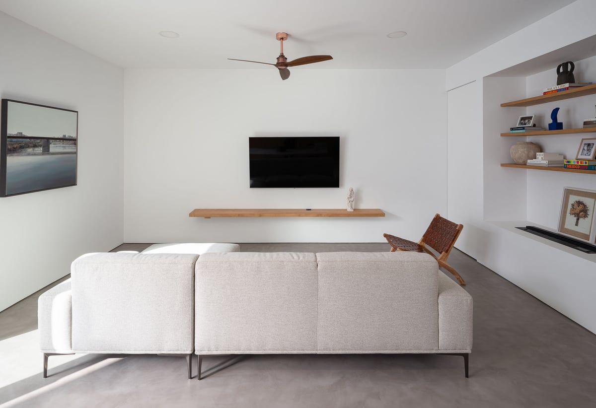 The design's cool palette of white walls and concrete floors is accented by chestnut wood detailing, including frames around the deep, single-pane windows and sliding glass doors. Vertical planks of chestnut clad the kitchen island and the tall doors that hide the pantry, storage area and refrigerator. Upstairs, the primary bedroom has an ensuite bath and a Jack-and-Jill bathroom separates the additional two bedrooms with French doors that open to a deep balcony and staircase overlooking the pool terrace and city views.