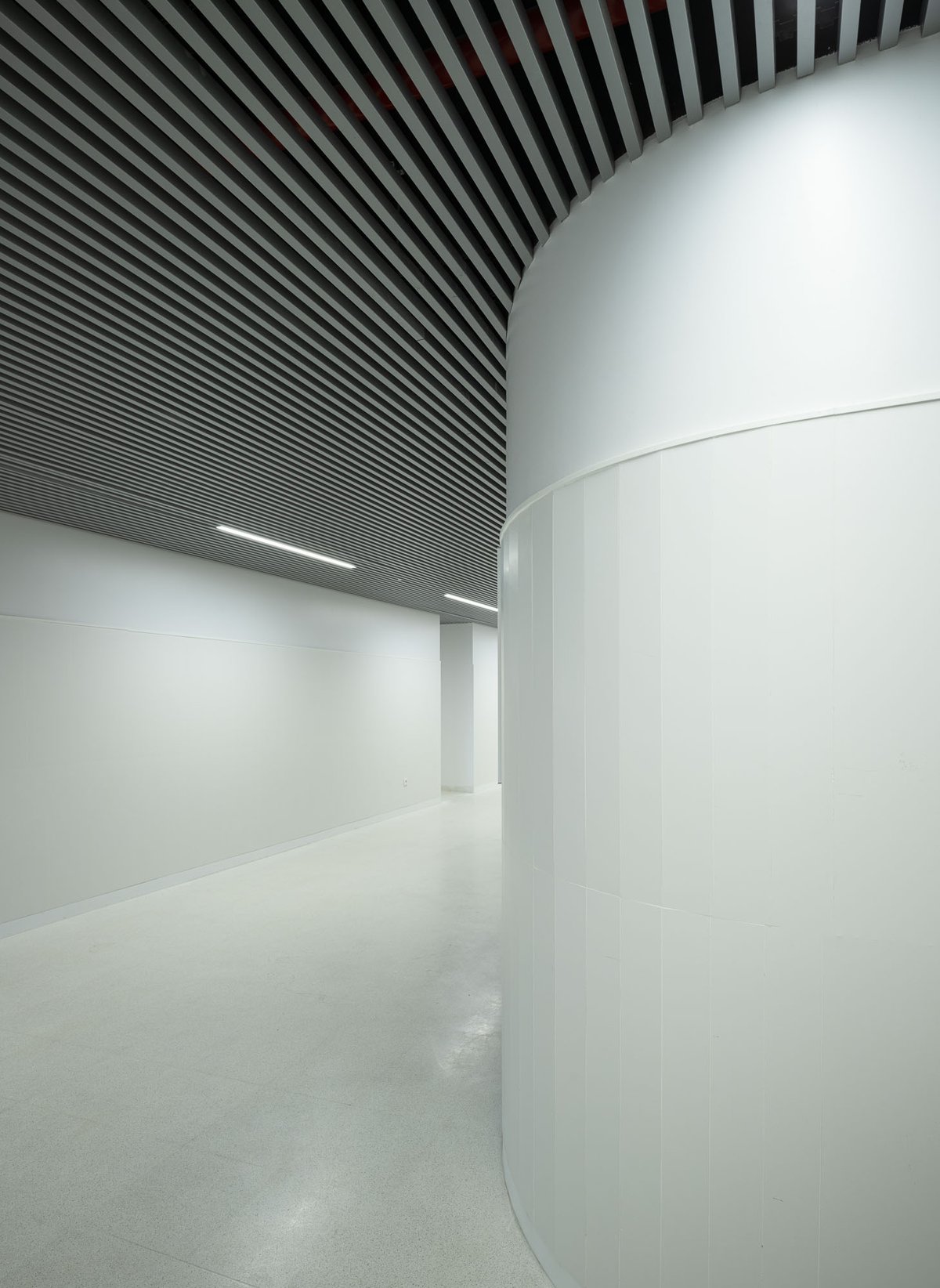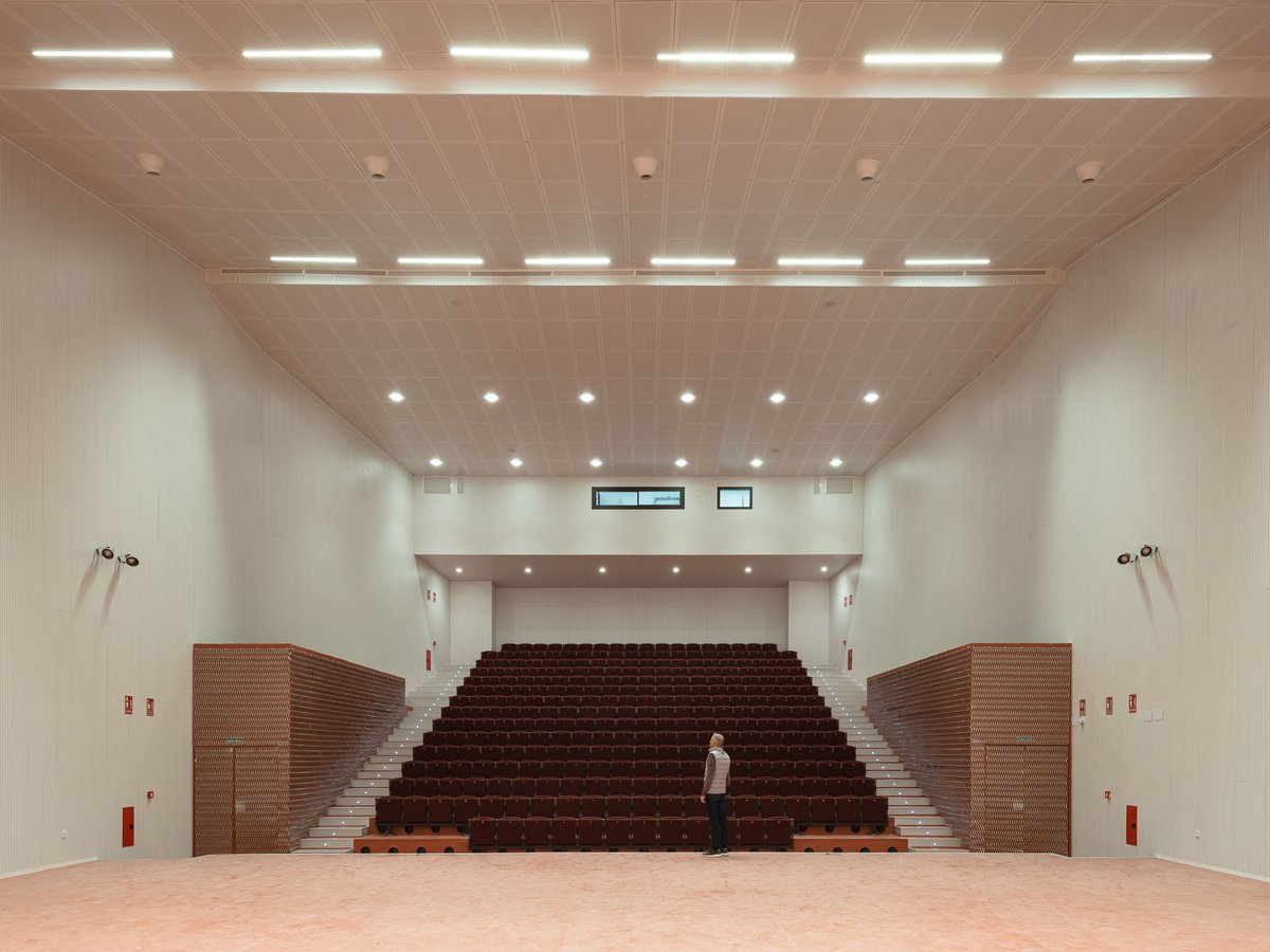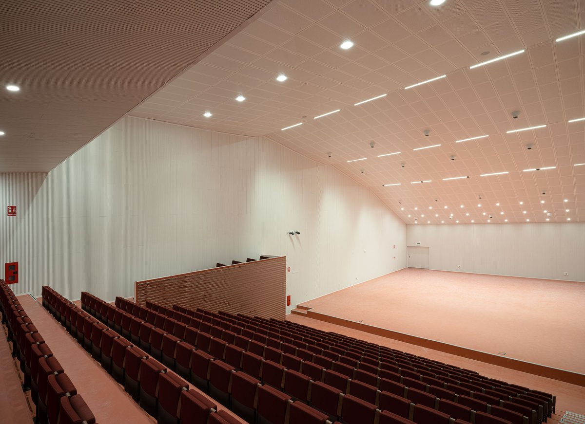 Interiormente, el sistema constructivo responde a una serie de mejoras en el diseño acústico para evitar las coloraciones. Para ello, la distribución de las salas y aulas no es uniforme. En recintos pequeños se ha inclinado algún paramento ligeramente evitando que todas las superficies sean paralelas. El uso de cortinas acústicas con buen grado absorción en todas las aulas instrumentales nos permite ajustar de forma rápida la absorción de las mismas, modificando su tiempo de reverberación en función del instrumento musical utilizado. En las aulas específicas se plantea la disposición de revestimientos acordes a su uso, difractantes o absorbentes, para favorecer la acústica interior.