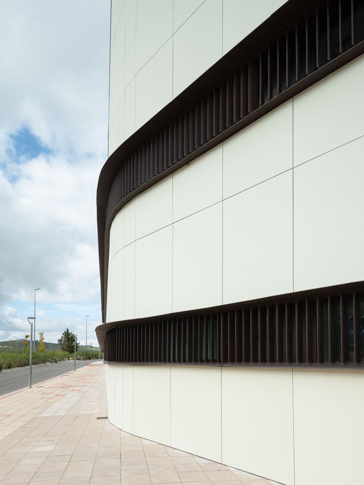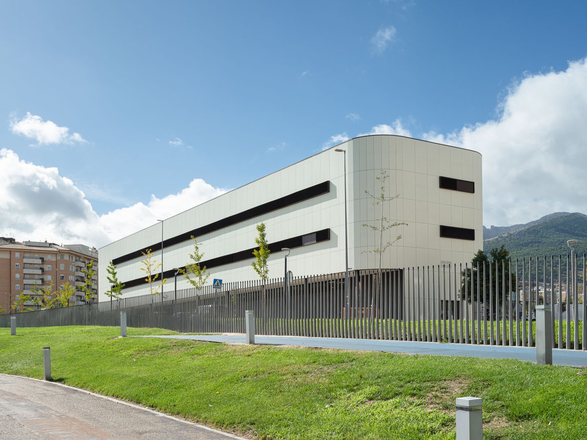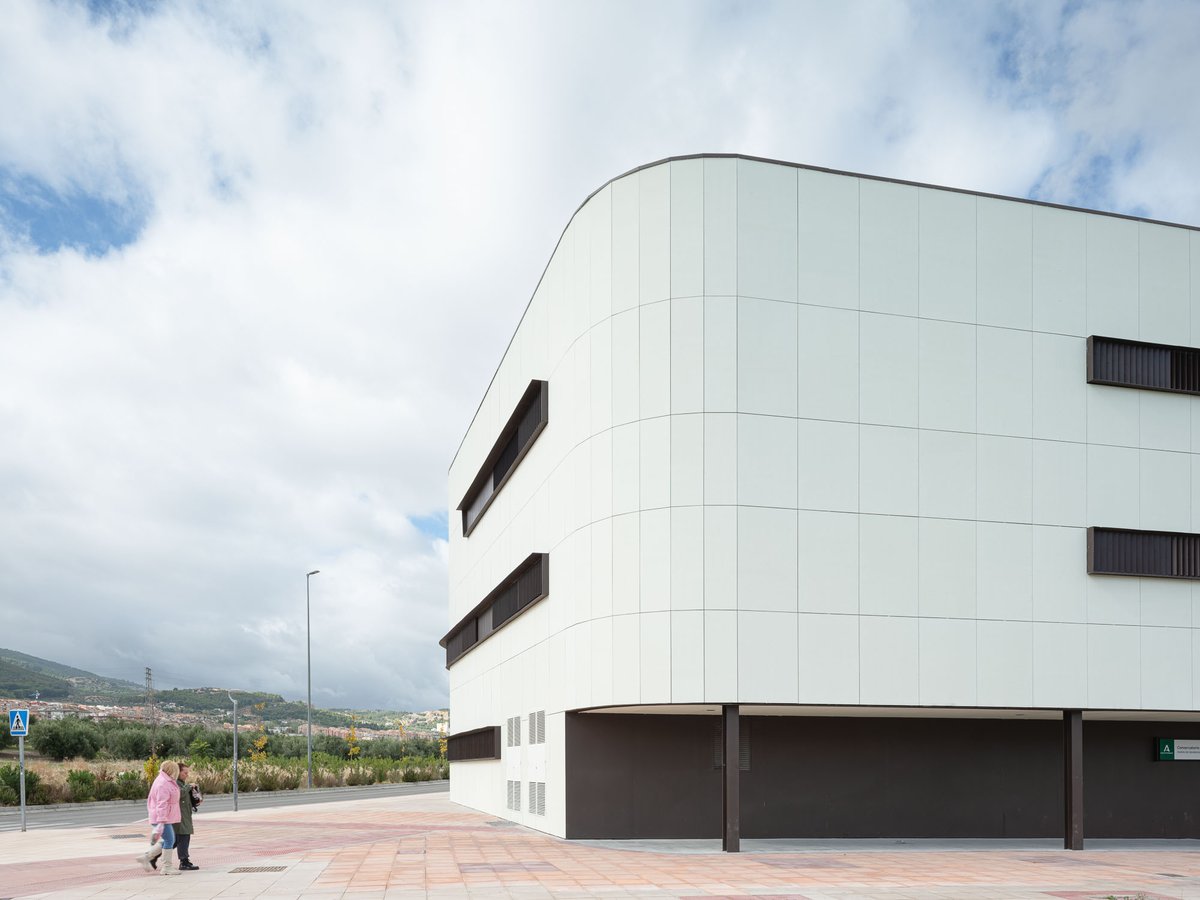 La envolvente se ha proyectado con una fachada ventilada de fibrocemento coloreada con veladura al silicato en tono crema cálido con un ligero tono verdoso para su mimetización con el entorno, tanto el Parque Andrés de Vandelvira del Bulevar como la ladera del cerro del Castillo de Santa Catalina. Las ventanas son continuas y estrechas como hendiduras horizontales para enfatizar el volumen prismático que asoma al Bulevar.