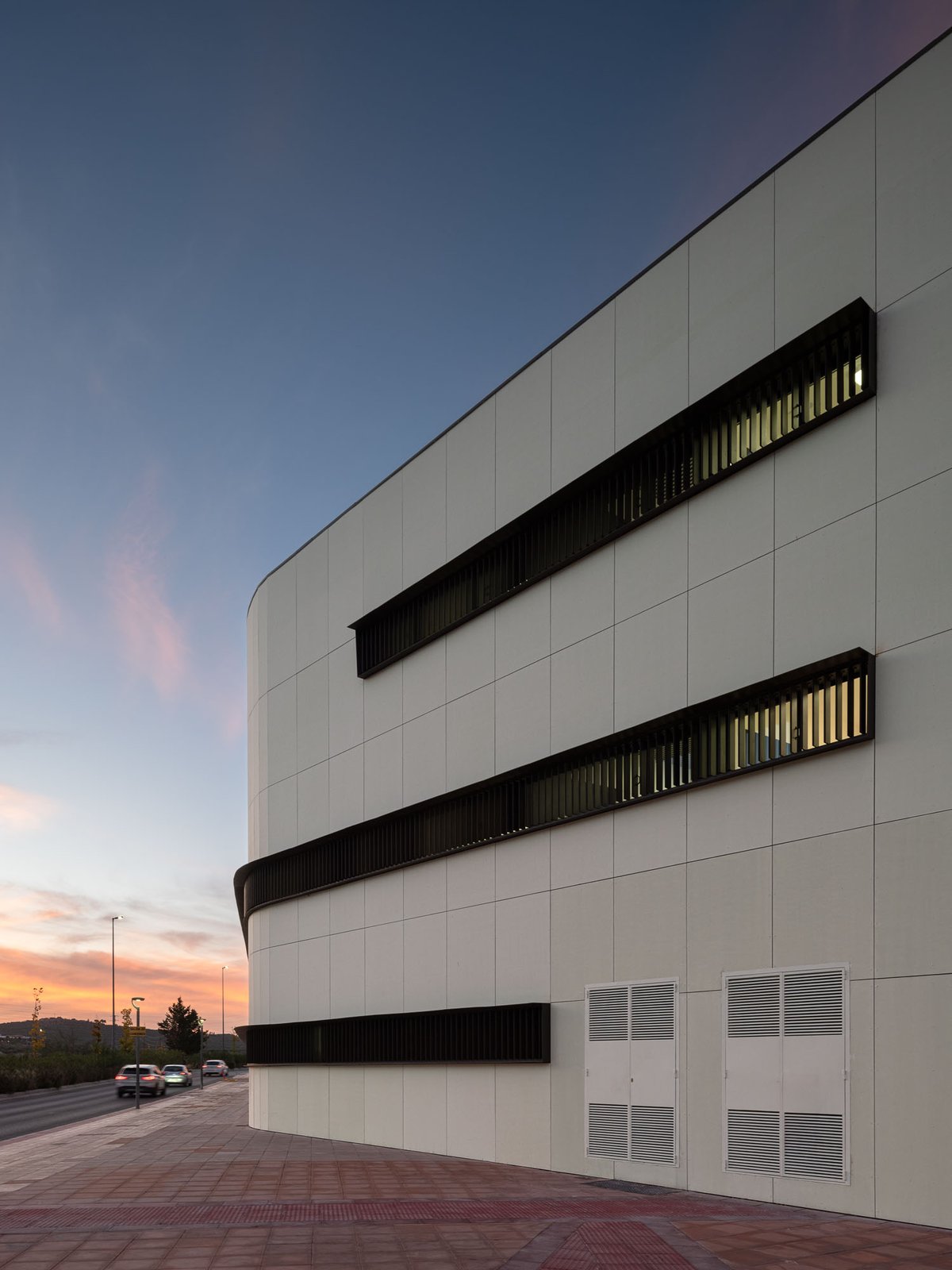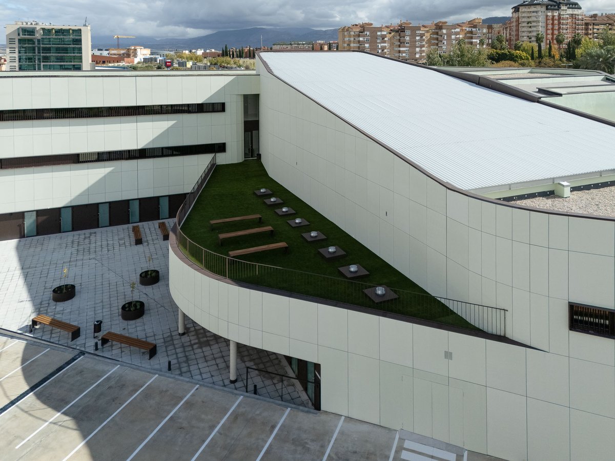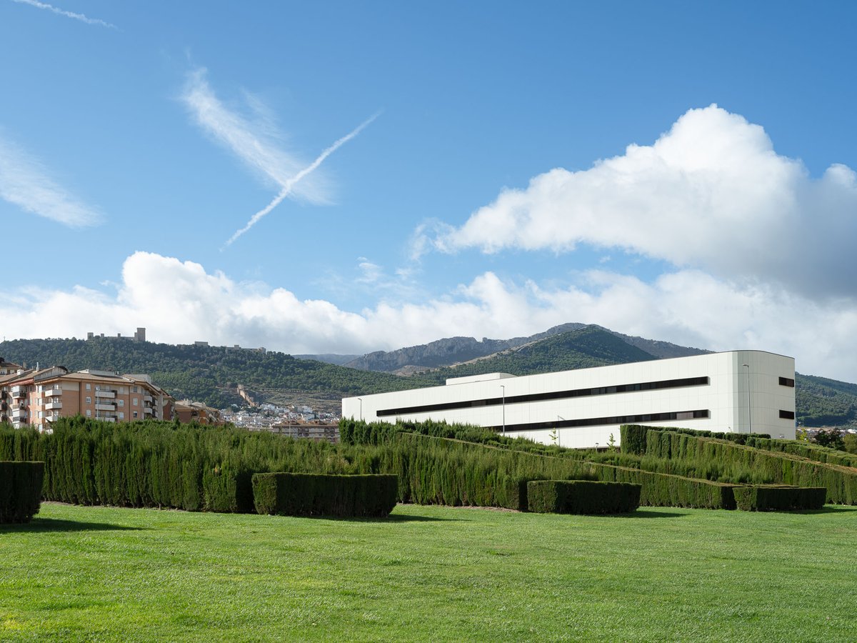 La envolvente se ha proyectado con una fachada ventilada de fibrocemento coloreada con veladura al silicato en tono crema cálido con un ligero tono verdoso para su mimetización con el entorno, tanto el Parque Andrés de Vandelvira del Bulevar como la ladera del cerro del Castillo de Santa Catalina. Las ventanas son continuas y estrechas como hendiduras horizontales para enfatizar el volumen prismático que asoma al Bulevar.