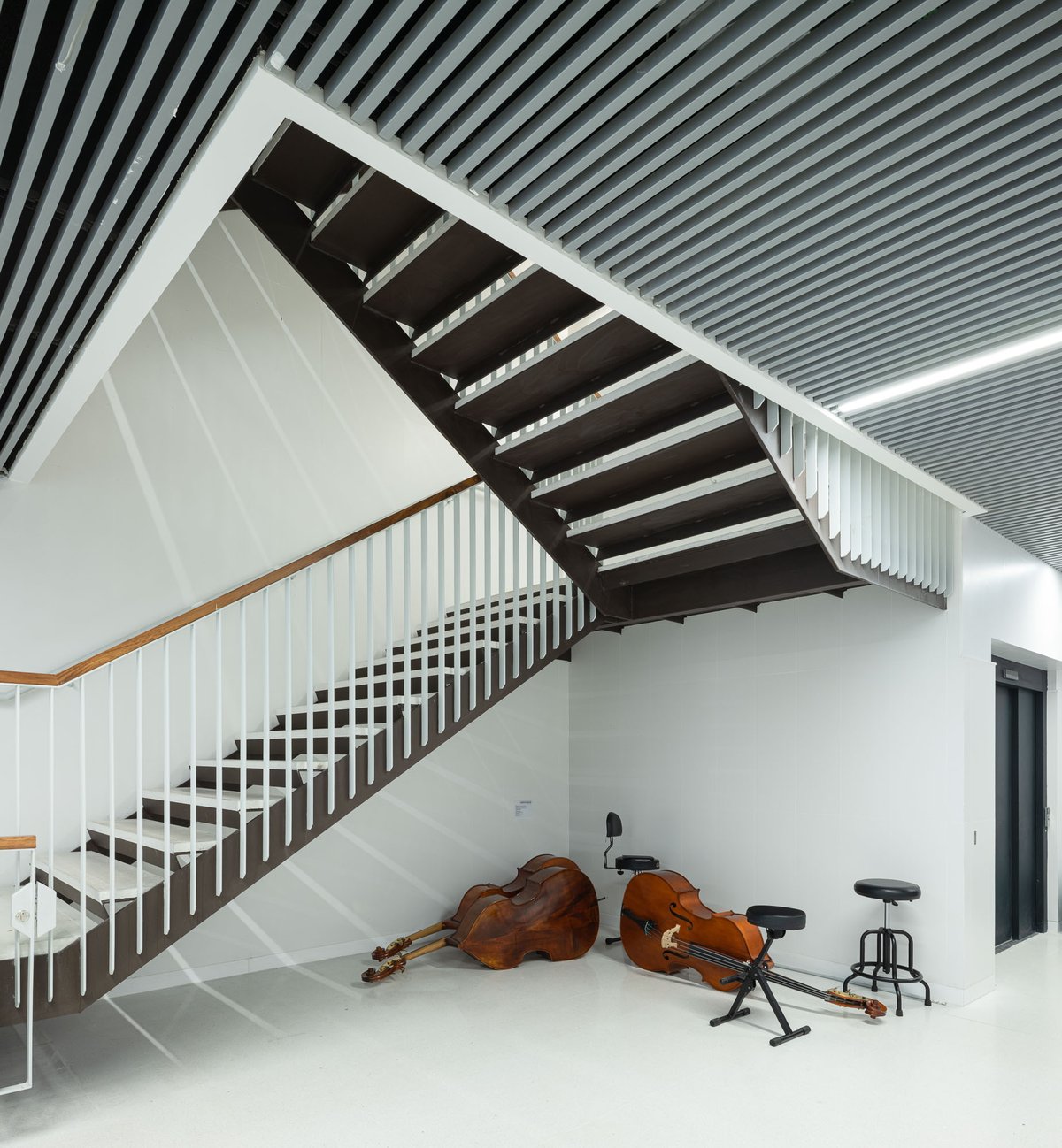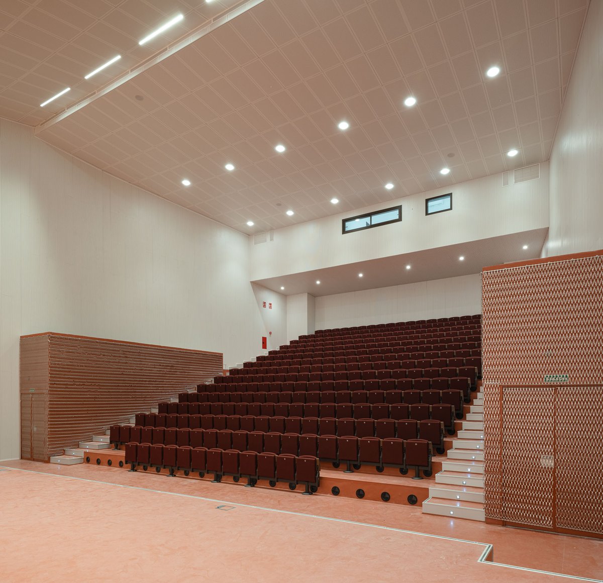 El acceso al auditorio se puede independizar de las circulaciones por el resto del edifico mediante tres paneles móviles de madera, para su utilización fuera del horario escolar. La disposición contigua del auditorio, aula de orquesta, percusión, conjunto y almacenes permite el fácil traslado entre éstas de instrumentos voluminosos.