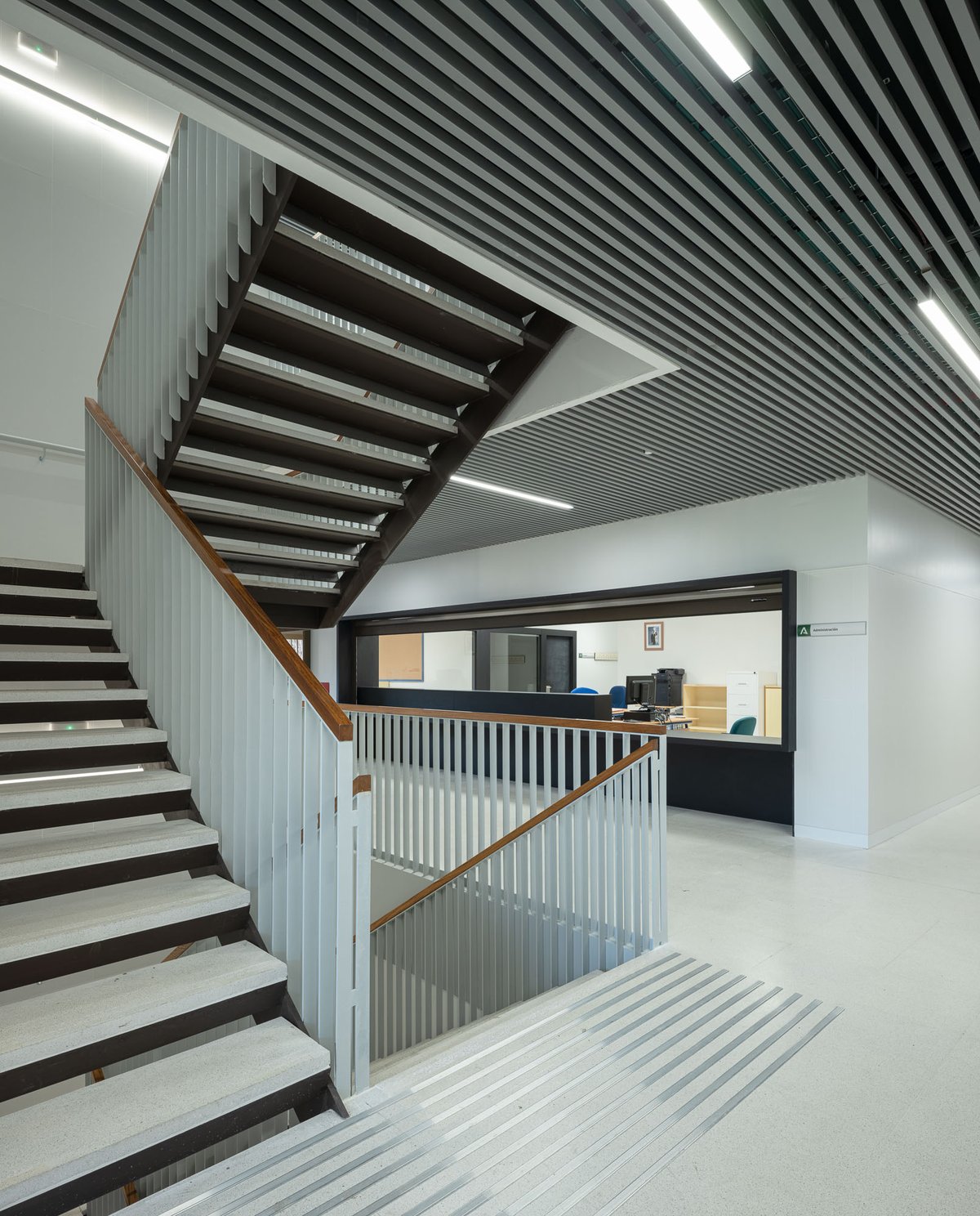 La situación del vestíbulo principal, permite organizar desde éste las distintas circulaciones, tanto a la zona docente como a la administración y servicios comunes.