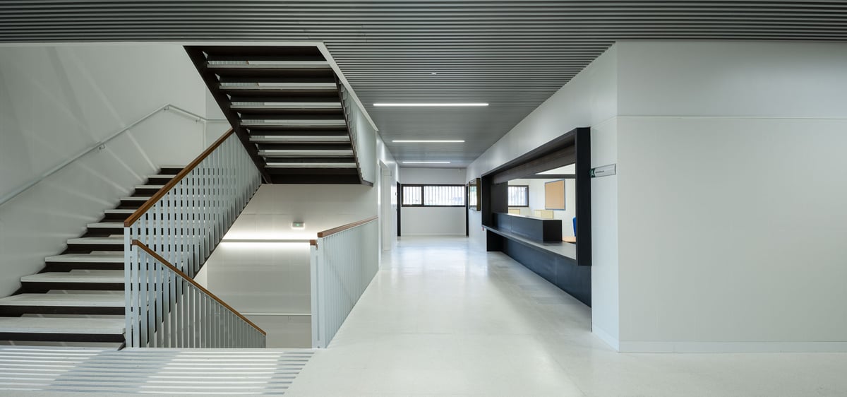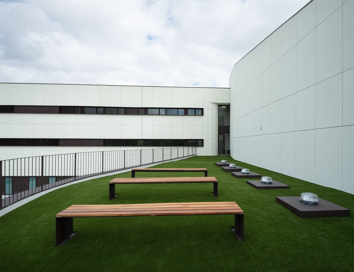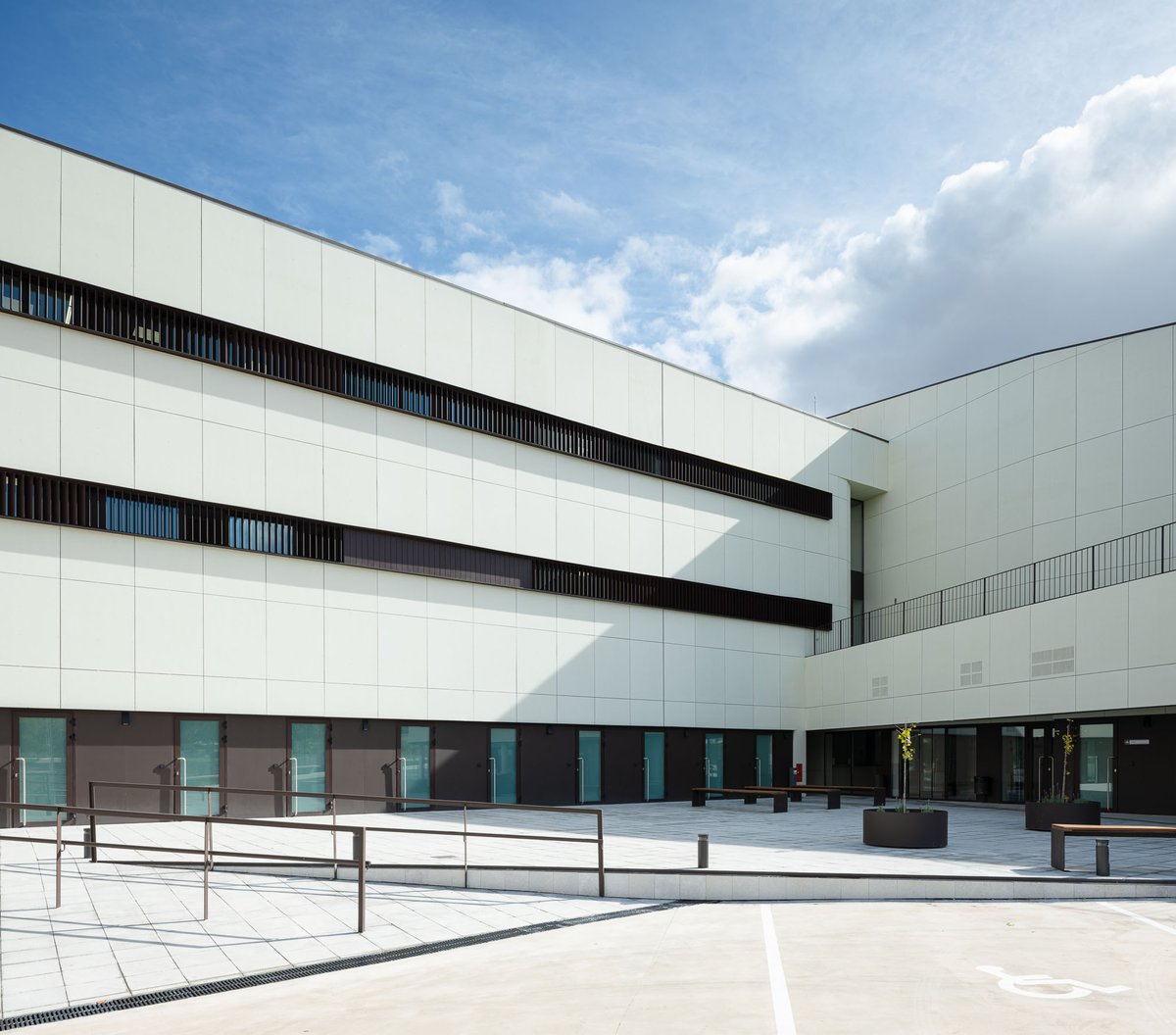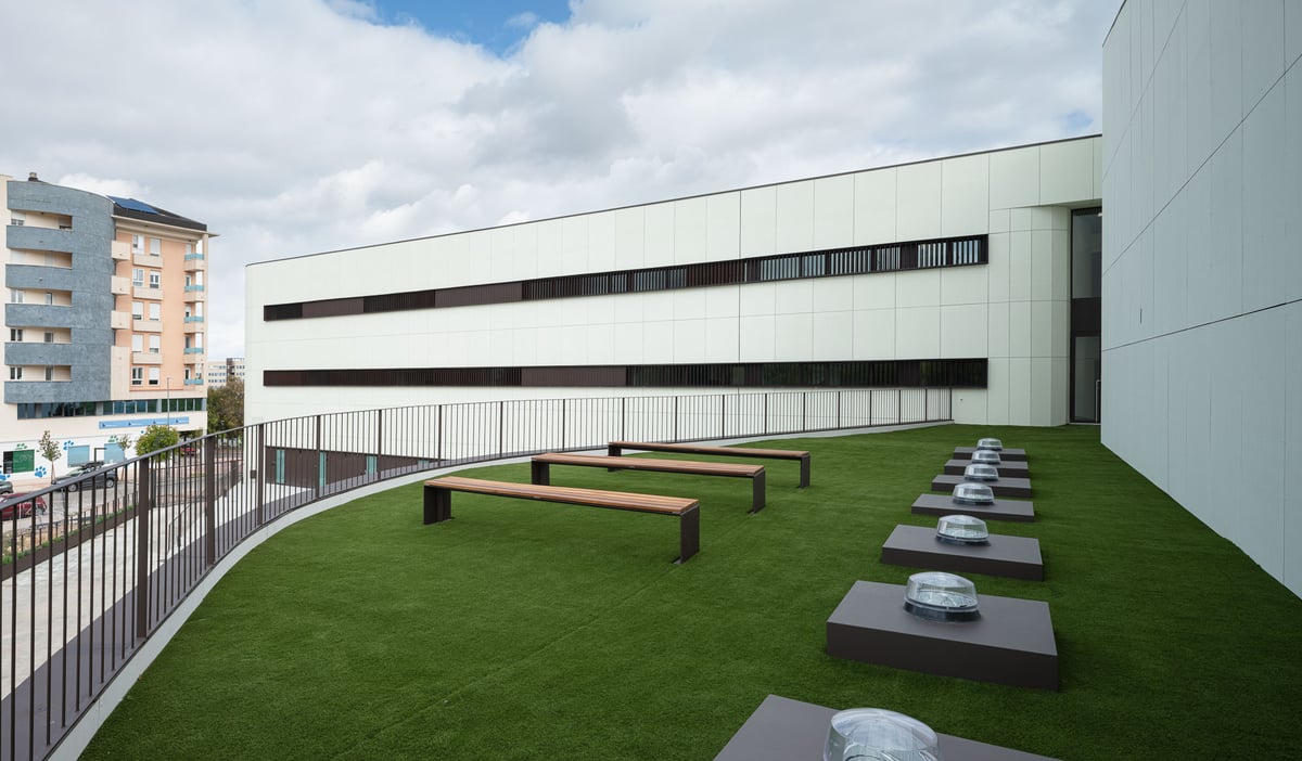 El desarrollo del edificio permite que, tanto en la entrada principal como en las secundarias y el espacio ajardinado central, se resuelvan las pendientes de forma accesible.