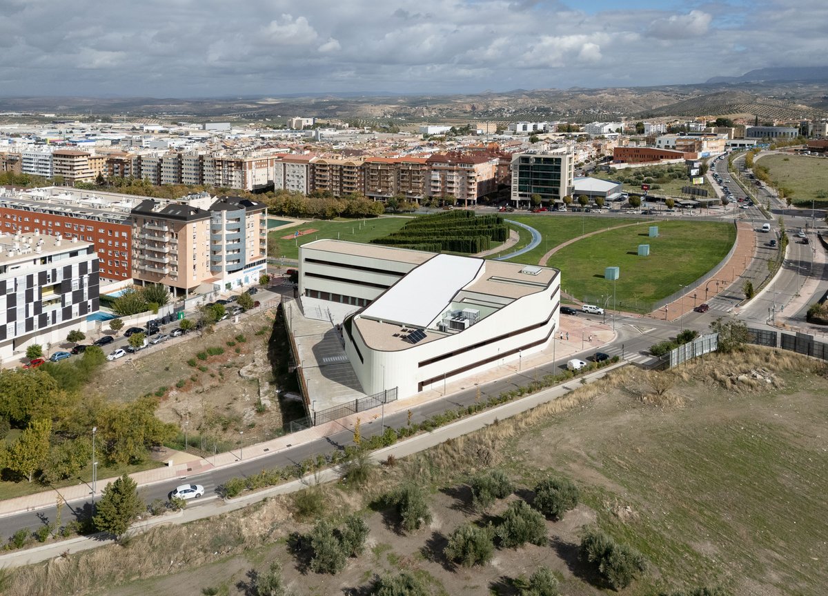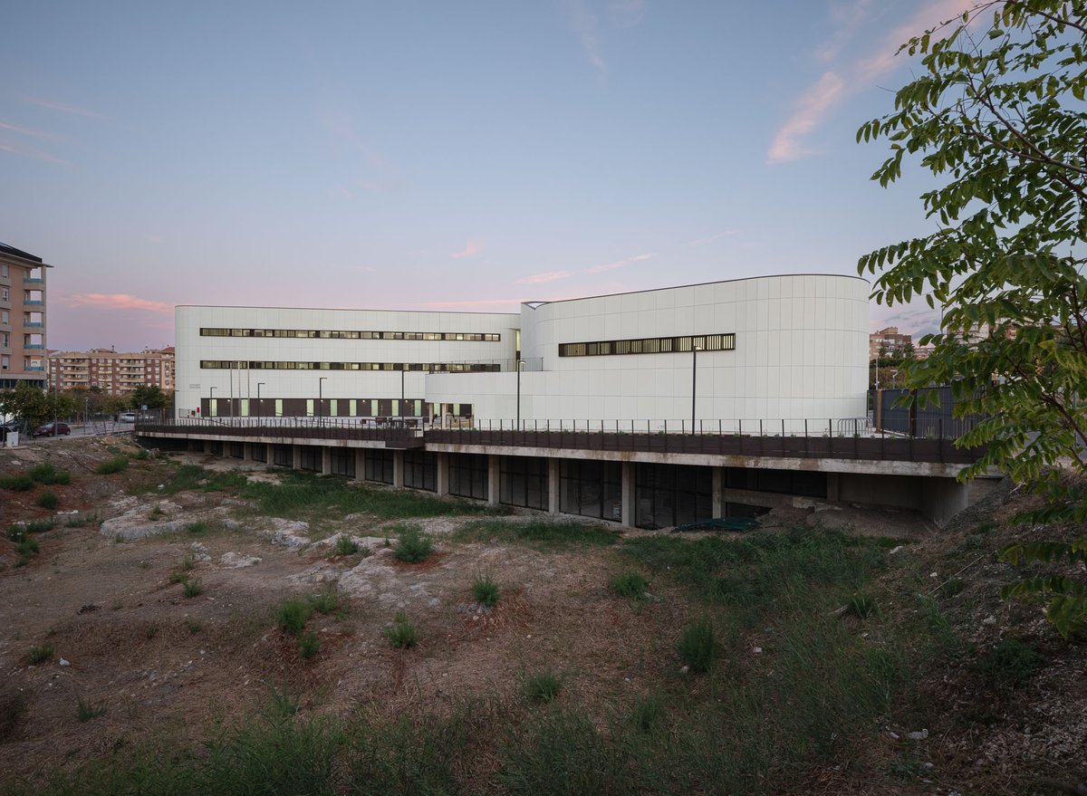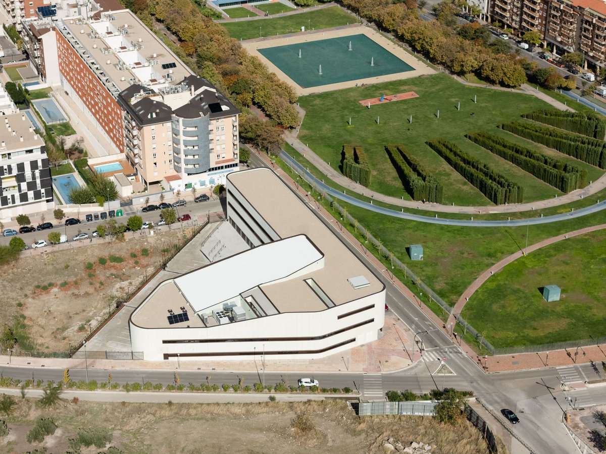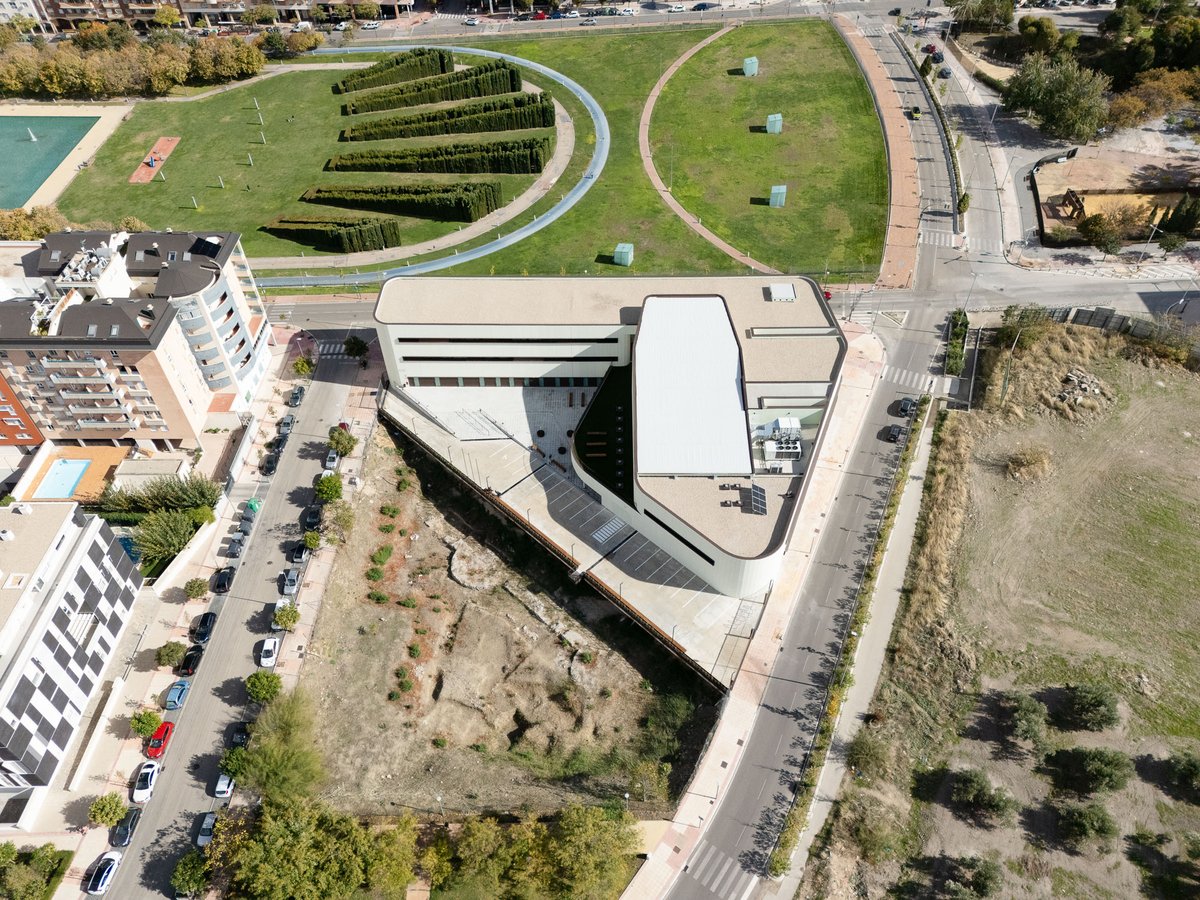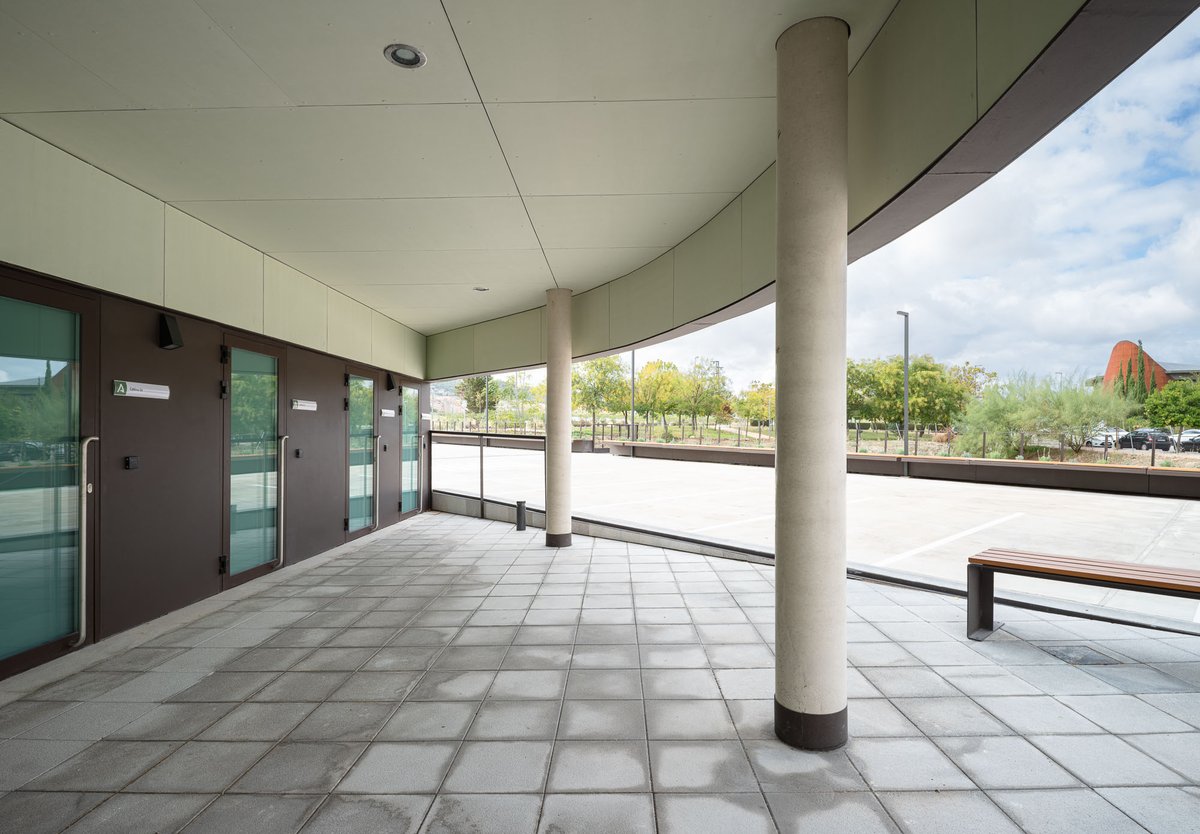El edificio en forma de ‘L’ se vuelca interiormente hacia un gran espacio de encuentro y convivencia de la comunidad docente transmitiendo la serenidad que el edificio público requiere, y actuando como un referente visual que permite contemplar los restos arqueológicos y las cabinas de ensayo de los alumnos. El porche de circulación, dimensionado generosamente, comunica el edificio con este espacio exterior, reforzando su uso con la disposición de la cafetería y la azotea transitable (espacio de descanso y esparcimiento de la comunidad educativa).