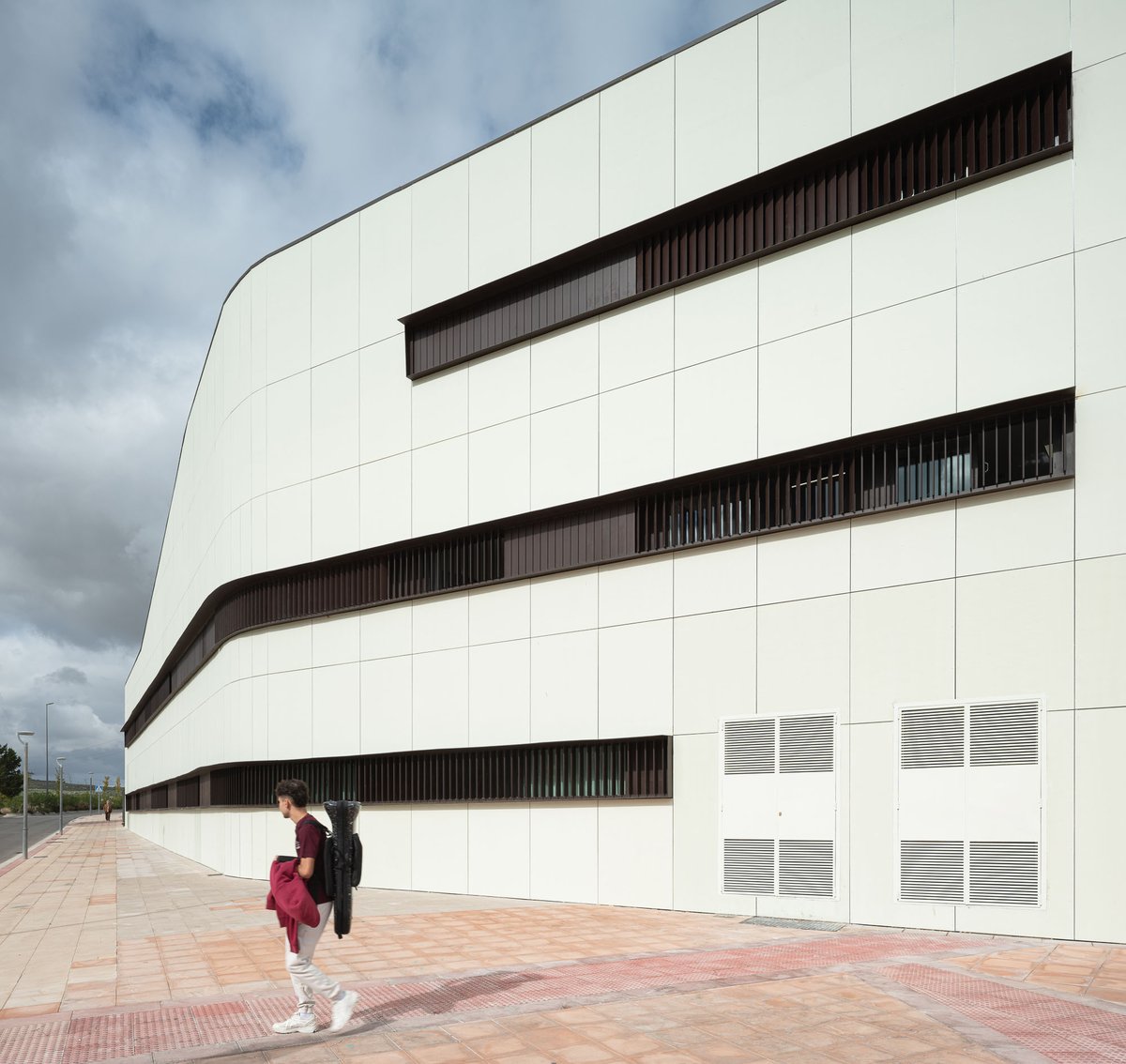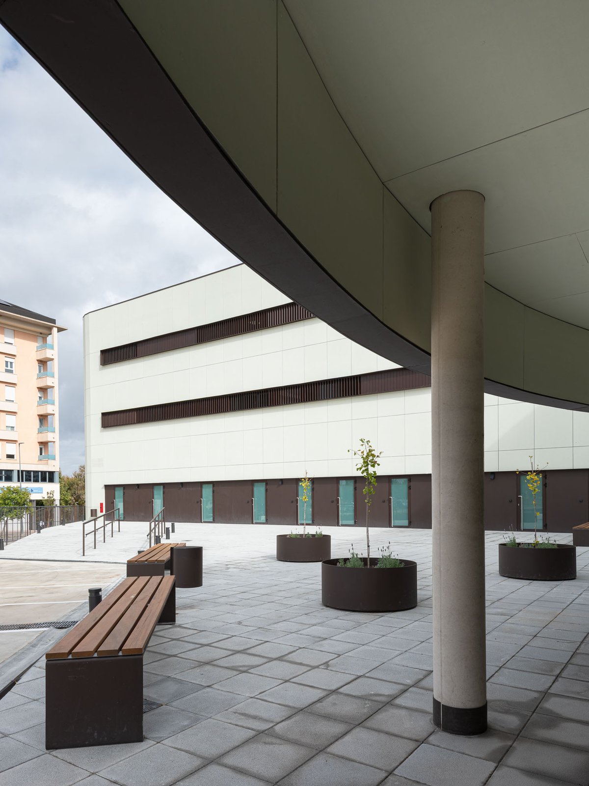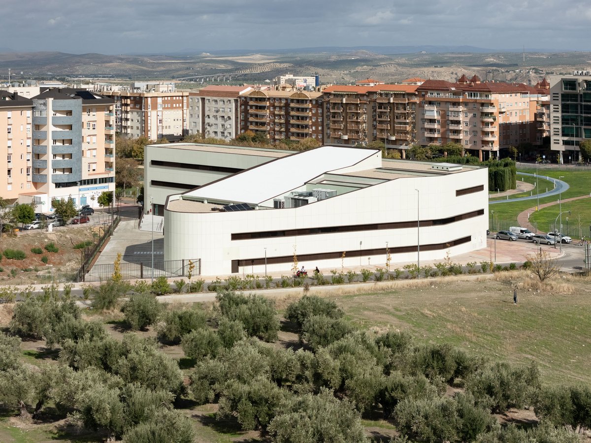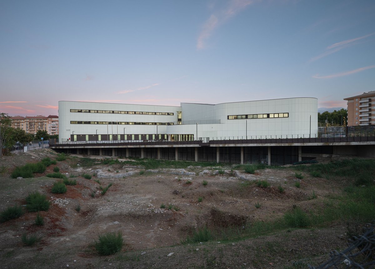 El edificio en forma de ‘L’ se vuelca interiormente hacia un gran espacio de encuentro y convivencia de la comunidad docente transmitiendo la serenidad que el edificio público requiere, y actuando como un referente visual que permite contemplar los restos arqueológicos y las cabinas de ensayo de los alumnos. El porche de circulación, dimensionado generosamente, comunica el edificio con este espacio exterior, reforzando su uso con la disposición de la cafetería y la azotea transitable (espacio de descanso y esparcimiento de la comunidad educativa).