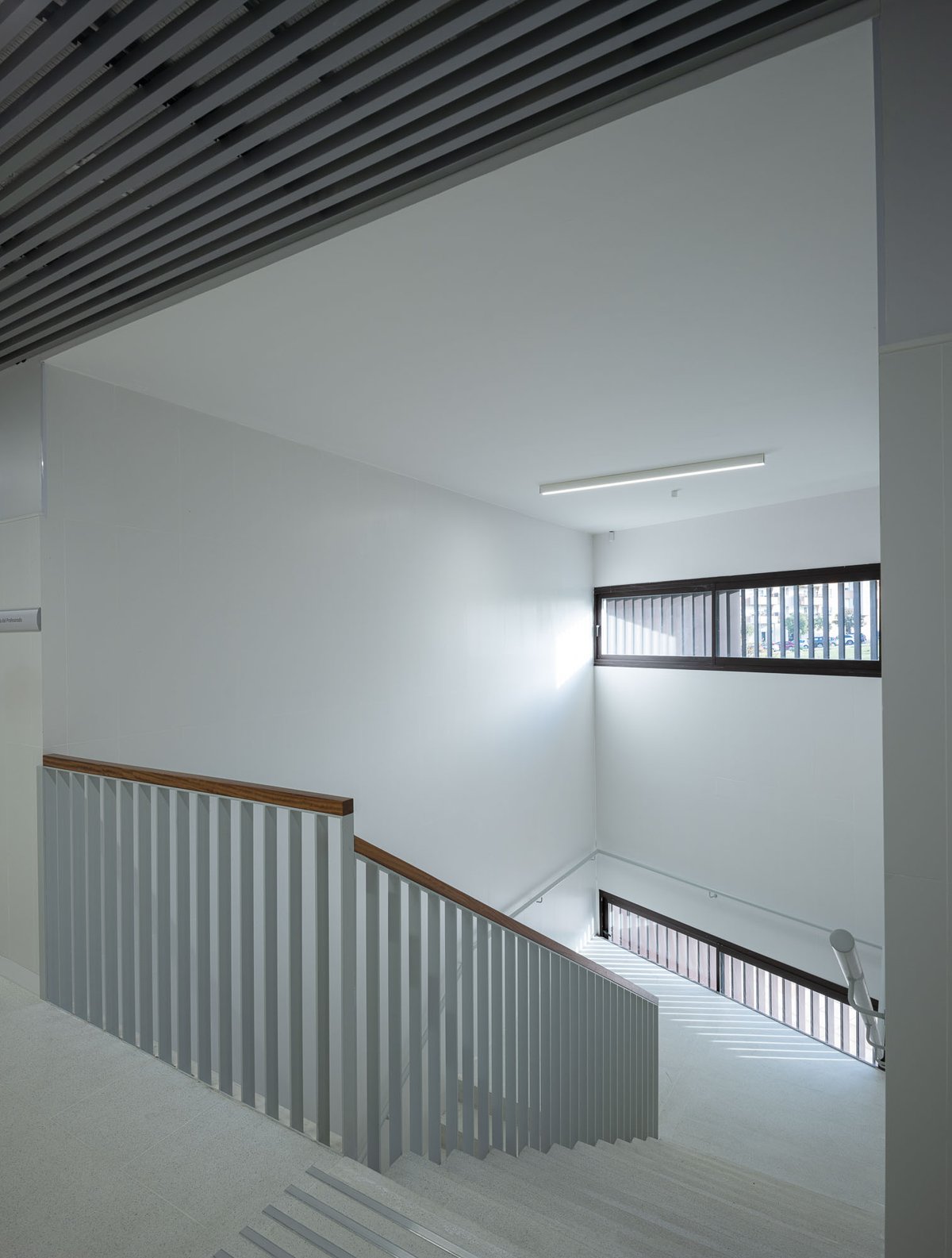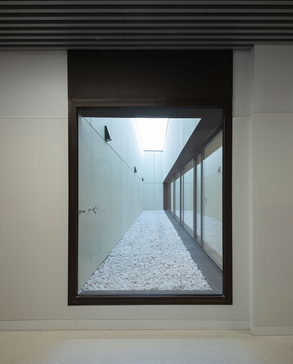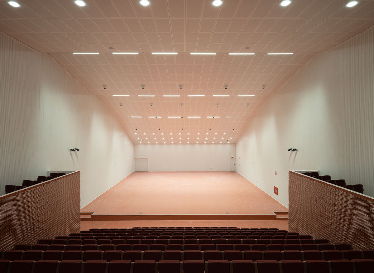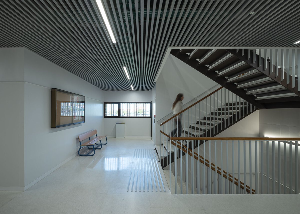 El edificio en forma de ‘L’ se vuelca interiormente hacia un gran espacio de encuentro y convivencia de la comunidad docente transmitiendo la serenidad que el edificio público requiere, y actuando como un referente visual que permite contemplar los restos arqueológicos y las cabinas de ensayo de los alumnos. El porche de circulación, dimensionado generosamente, comunica el edificio con este espacio exterior, reforzando su uso con la disposición de la cafetería y la azotea transitable (espacio de descanso y esparcimiento de la comunidad educativa).