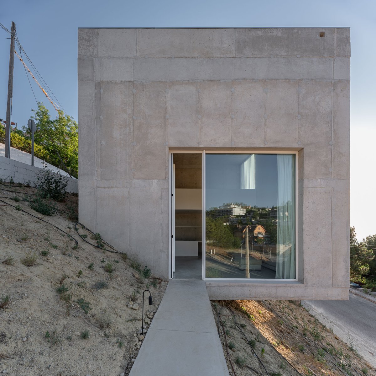 La casa se resuelve como un cubo de ocho metros de lado, dispuesto en el único punto ancho de la parcela, asentado en la zona con mayor pendiente y liberando todo el terreno restante.