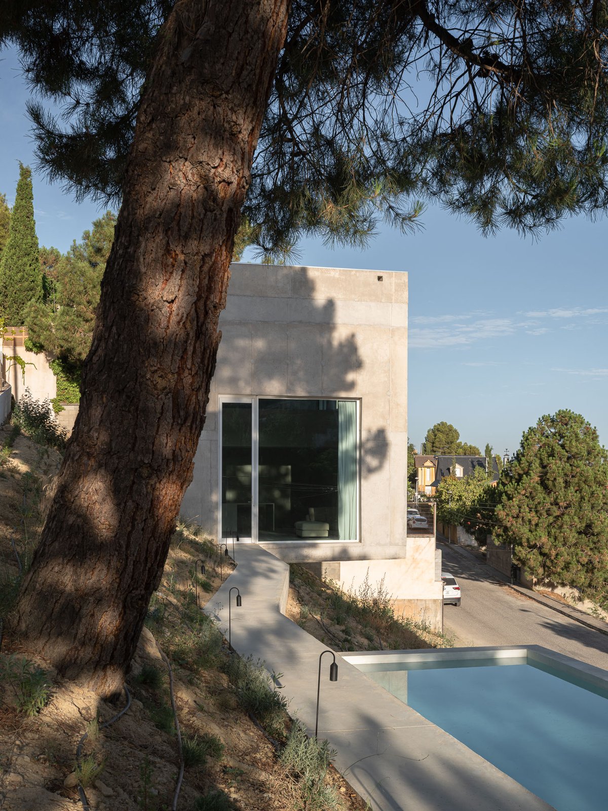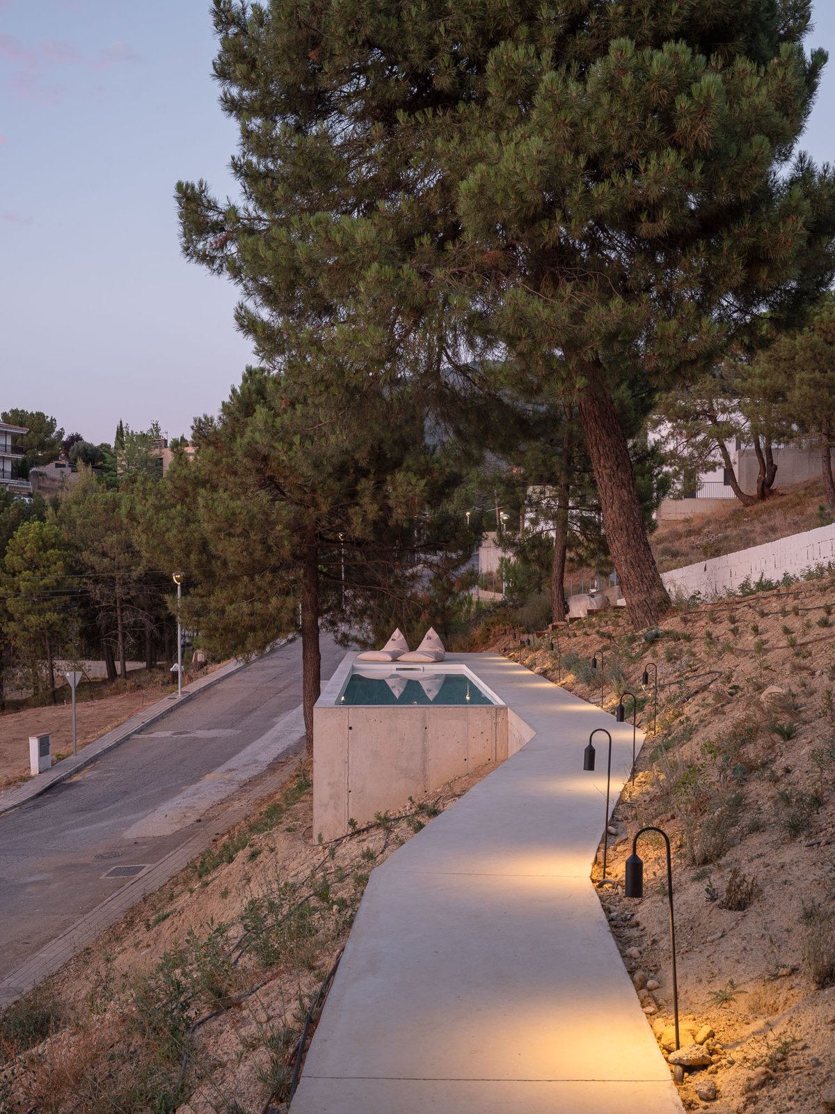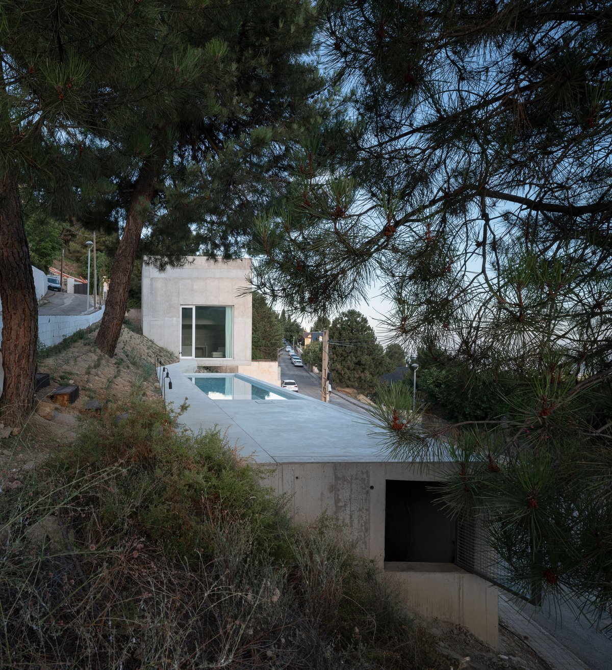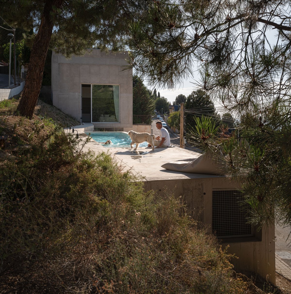 Para ello, el proyecto propone dos maneras complementarias de habitar, articuladas por una única pieza continua de hormigón que recorre la pendiente y conecta los distintos modos de estar en el paisaje. Pedro ocupa un volumen incrustado en la ladera, al que se accede desde la calle por una pasarela a una cota intermedia, mientras que Enzo y Duna encuentran refugio en una cueva fresca, excavada parcialmente en el terreno y conectada con el paisaje natural. Entre ambos espacios aparece una alberca, que funciona a la vez como plataforma, mirador, lugar de encuentro y de baño, pero sobre todo como un umbral entre el mundo del hombre y el de los perros, entre lo construido y lo salvaje. La ladera, libre de intervención, queda para el uso de los perros: un paisaje a la sombra de los pinos y la casa, de tierra y vegetación espontánea, donde pueden correr, descansar y jugar.