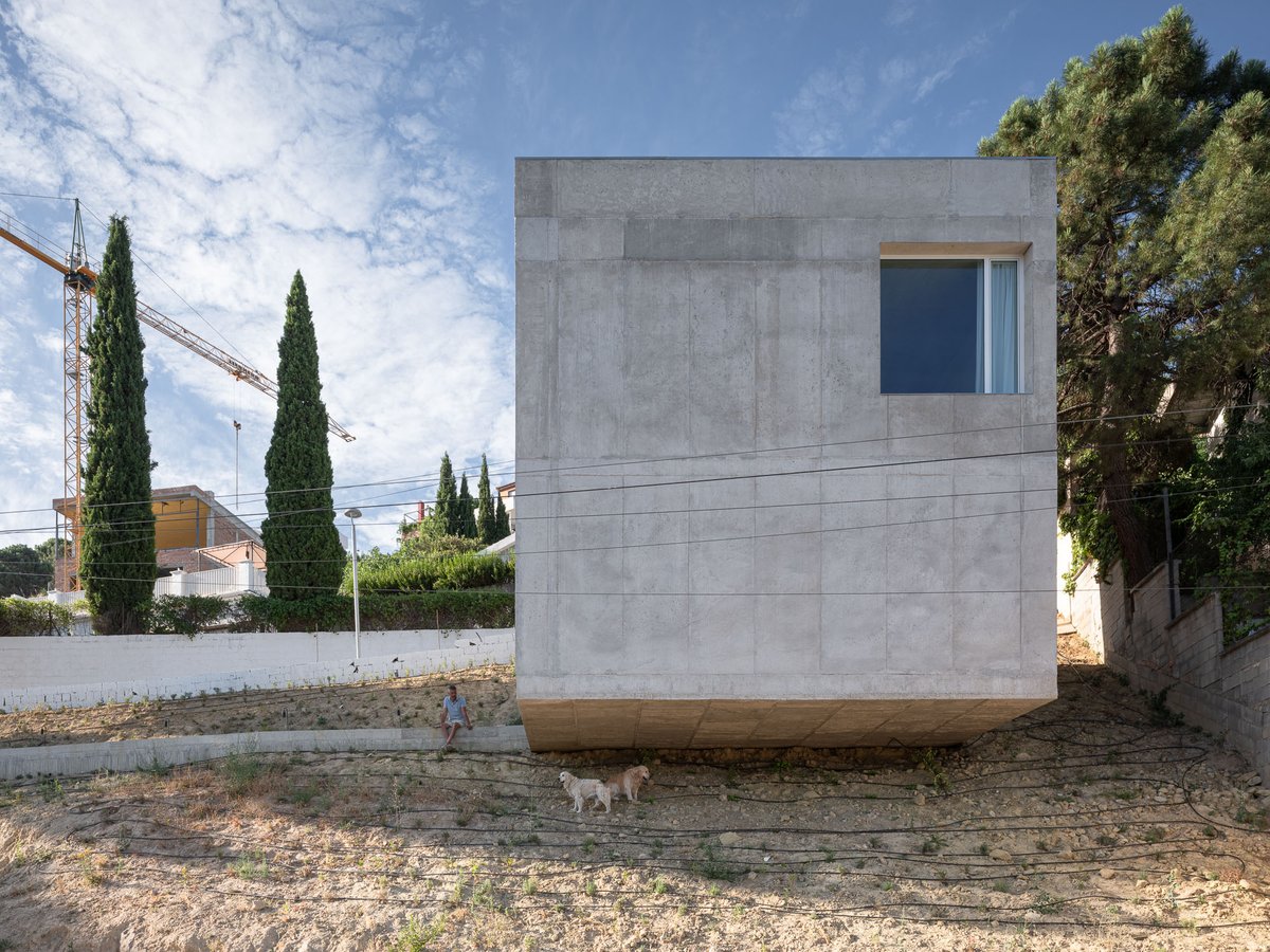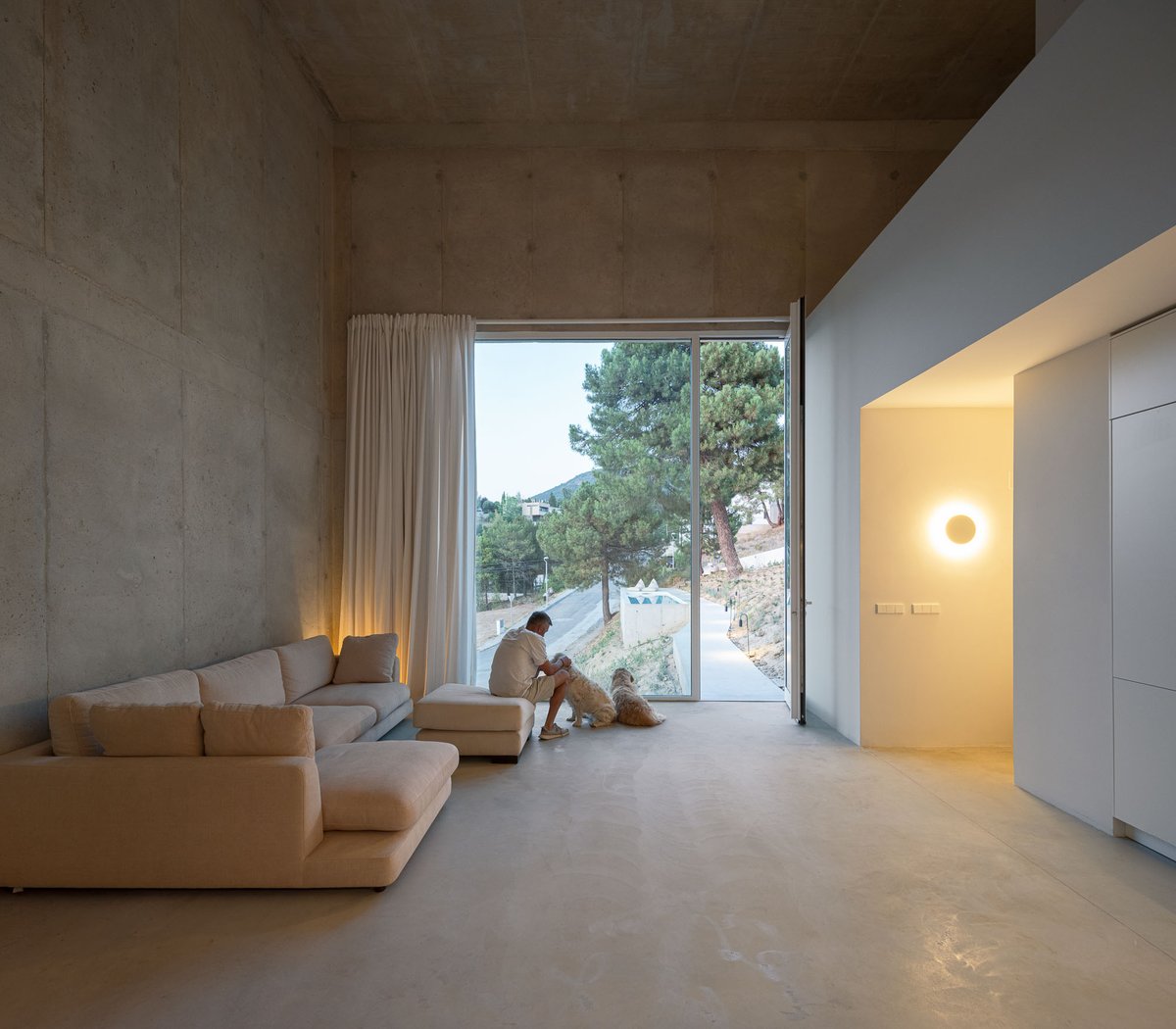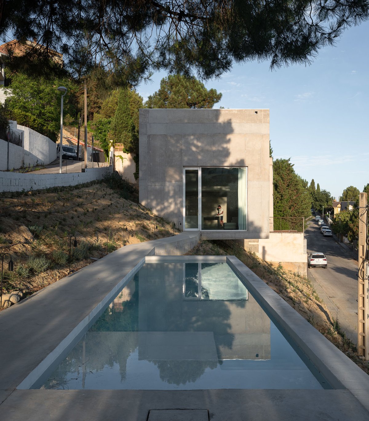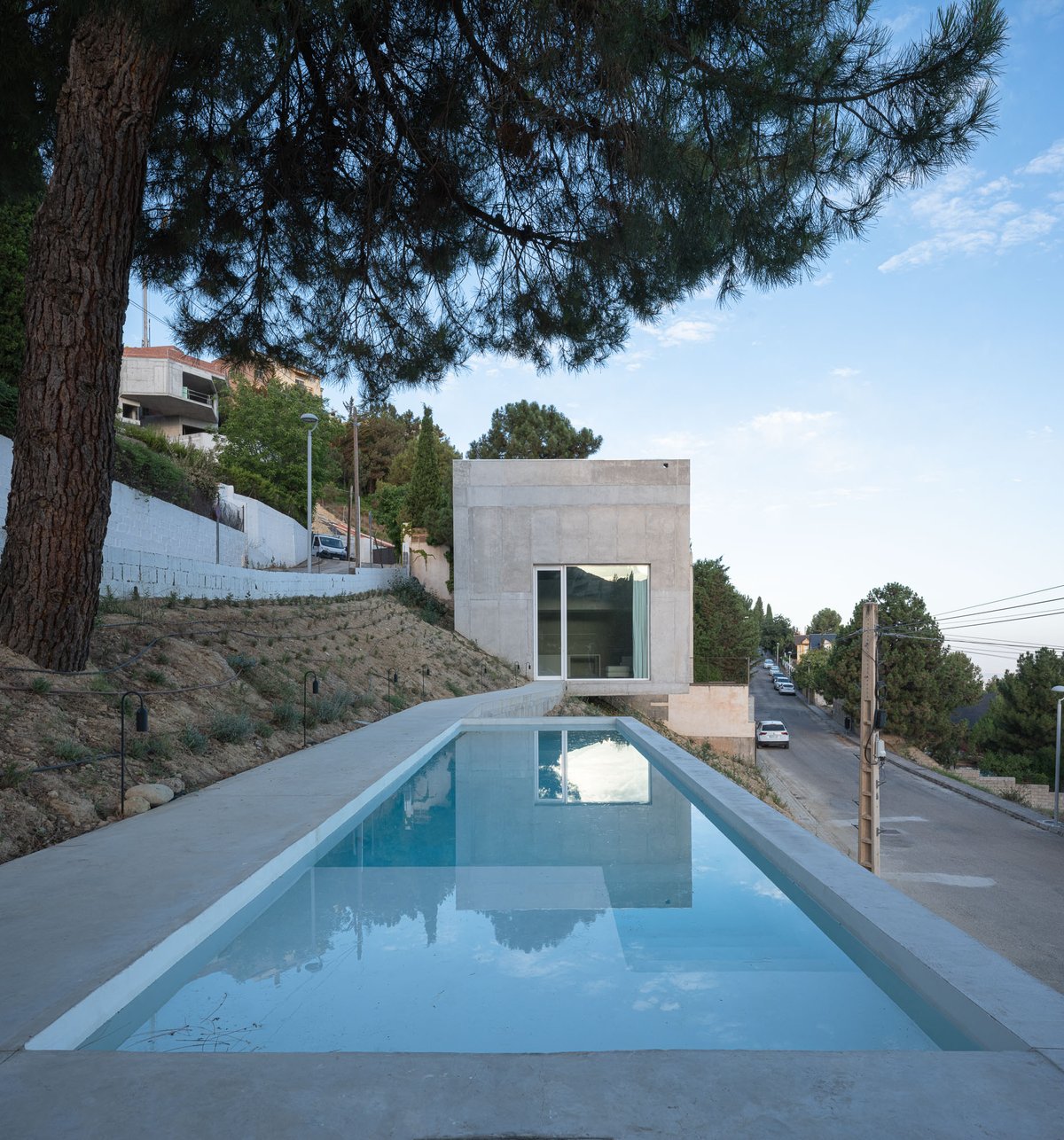 Para ello, el proyecto propone dos maneras complementarias de habitar, articuladas por una única pieza continua de hormigón que recorre la pendiente y conecta los distintos modos de estar en el paisaje. Pedro ocupa un volumen incrustado en la ladera, al que se accede desde la calle por una pasarela a una cota intermedia, mientras que Enzo y Duna encuentran refugio en una cueva fresca, excavada parcialmente en el terreno y conectada con el paisaje natural. Entre ambos espacios aparece una alberca, que funciona a la vez como plataforma, mirador, lugar de encuentro y de baño, pero sobre todo como un umbral entre el mundo del hombre y el de los perros, entre lo construido y lo salvaje. La ladera, libre de intervención, queda para el uso de los perros: un paisaje a la sombra de los pinos y la casa, de tierra y vegetación espontánea, donde pueden correr, descansar y jugar.