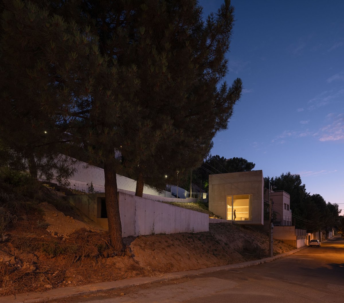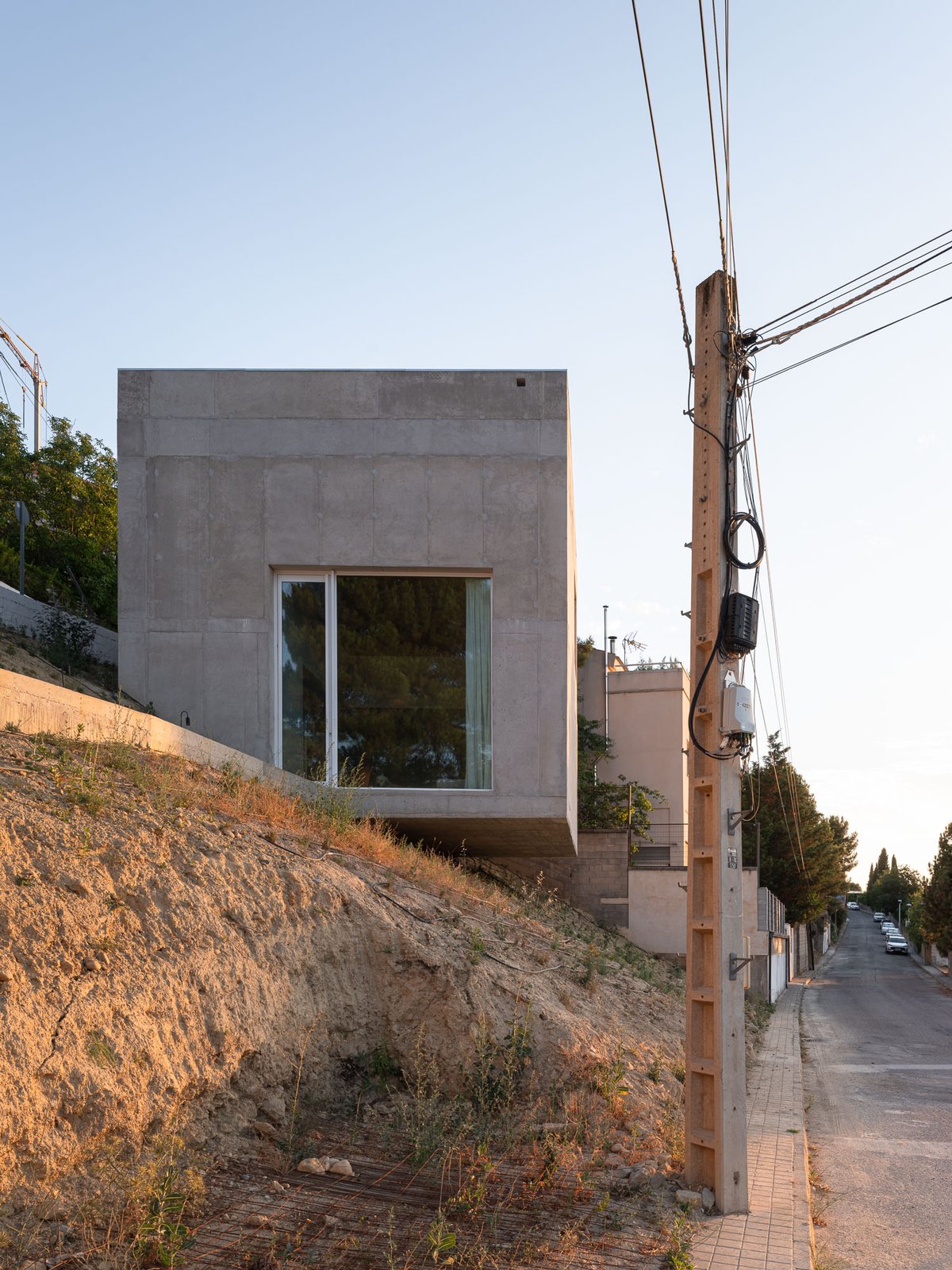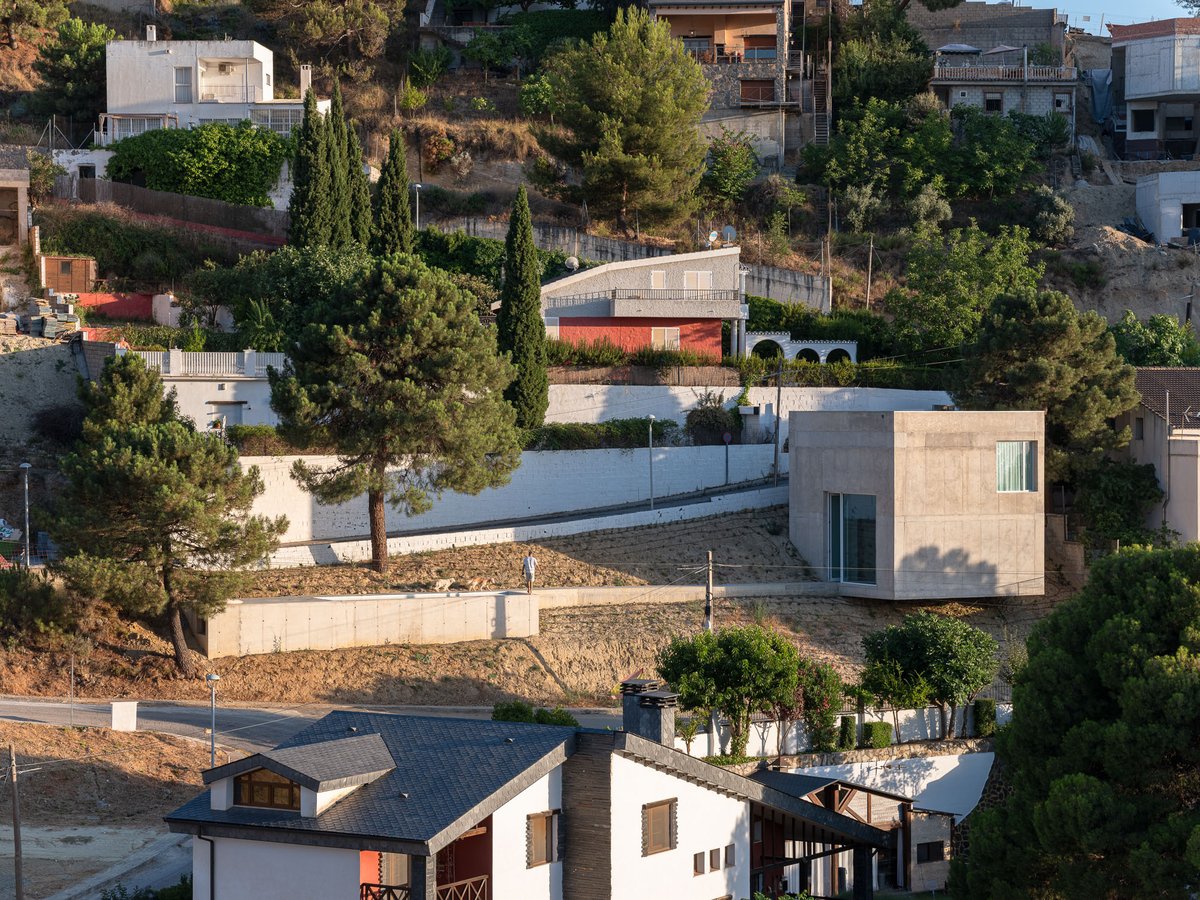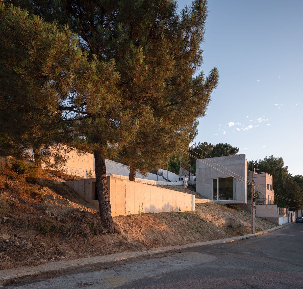 El lugar que Pedro escogió para construir su casa no parecía querer ser habitado. La geometría de la parcela, su acusada pendiente y una normativa estricta no daban la bienvenida a ningún morador. La parcela tiene una geometría difícil: un triángulo rectángulo escaleno, con lados muy desiguales —el mayor de 75 metros y el menor de apenas 17—, encajado entre las calles Cerro de las Pipas y la Cortijuela, donde los retranqueos obligatorios de tres metros en todo el perímetro reducían al mínimo la superficie edificable. Por si fuera poco, el desnivel entre las esquinas más alejadas ascendía más de diez metros, y hasta 2015 solo algunos grandes pinos y la vegetación natural ocupaban la ladera.
