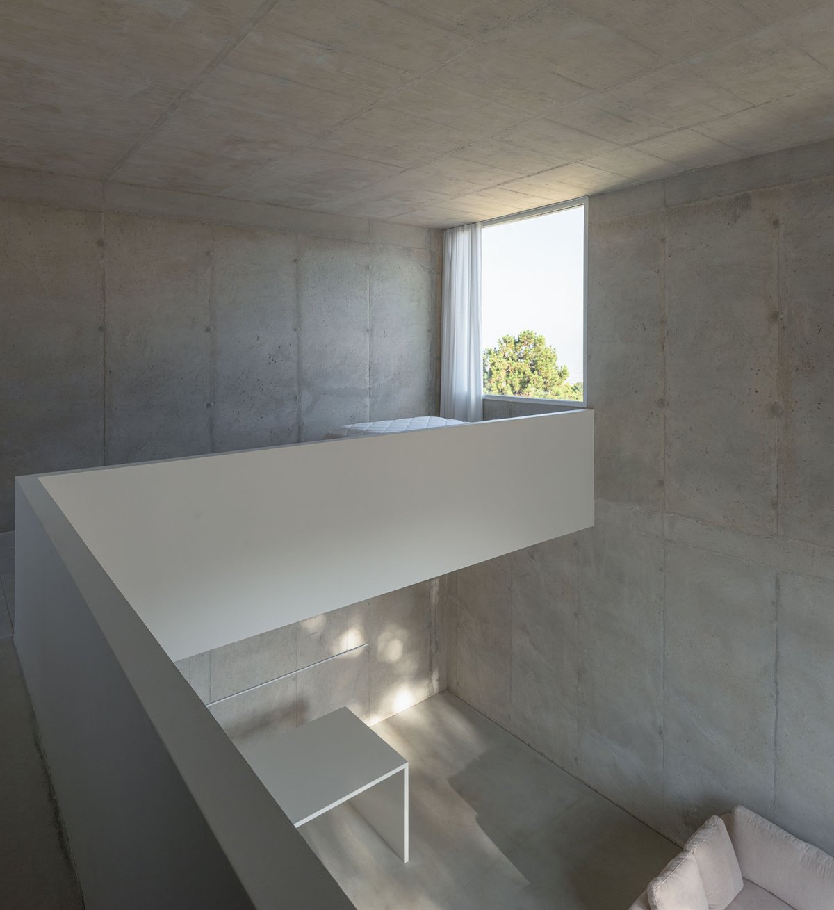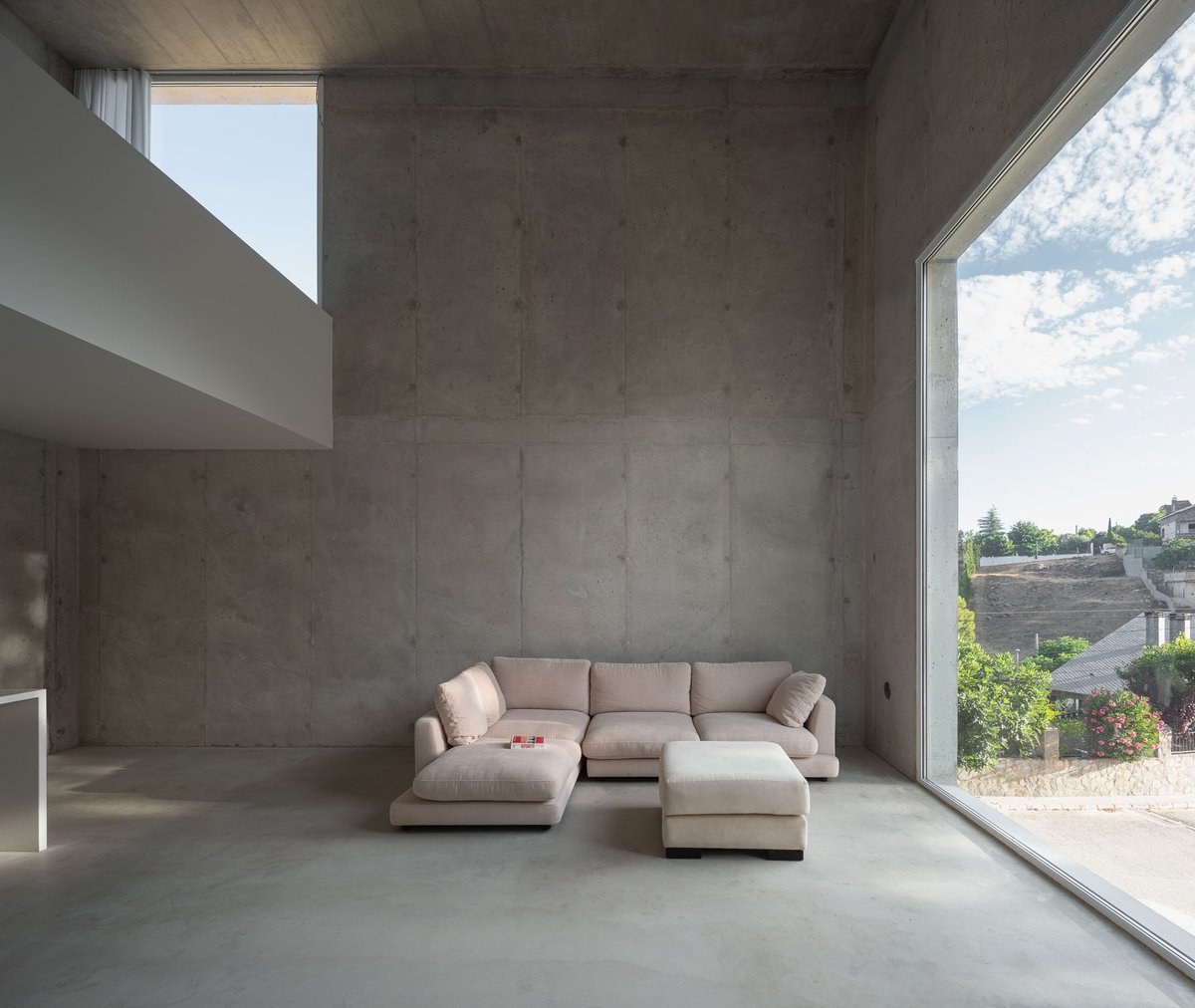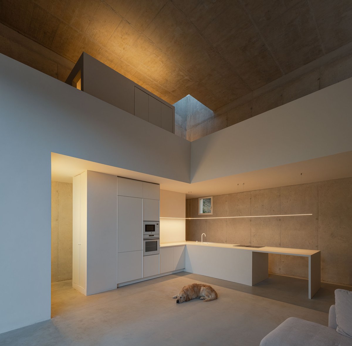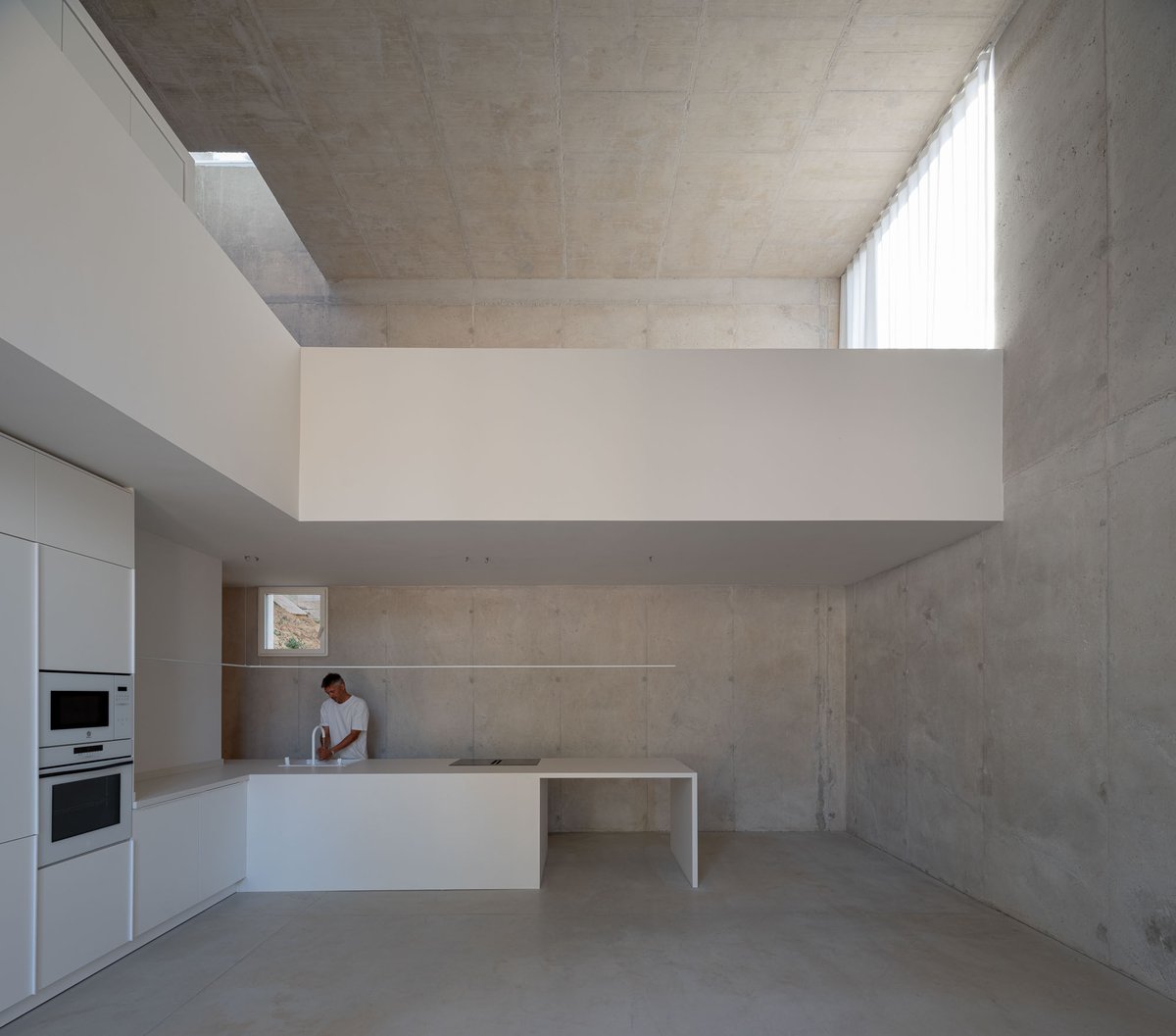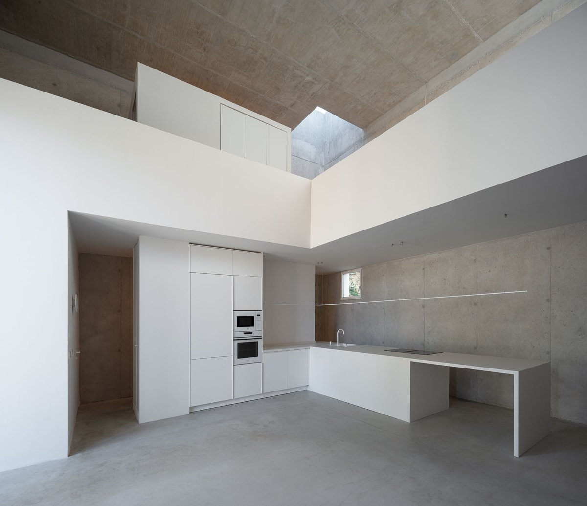 Desde ese refugio mínimo, se establece un sistema de relaciones con el entorno. Un gran hueco se abre al este, hacia el valle, recibiendo la luz del amanecer y marcando la salida hacia la plataforma mirador. Otras aperturas más pequeñas vinculan el interior con la vegetación inmediata de la ladera o con la materialidad de un muro preexistente, mientras que el volumen se vacía en su interior para generar una zona superior más íntima, elevada, desde donde Pedro puede trabajar, descansar y mirar hacia el paisaje del atardecer. La casa se ilumina cenitalmente y respira a través de una ventilación cruzada que activa la vida interior incluso en este lado norte del valle.
