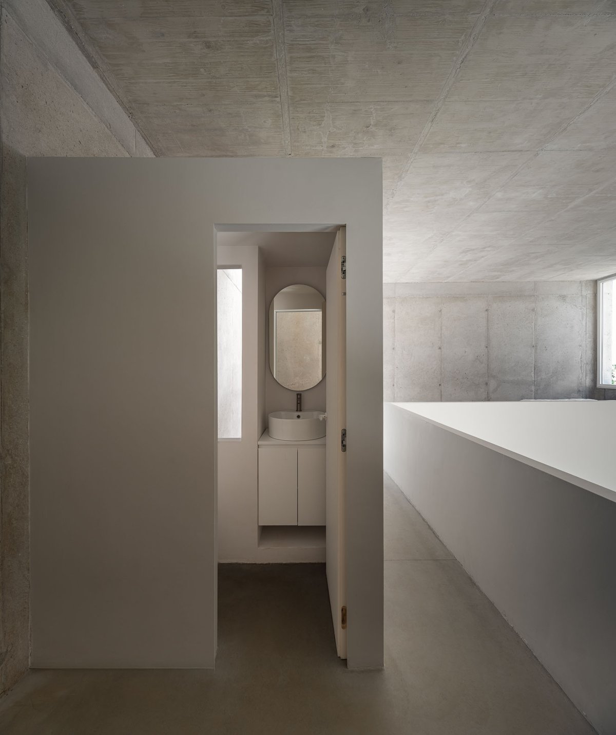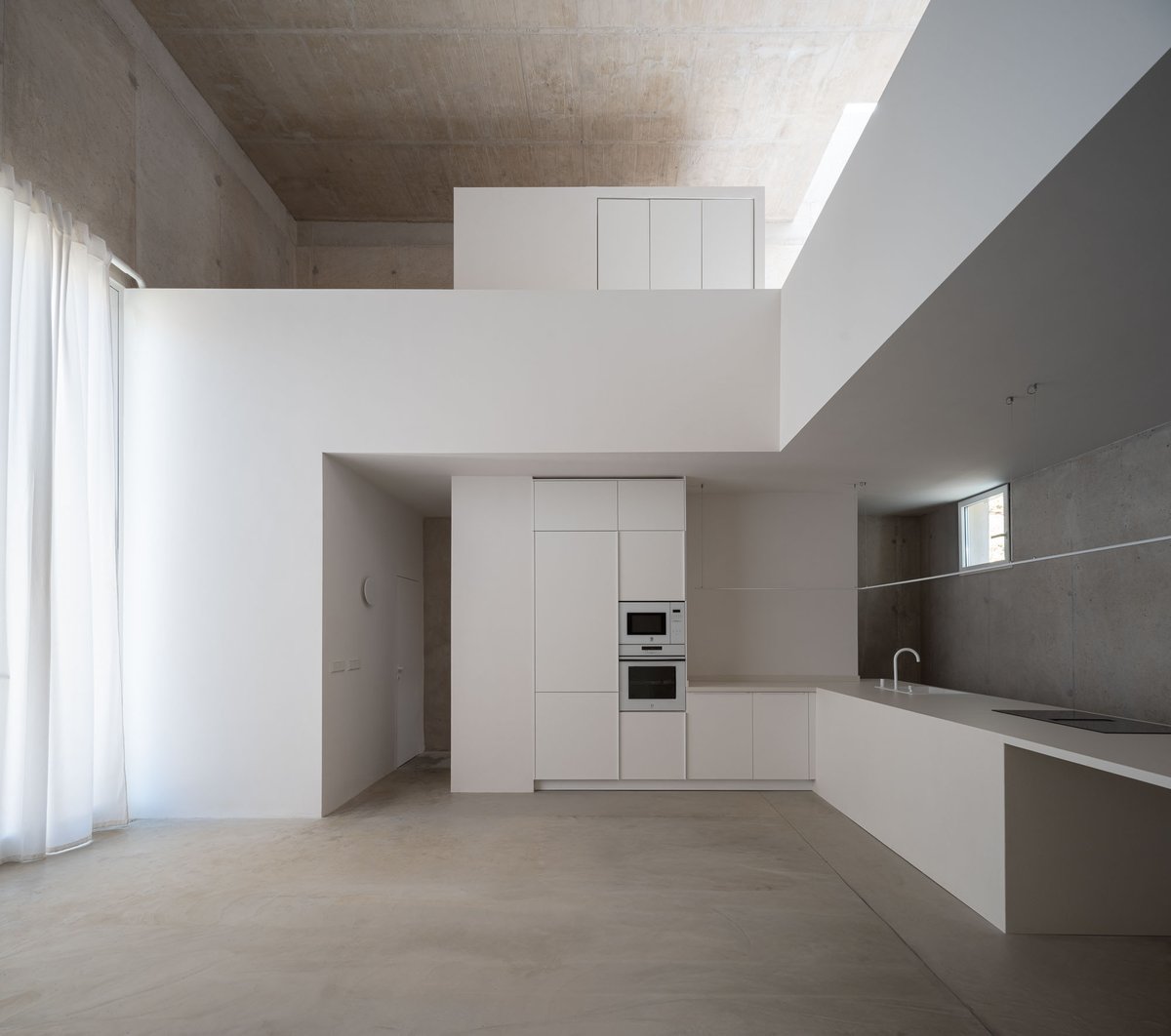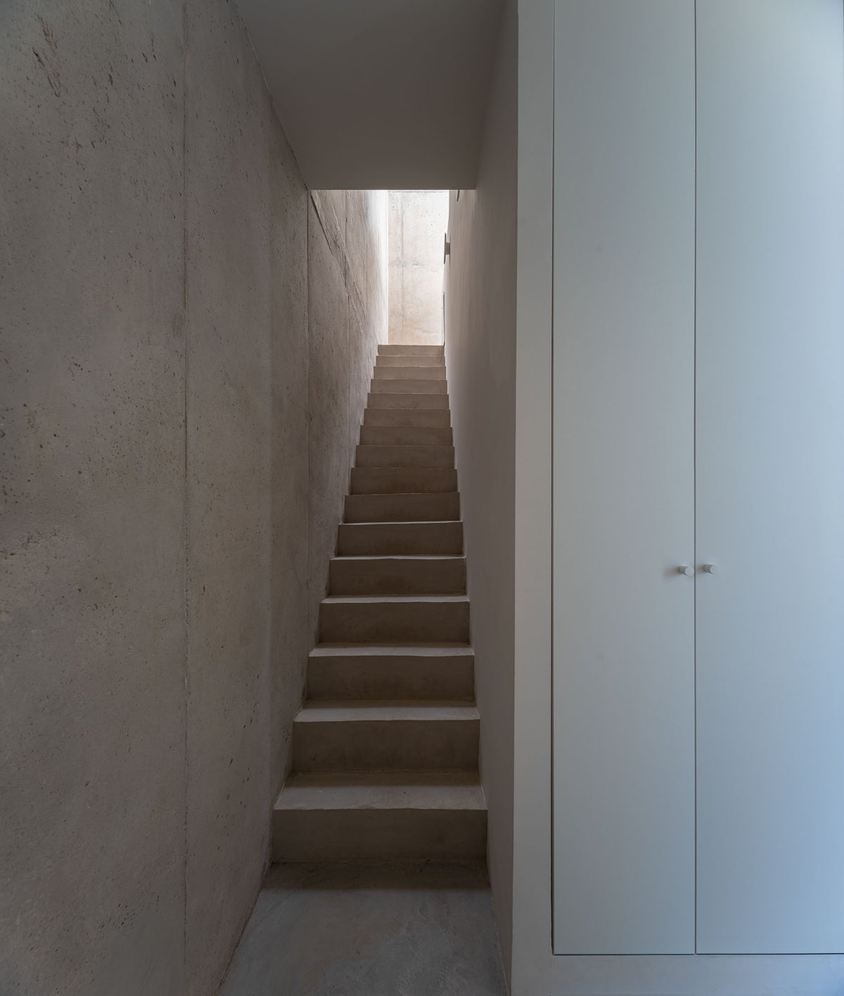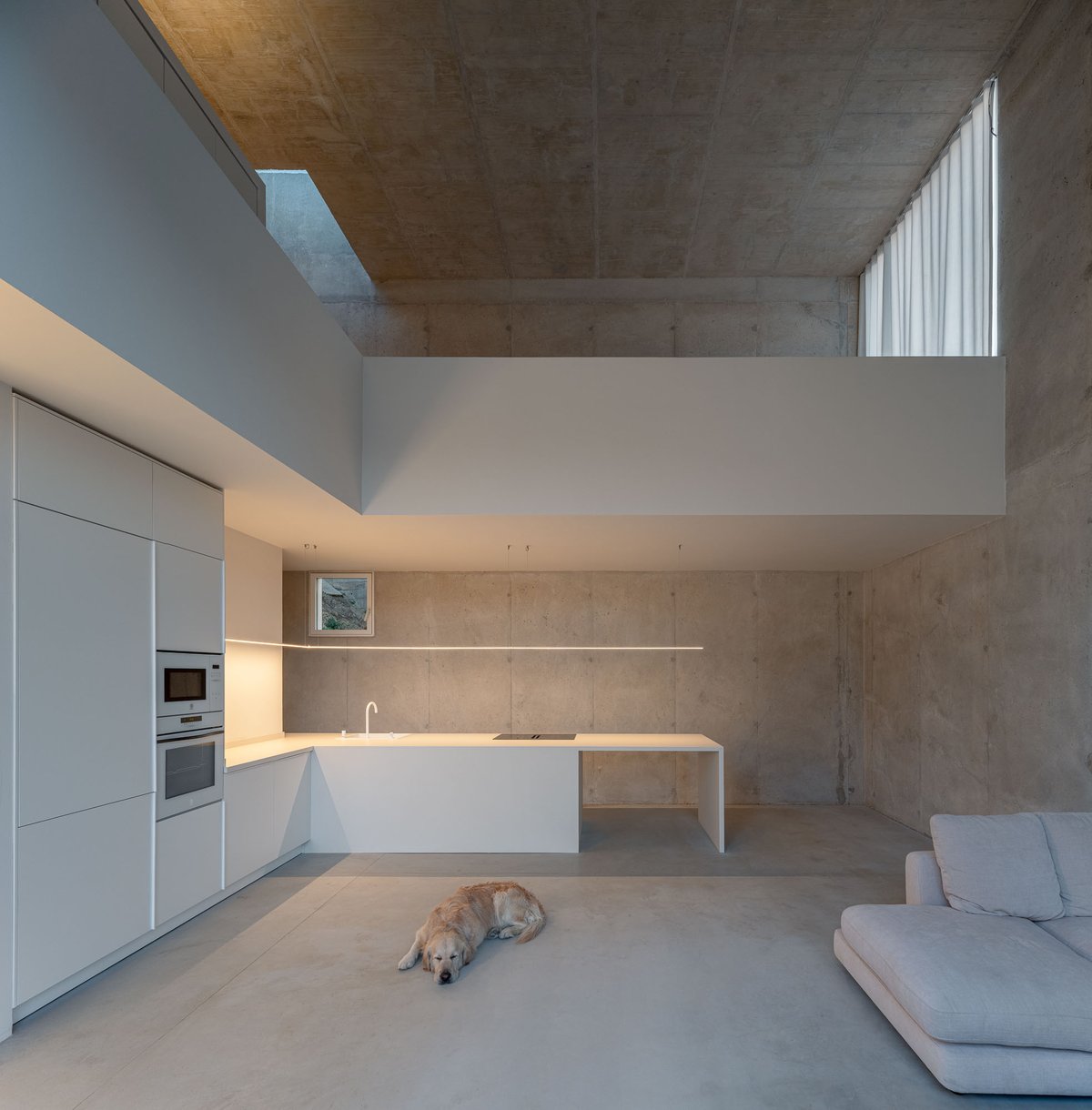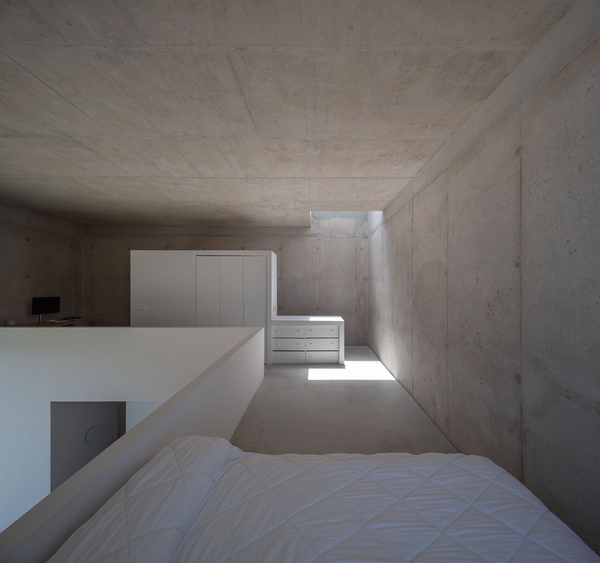 Desde ese refugio mínimo, se establece un sistema de relaciones con el entorno. Un gran hueco se abre al este, hacia el valle, recibiendo la luz del amanecer y marcando la salida hacia la plataforma mirador. Otras aperturas más pequeñas vinculan el interior con la vegetación inmediata de la ladera o con la materialidad de un muro preexistente, mientras que el volumen se vacía en su interior para generar una zona superior más íntima, elevada, desde donde Pedro puede trabajar, descansar y mirar hacia el paisaje del atardecer. La casa se ilumina cenitalmente y respira a través de una ventilación cruzada que activa la vida interior incluso en este lado norte del valle.