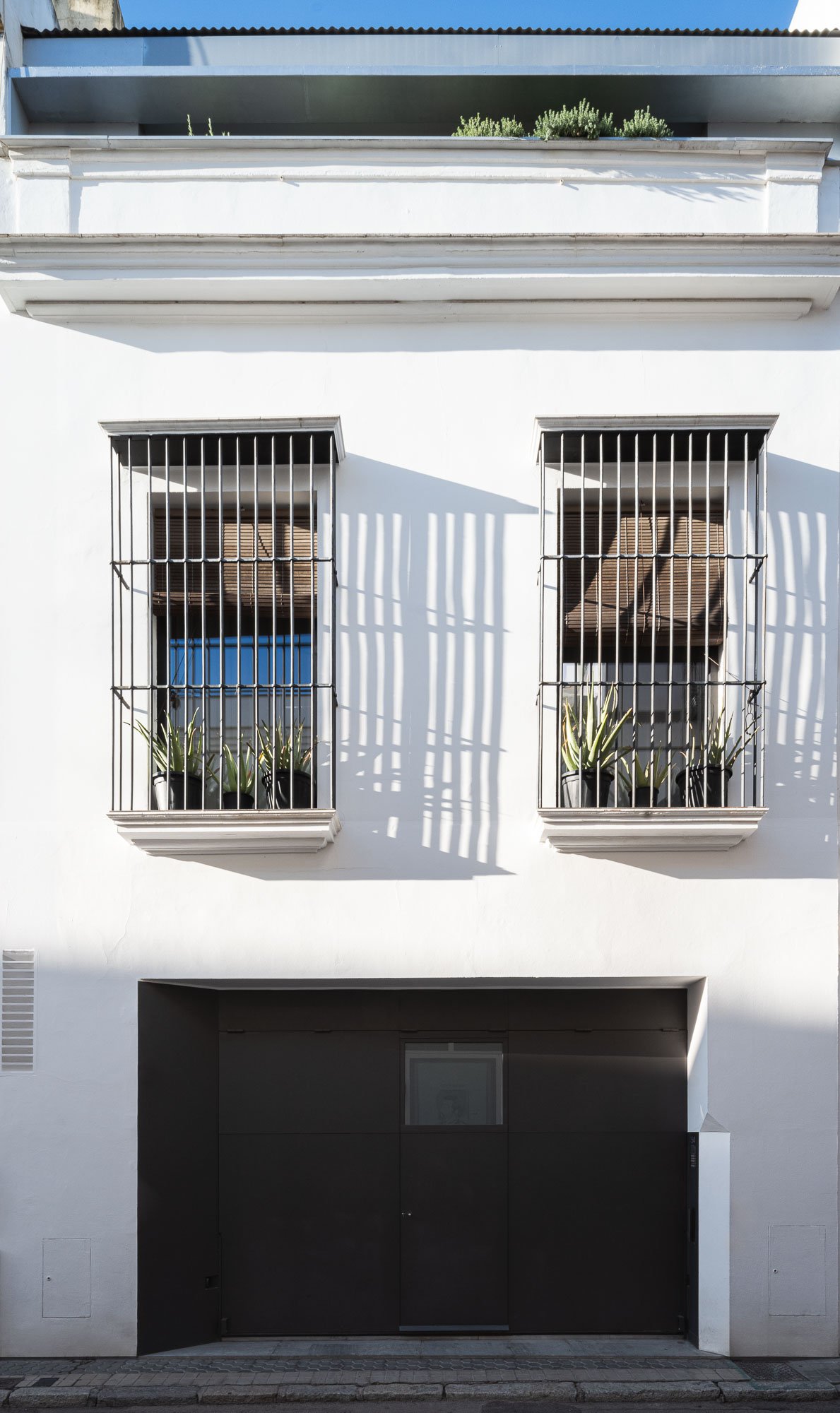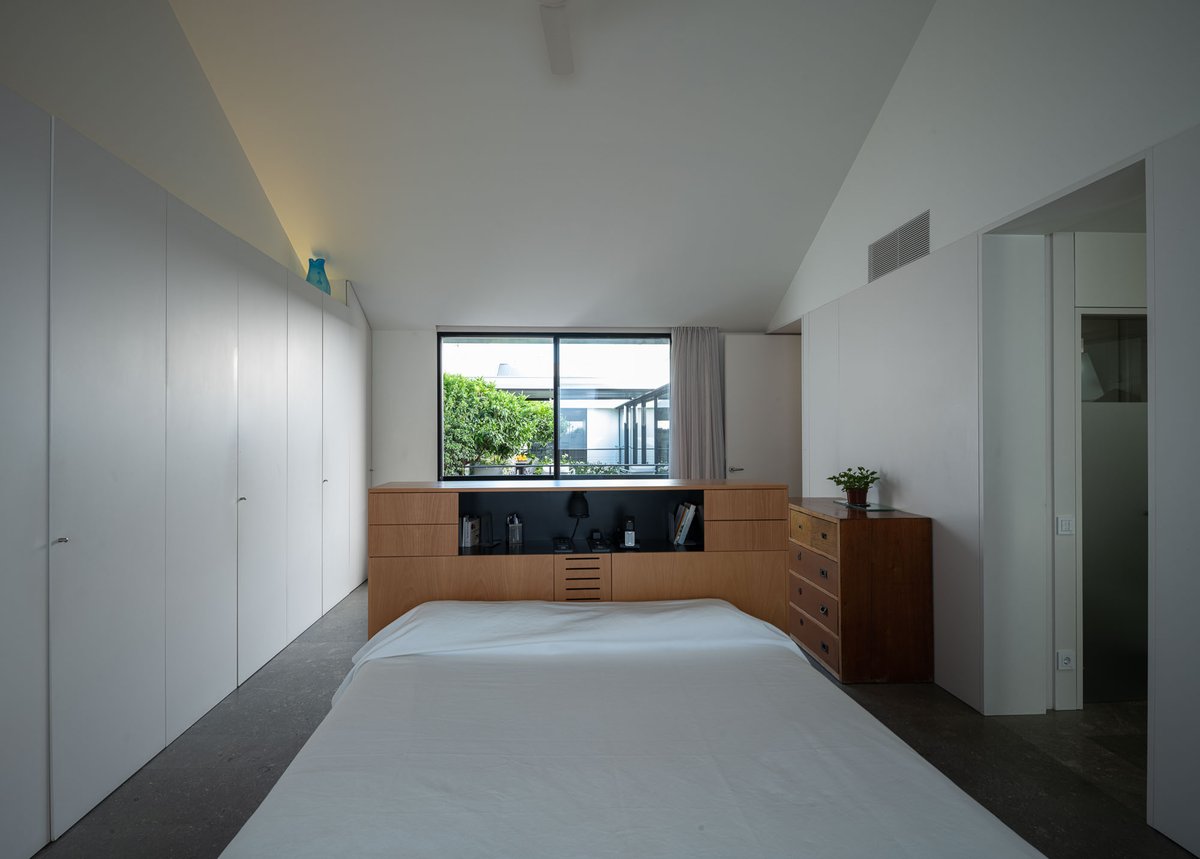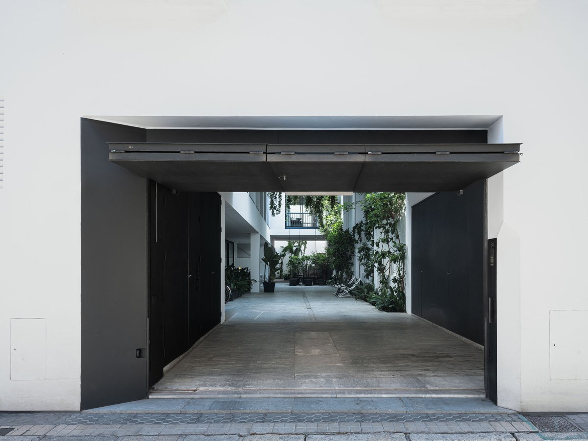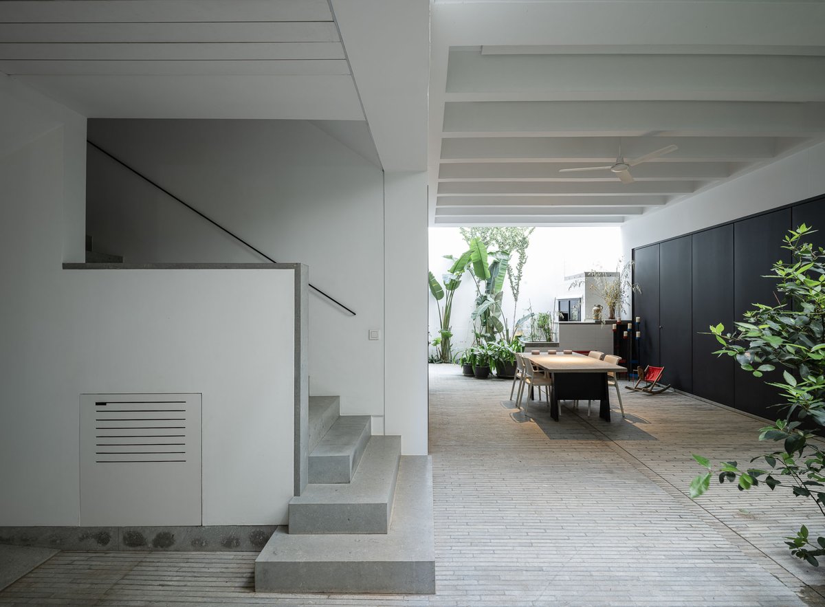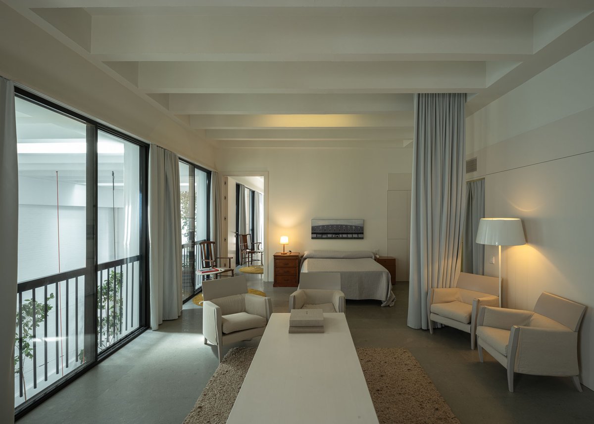 Cruz y Ortiz ArquitectosVivienda en el centro histórico de Sevilla, en un solar muy profundo y con muy poca fachada, organizada en tres plantas y vinculada a una secuencia de patios que garantizan iluminación y ventilación. Se mantiene la fachada existente por exigencias de las ordenanzas mientras que el resto del edificio se ejecuta de nueva planta. En planta baja se sitúan el acceso y las estancias ligadas al patio desde la calle. La casa se prolonga hacia un segundo patio interior y se alcanza, al fondo, un tercer patio más reducido. A lo largo del solar, se ubica una piscina interior. La planta primera reúne cuatro dormitorios, distribuidos en torno a los patios para asegurar luz natural y ventilación cruzada. En la planta segunda se dispone una gran sala de estar con salida directa a la amplia terraza, la cocina y el dormitorio principal. Un sistema de toldos permite cubrir la sucesión de patios, controlando el soleamiento y mejorando el confort en las épocas más cálidas. La estructura se resuelve con muros y losas de hormigón. La gama de materiales es reducida, hormigón visto pintado de blanco y pavimentos en piedra gris. La profundidad del solar se hace evidente en casi cualquier punto del edificio.