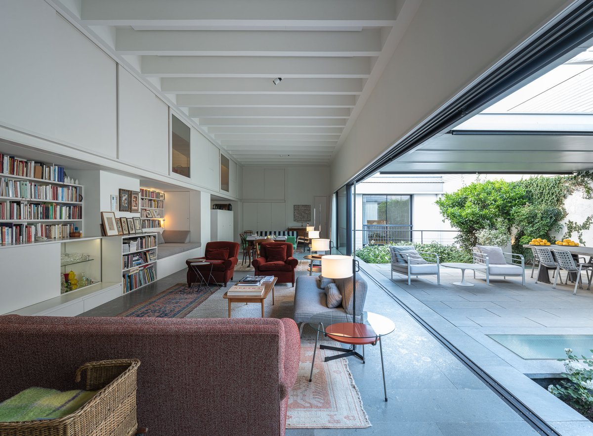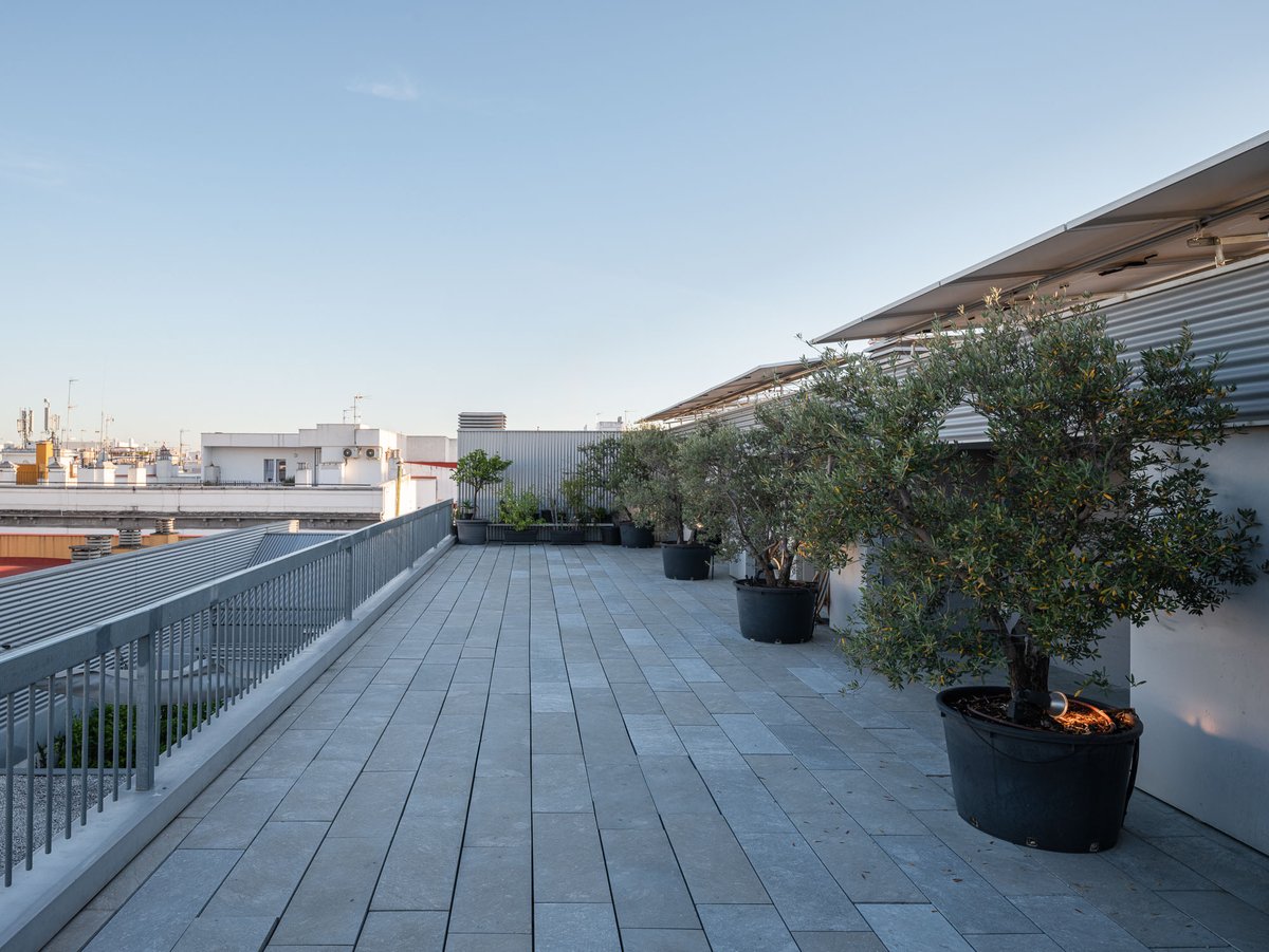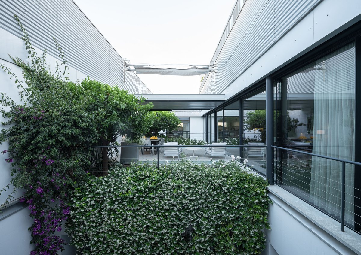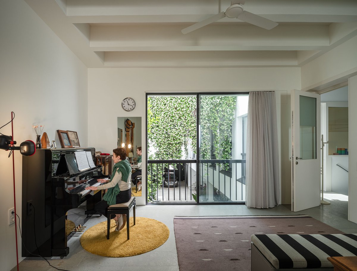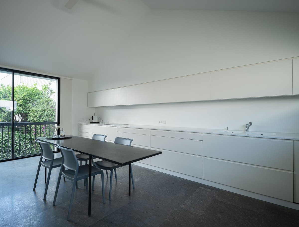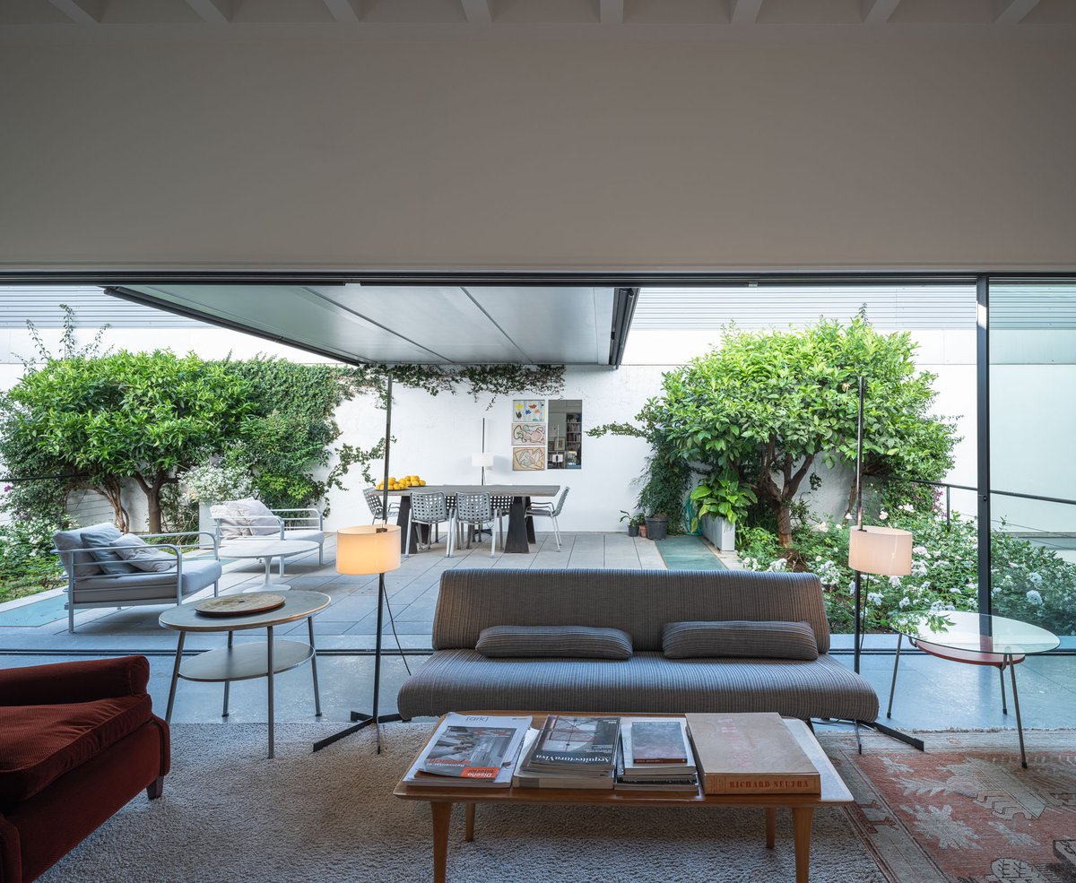Cruz y Ortiz ArquitectosVivienda en el centro histórico de Sevilla, en un solar muy profundo y con muy poca fachada, organizada en tres plantas y vinculada a una secuencia de patios que garantizan iluminación y ventilación. Se mantiene la fachada existente por exigencias de las ordenanzas mientras que el resto del edificio se ejecuta de nueva planta. En planta baja se sitúan el acceso y las estancias ligadas al patio desde la calle. La casa se prolonga hacia un segundo patio interior y se alcanza, al fondo, un tercer patio más reducido. A lo largo del solar, se ubica una piscina interior. La planta primera reúne cuatro dormitorios, distribuidos en torno a los patios para asegurar luz natural y ventilación cruzada. En la planta segunda se dispone una gran sala de estar con salida directa a la amplia terraza, la cocina y el dormitorio principal. Un sistema de toldos permite cubrir la sucesión de patios, controlando el soleamiento y mejorando el confort en las épocas más cálidas. La estructura se resuelve con muros y losas de hormigón. La gama de materiales es reducida, hormigón visto pintado de blanco y pavimentos en piedra gris. La profundidad del solar se hace evidente en casi cualquier punto del edificio.