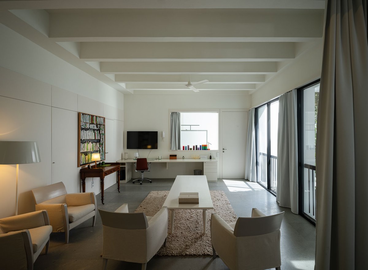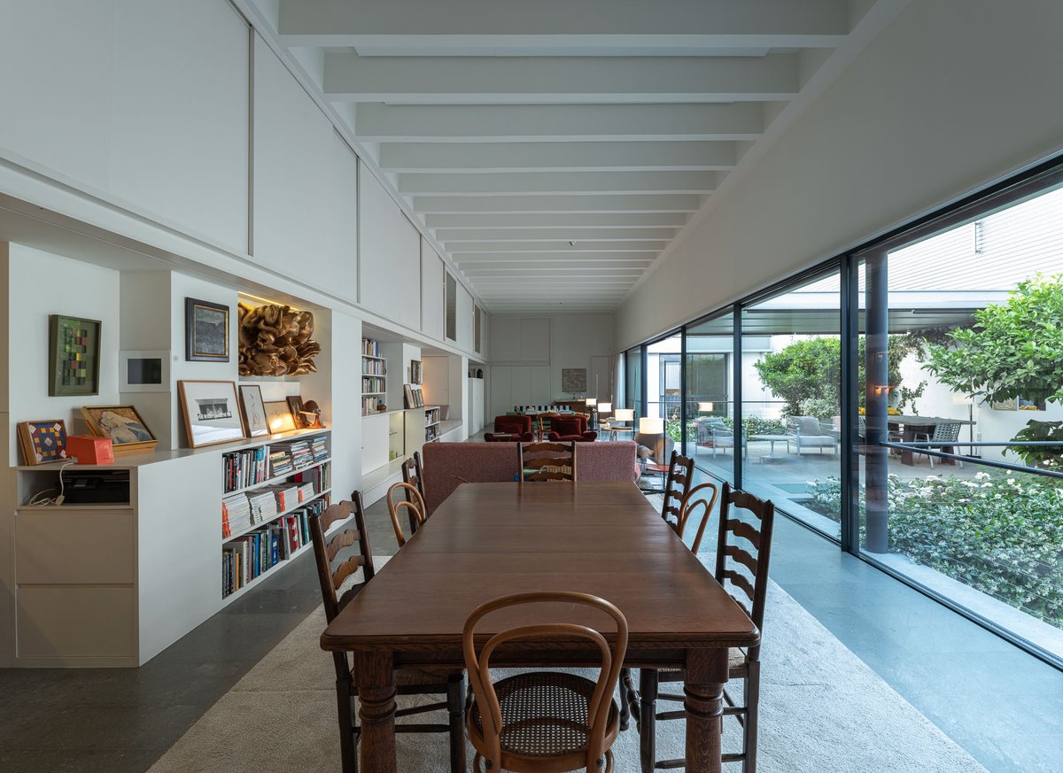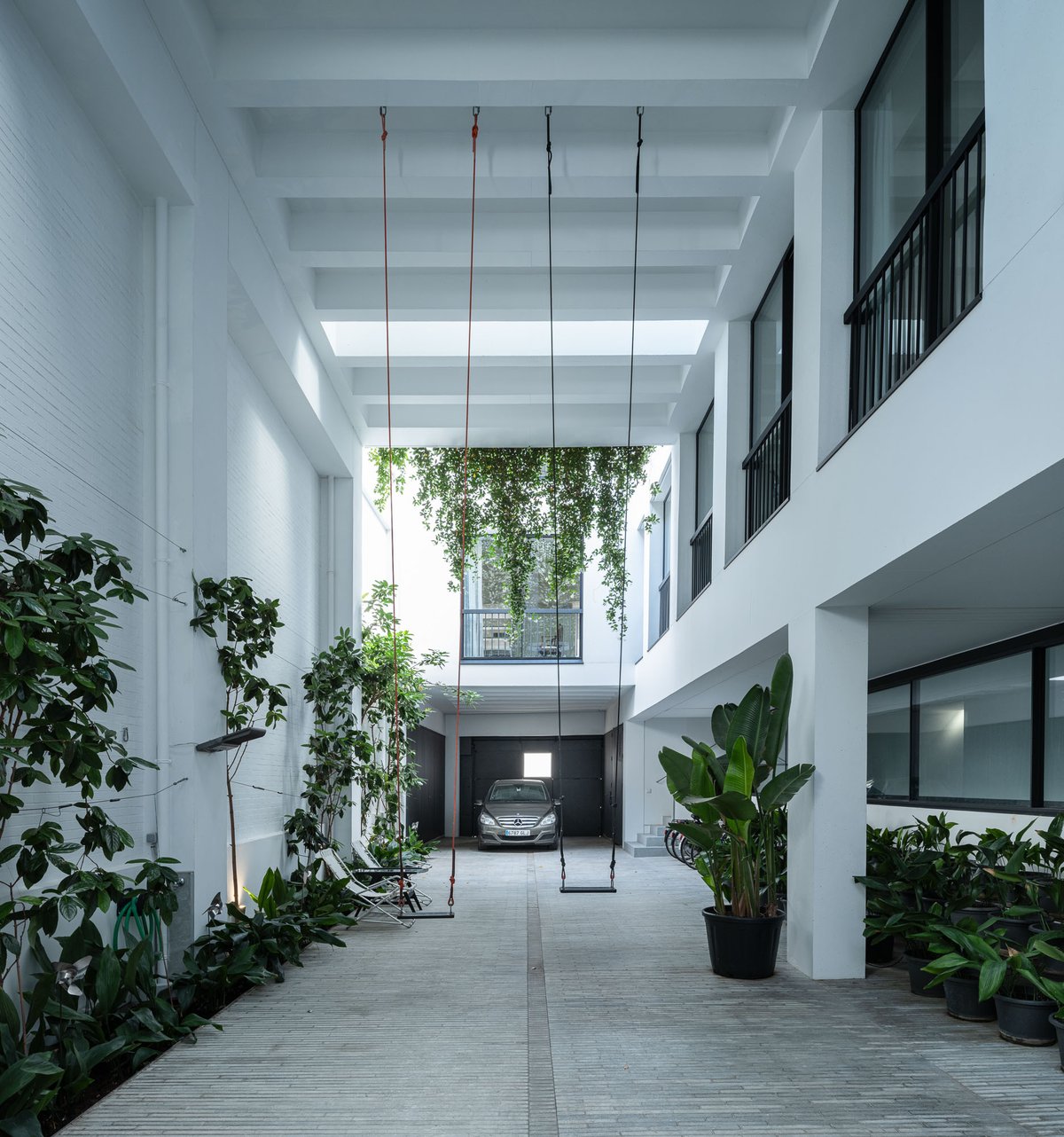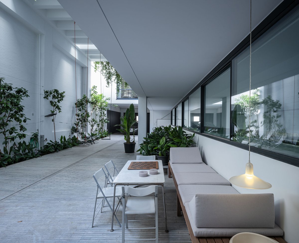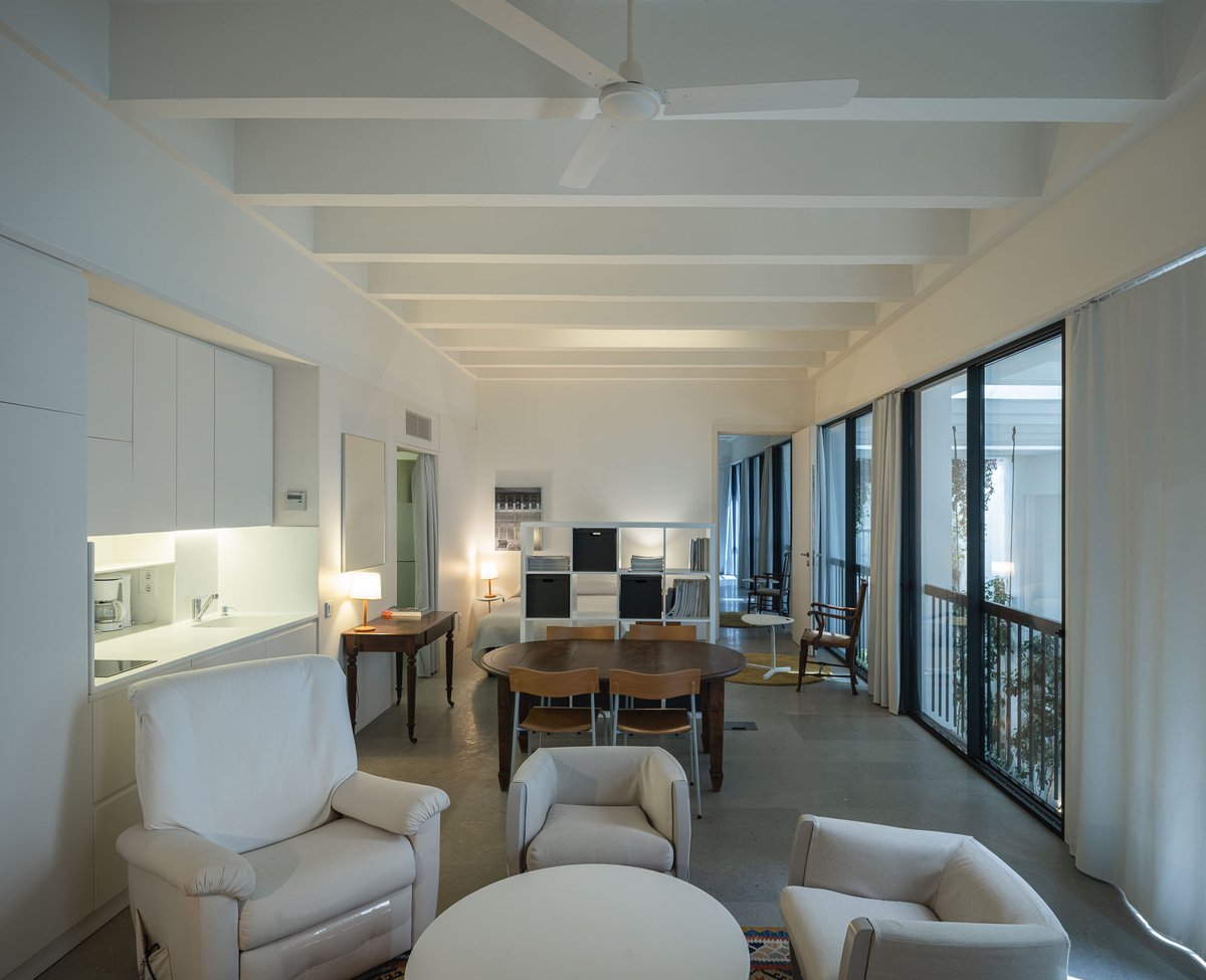 Cruz y Ortiz ArquitectosVivienda en el centro histórico de Sevilla, en un solar muy profundo y con muy poca fachada, organizada en tres plantas y vinculada a una secuencia de patios que garantizan iluminación y ventilación. Se mantiene la fachada existente por exigencias de las ordenanzas mientras que el resto del edificio se ejecuta de nueva planta. En planta baja se sitúan el acceso y las estancias ligadas al patio desde la calle. La casa se prolonga hacia un segundo patio interior y se alcanza, al fondo, un tercer patio más reducido. A lo largo del solar, se ubica una piscina interior. La planta primera reúne cuatro dormitorios, distribuidos en torno a los patios para asegurar luz natural y ventilación cruzada. En la planta segunda se dispone una gran sala de estar con salida directa a la amplia terraza, la cocina y el dormitorio principal. Un sistema de toldos permite cubrir la sucesión de patios, controlando el soleamiento y mejorando el confort en las épocas más cálidas. La estructura se resuelve con muros y losas de hormigón. La gama de materiales es reducida, hormigón visto pintado de blanco y pavimentos en piedra gris. La profundidad del solar se hace evidente en casi cualquier punto del edificio.
