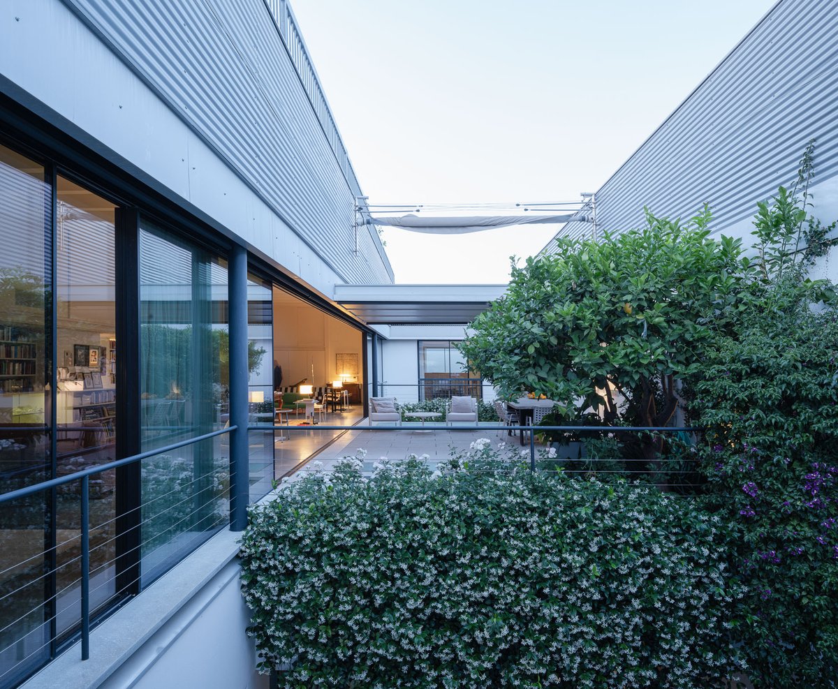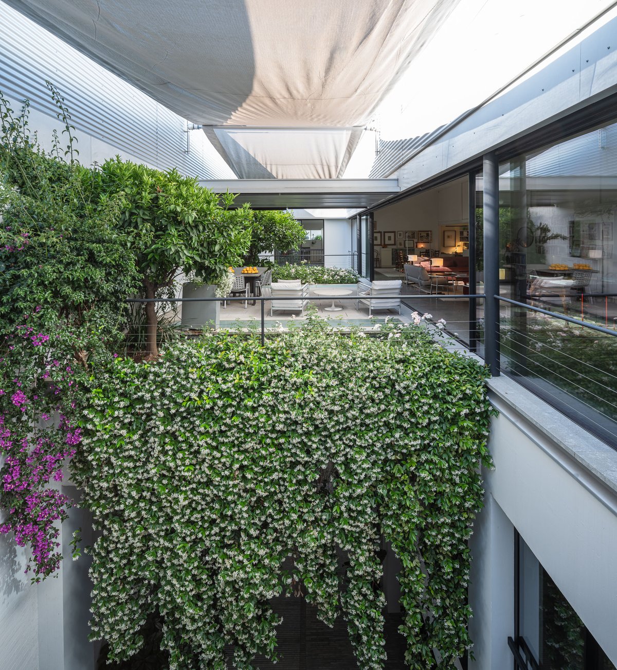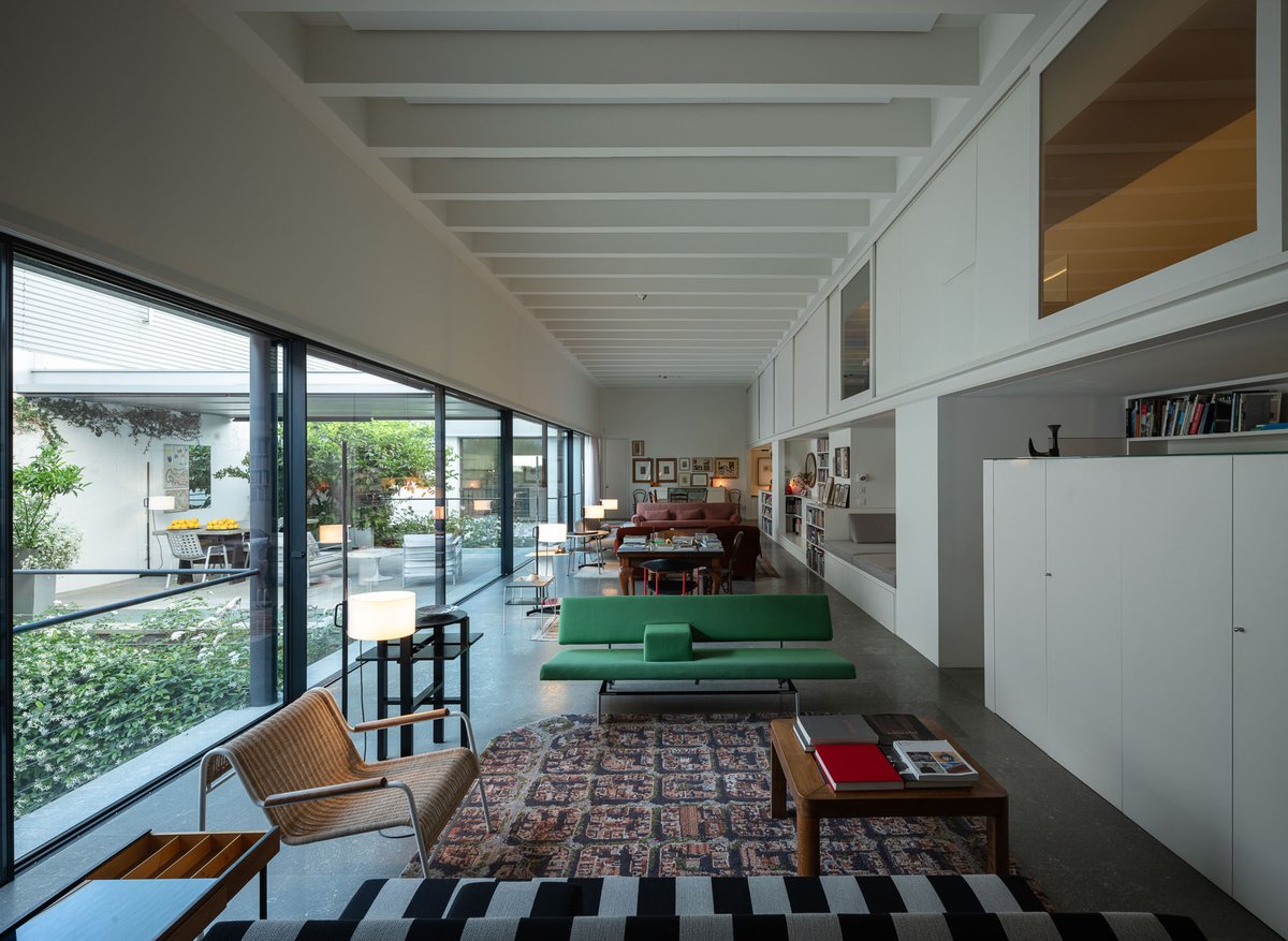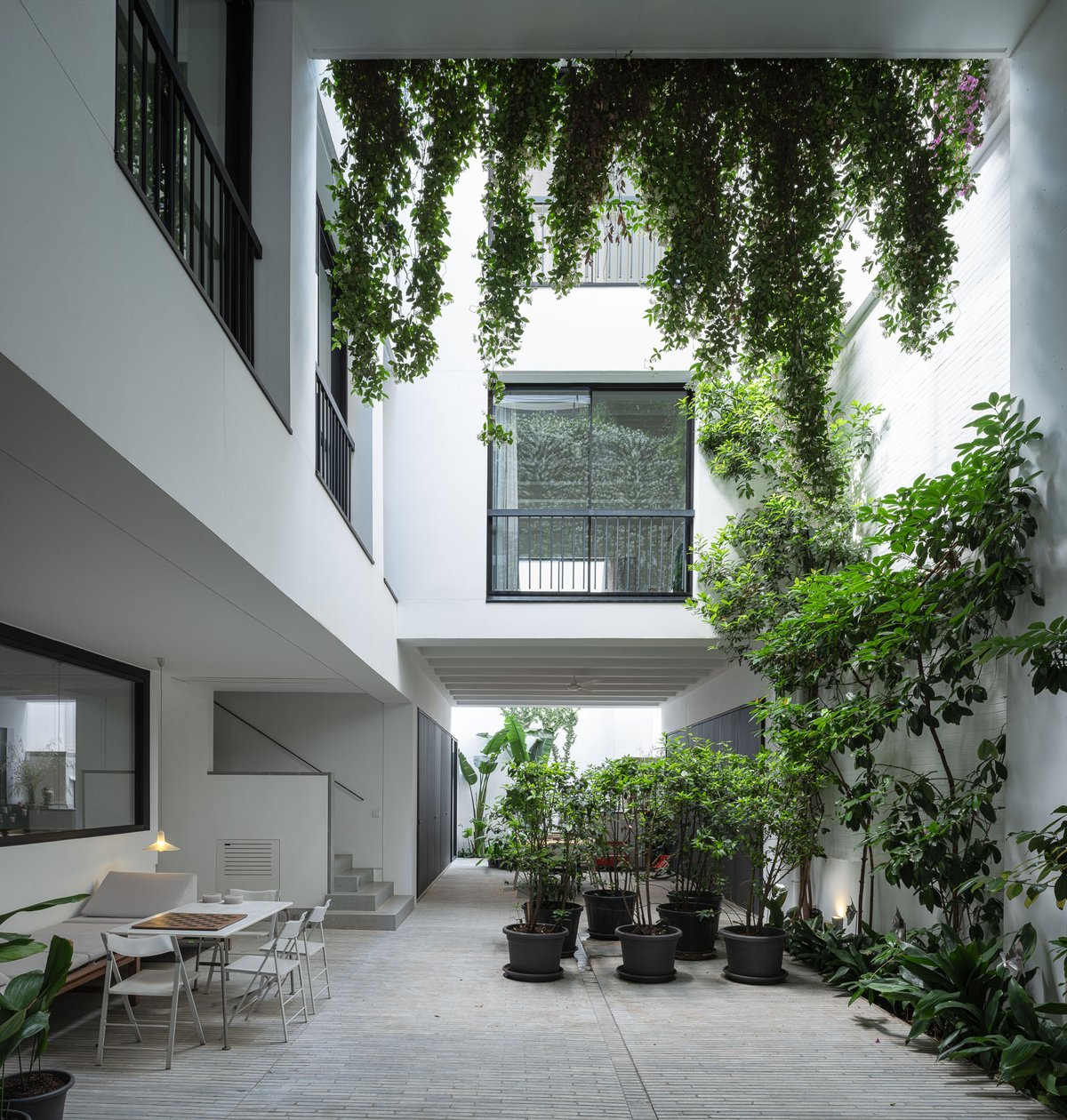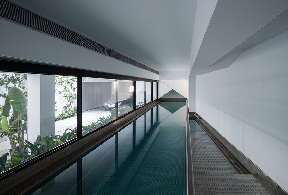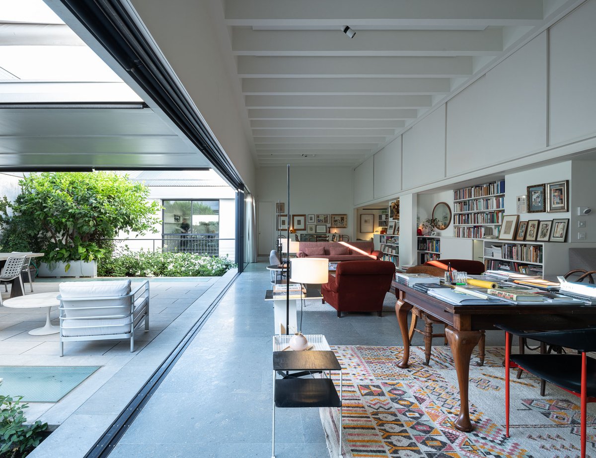 Cruz y Ortiz ArquitectosVivienda en el centro histórico de Sevilla, en un solar muy profundo y con muy poca fachada, organizada en tres plantas y vinculada a una secuencia de patios que garantizan iluminación y ventilación. Se mantiene la fachada existente por exigencias de las ordenanzas mientras que el resto del edificio se ejecuta de nueva planta. En planta baja se sitúan el acceso y las estancias ligadas al patio desde la calle. La casa se prolonga hacia un segundo patio interior y se alcanza, al fondo, un tercer patio más reducido. A lo largo del solar, se ubica una piscina interior. La planta primera reúne cuatro dormitorios, distribuidos en torno a los patios para asegurar luz natural y ventilación cruzada. En la planta segunda se dispone una gran sala de estar con salida directa a la amplia terraza, la cocina y el dormitorio principal. Un sistema de toldos permite cubrir la sucesión de patios, controlando el soleamiento y mejorando el confort en las épocas más cálidas. La estructura se resuelve con muros y losas de hormigón. La gama de materiales es reducida, hormigón visto pintado de blanco y pavimentos en piedra gris. La profundidad del solar se hace evidente en casi cualquier punto del edificio.