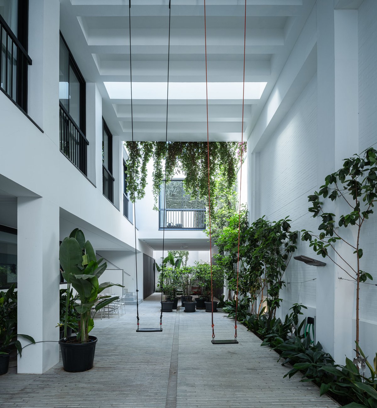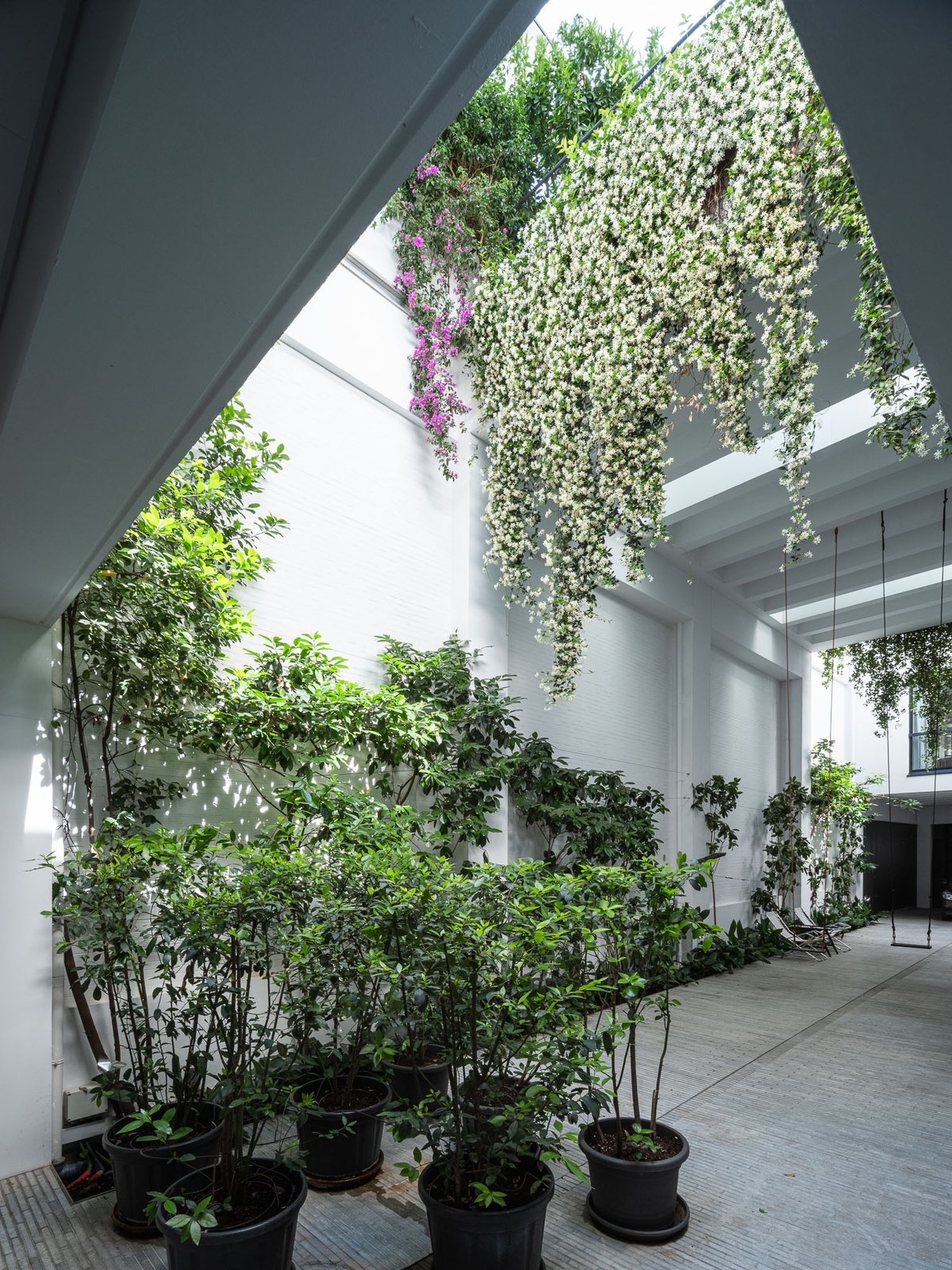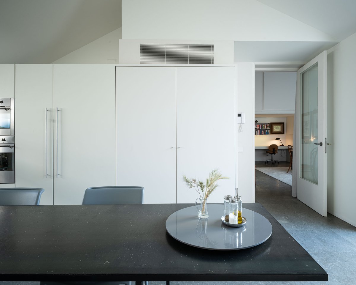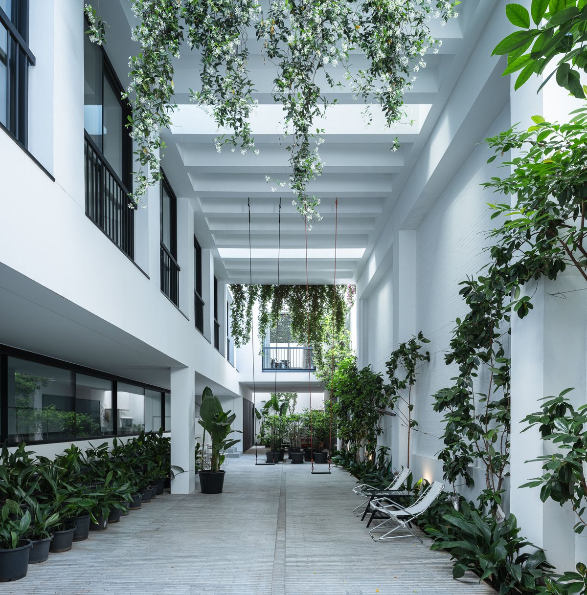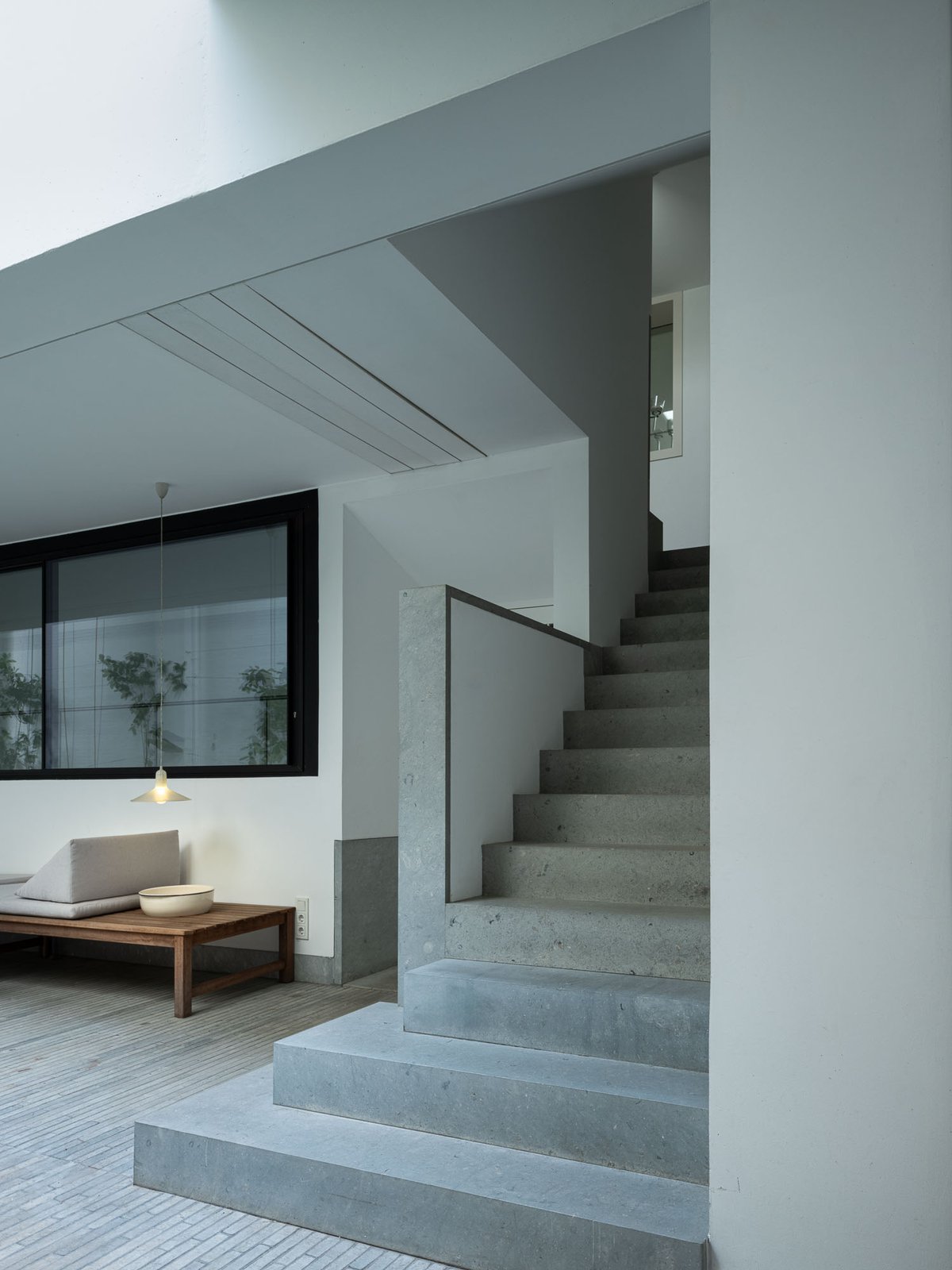 Cruz y Ortiz ArquitectosVivienda en el centro histórico de Sevilla, en un solar muy profundo y con muy poca fachada, organizada en tres plantas y vinculada a una secuencia de patios que garantizan iluminación y ventilación. Se mantiene la fachada existente por exigencias de las ordenanzas mientras que el resto del edificio se ejecuta de nueva planta. En planta baja se sitúan el acceso y las estancias ligadas al patio desde la calle. La casa se prolonga hacia un segundo patio interior y se alcanza, al fondo, un tercer patio más reducido. A lo largo del solar, se ubica una piscina interior. La planta primera reúne cuatro dormitorios, distribuidos en torno a los patios para asegurar luz natural y ventilación cruzada. En la planta segunda se dispone una gran sala de estar con salida directa a la amplia terraza, la cocina y el dormitorio principal. Un sistema de toldos permite cubrir la sucesión de patios, controlando el soleamiento y mejorando el confort en las épocas más cálidas. La estructura se resuelve con muros y losas de hormigón. La gama de materiales es reducida, hormigón visto pintado de blanco y pavimentos en piedra gris. La profundidad del solar se hace evidente en casi cualquier punto del edificio.